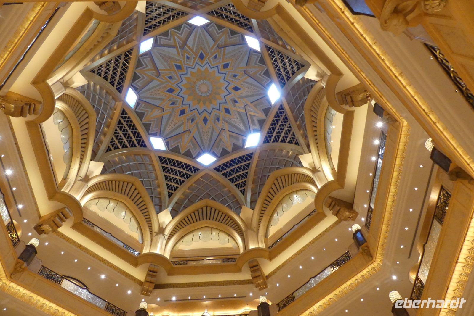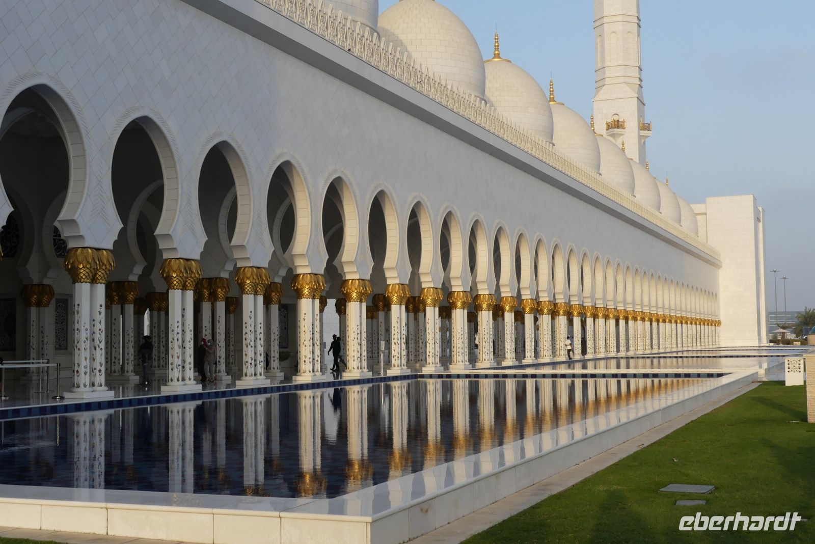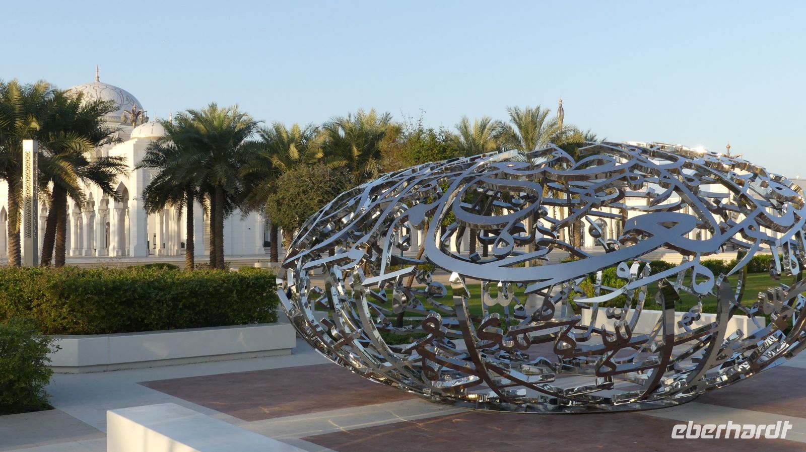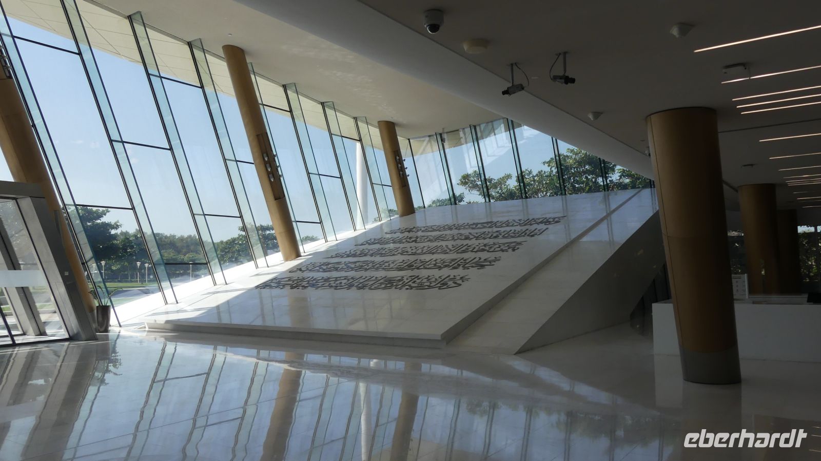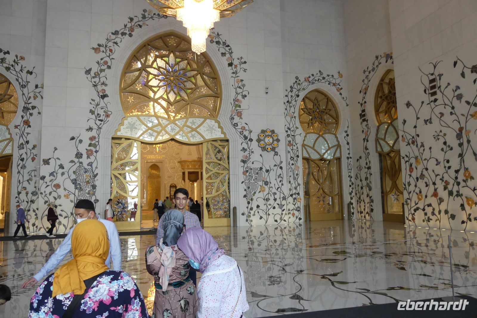 Wir haben offensichtlich in diesen Tagen dieses kleine Zeitfenster erwischt, in dem der Palast zwischen den Staatsbesuchen für normal Sterbliche seine Tore öffnet. So marschieren wir also als Touristen einfach mal so in den Präsidentenpalast der VAE! Worte zu finden, für die Architektur und den Prunk fällt mir schwer. Wir bewegen uns in Räumlichkeiten, die sonst nur Staatsgästen zugänglich sind. Wir sehen den riesigen Empfangssaal, die Sitzungsräume der hiesigen Herrscher (Majlis Bani Yas), die Bibliothek, eine begehbare Kalligraphie und den Bankettsaal. Drei Tage später werde ich zu Hause im Wohnzimmer vor dem Fernseher sitzen und in der Tagesschau erfahren, welcher Staatsgast am Wochenende nach Abu Dhabi gekommen ist.