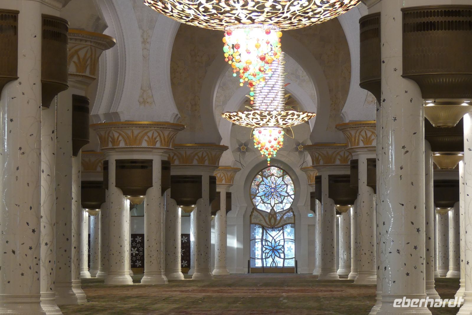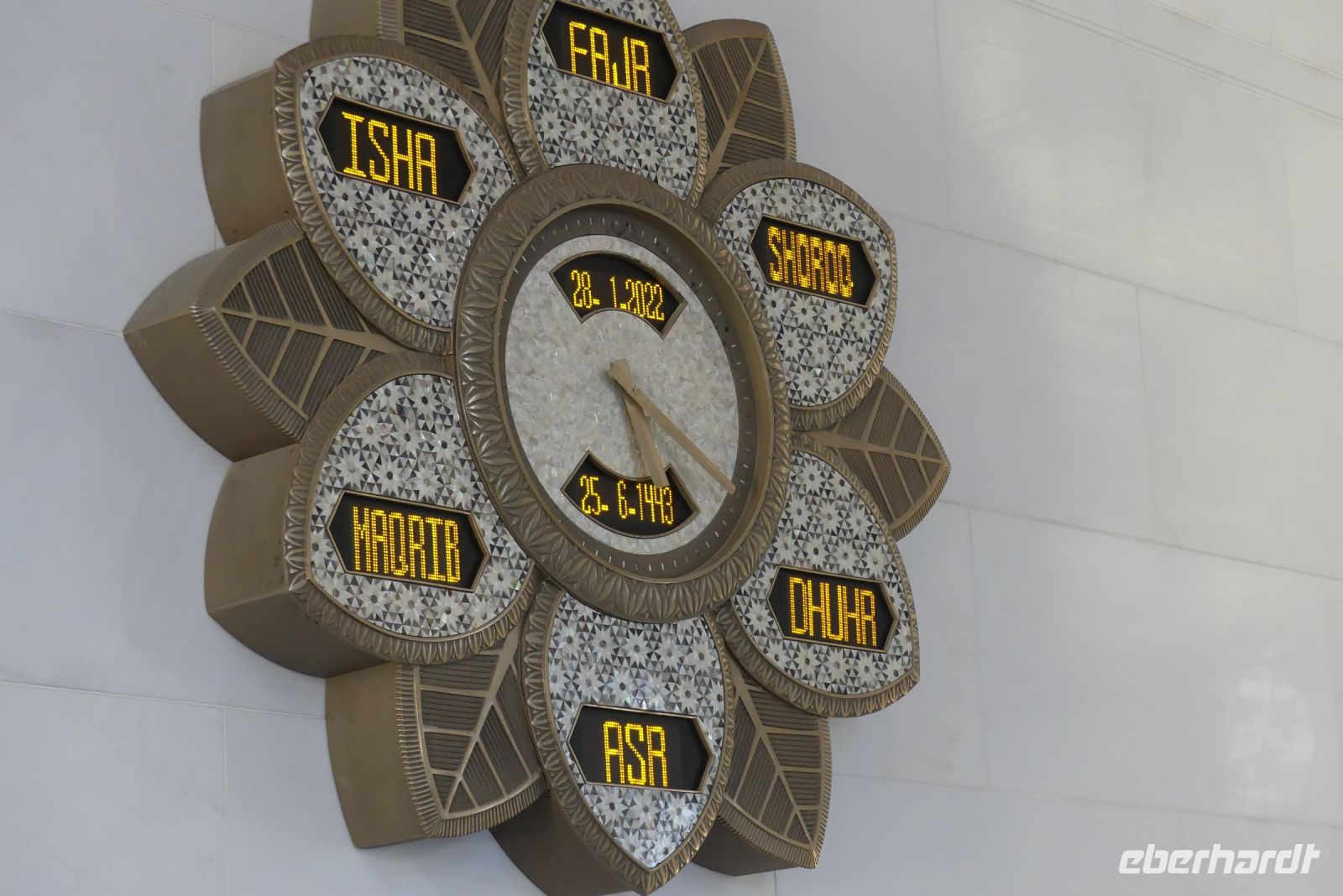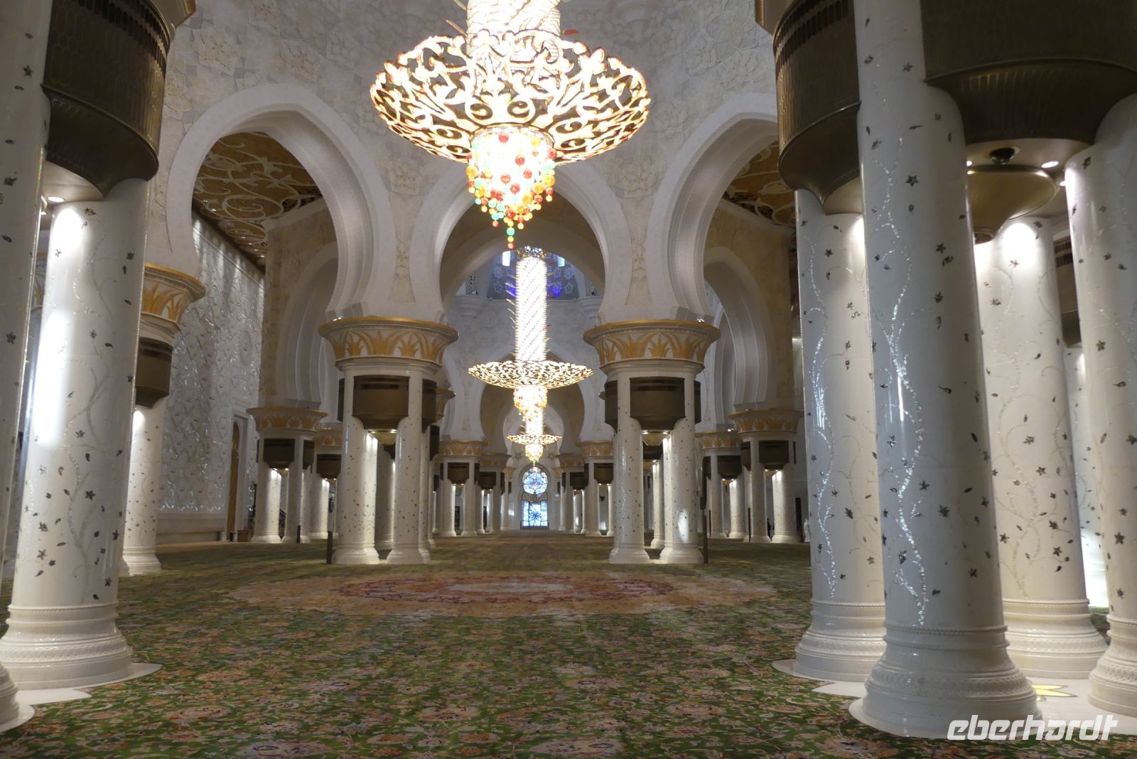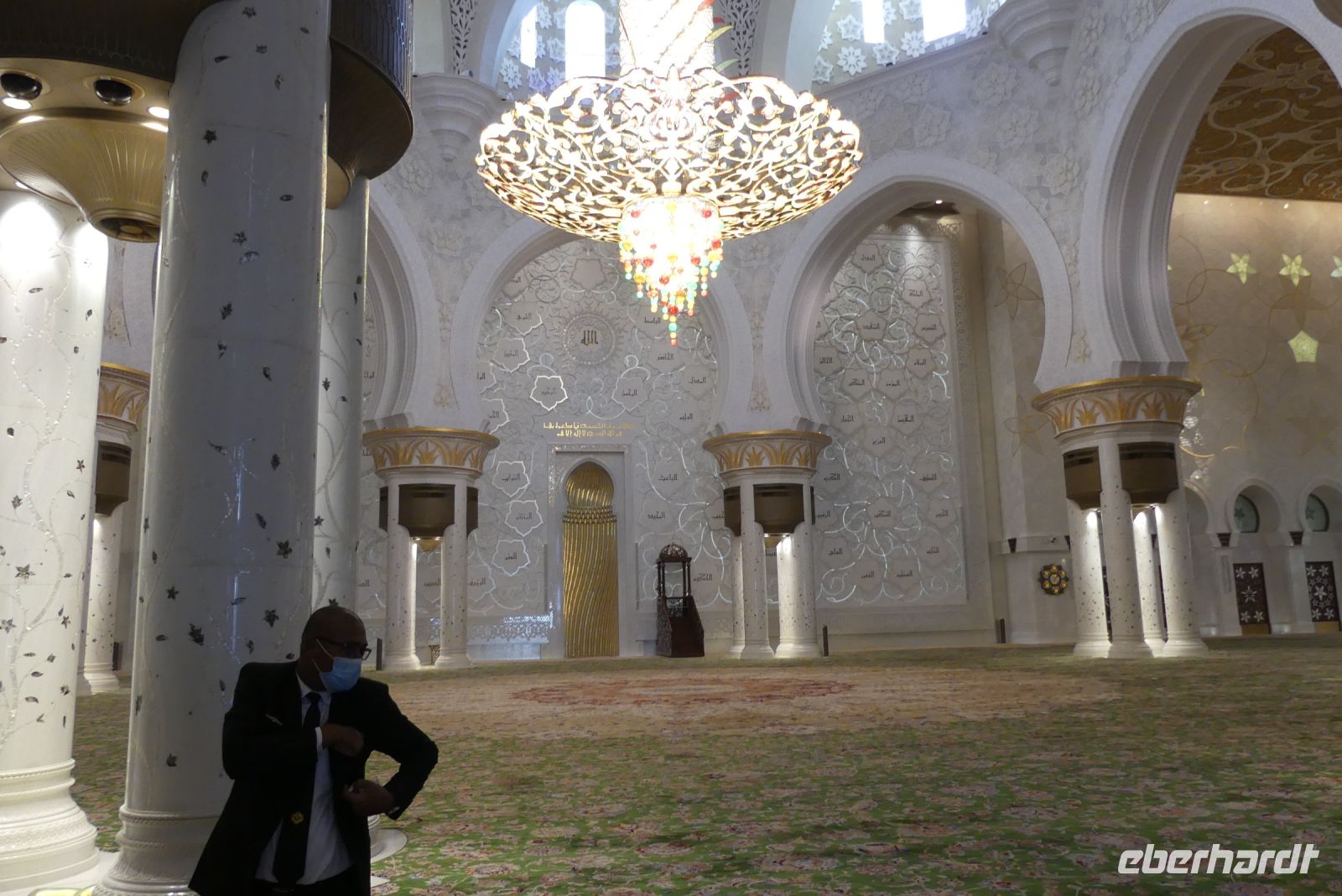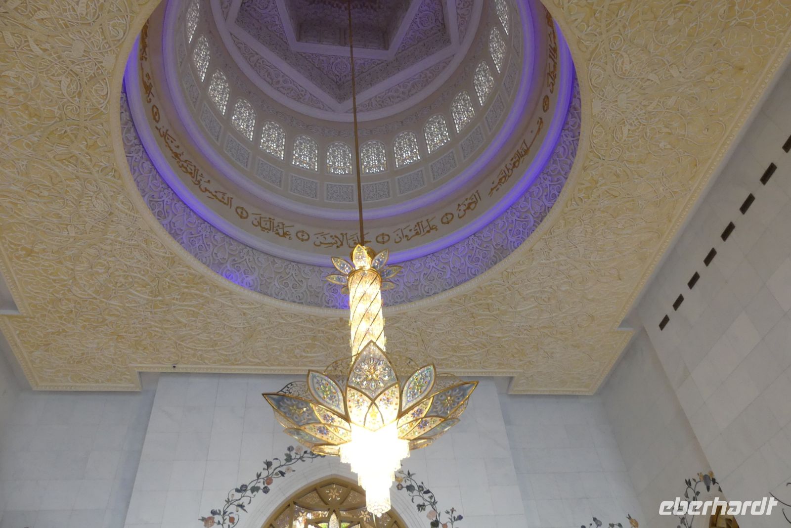 Wir haben offensichtlich in diesen Tagen dieses kleine Zeitfenster erwischt, in dem der Palast zwischen den Staatsbesuchen für normal Sterbliche seine Tore öffnet. So marschieren wir also als Touristen einfach mal so in den Präsidentenpalast der VAE! Worte zu finden, für die Architektur und den Prunk fällt mir schwer. Wir bewegen uns in Räumlichkeiten, die sonst nur Staatsgästen zugänglich sind. Wir sehen den riesigen Empfangssaal, die Sitzungsräume der hiesigen Herrscher (Majlis Bani Yas), die Bibliothek, eine begehbare Kalligraphie und den Bankettsaal. Drei Tage später werde ich zu Hause im Wohnzimmer vor dem Fernseher sitzen und in der Tagesschau erfahren, welcher Staatsgast am Wochenende nach Abu Dhabi gekommen ist.
