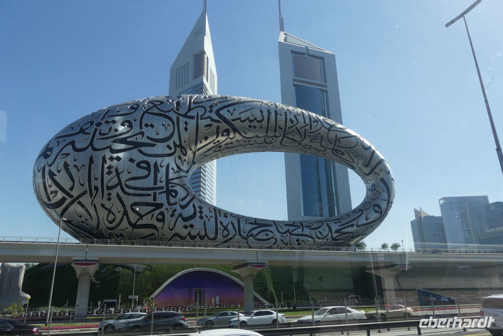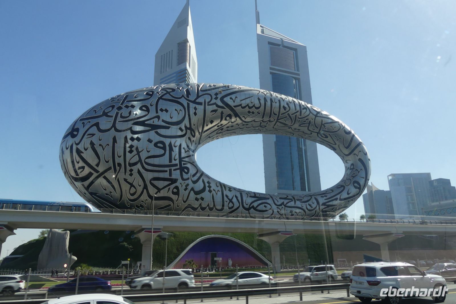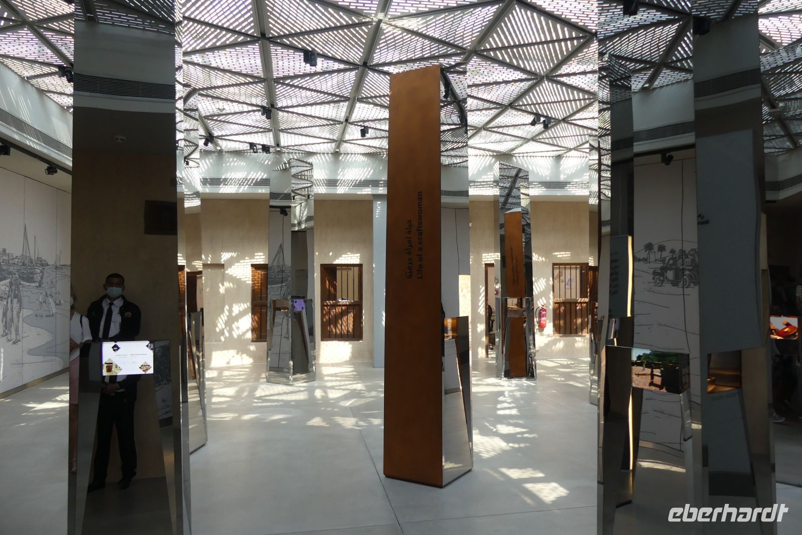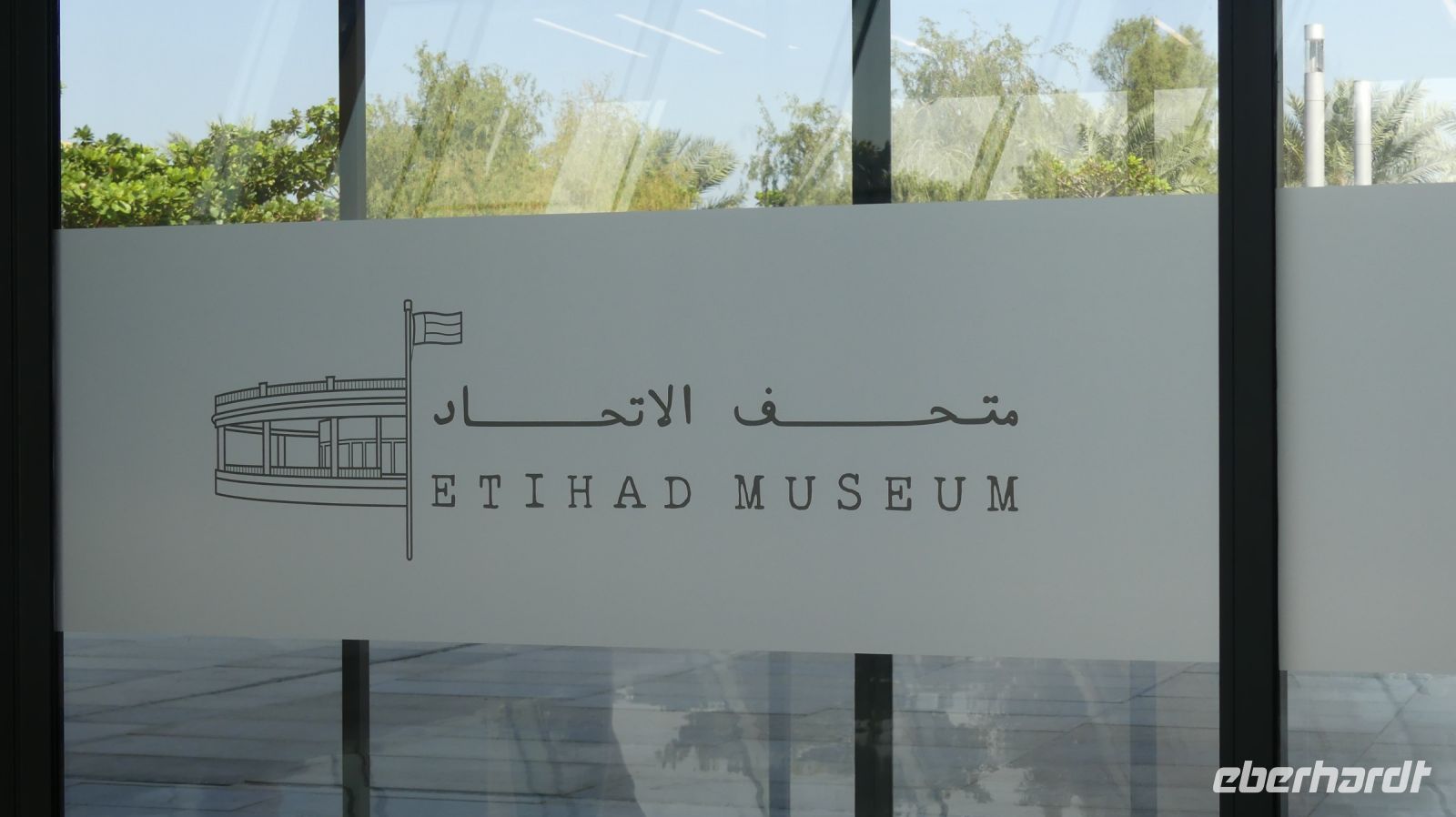 Als nächstes fahren wir zum Etihad Museum. Das architektonisch bemerkenswerte Gebäude wurde an jenem Ort errichtet, an dem am 2. Dezember 1971 der Zusammenschluss der sieben Emirate zu den Vereinigten Arabischen Emiraten erfolgte. Wasan, ich glaube so hieß unsere Museumsführerin, zeigt uns das Union House (Ort der Vertragsunterzeichnung), Empfangs- und Bankettsaal von Sheikh Rashid (1910 – 1990) sowie Teile des modernen Museums.