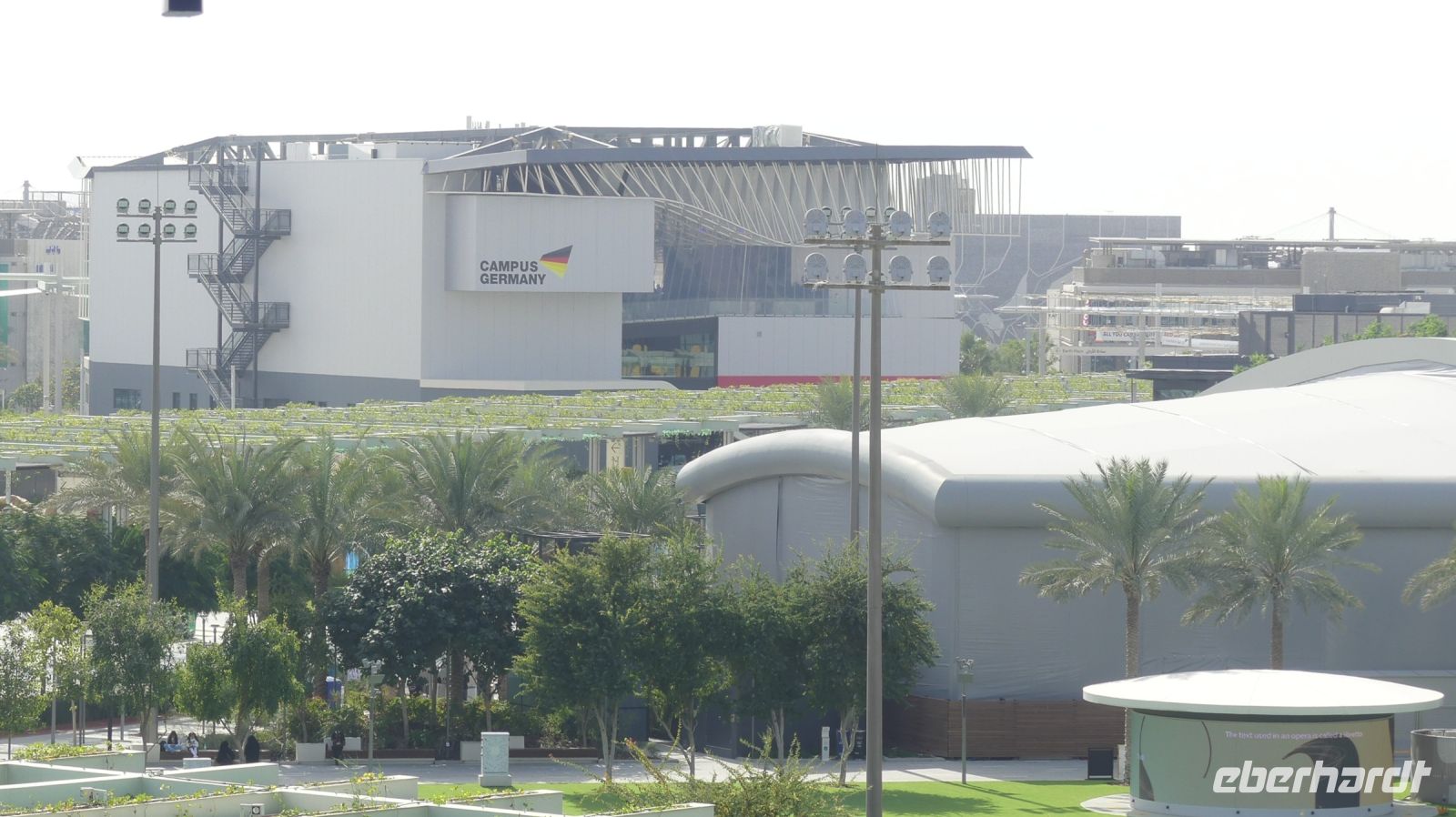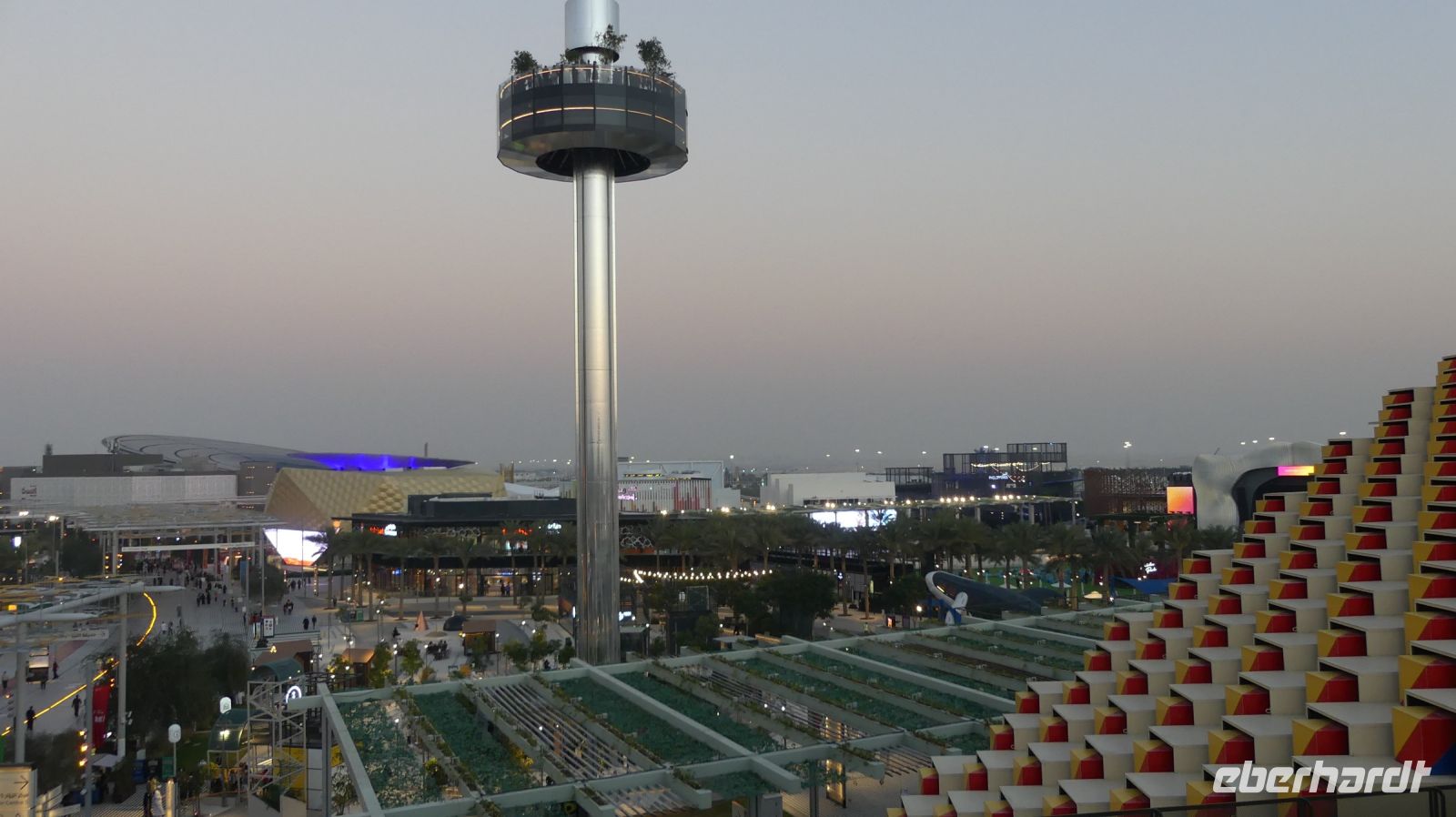 Zentraler Orientierungspunkt für uns ist der Deutsche Pavillon. Dieser erfreut sich allgemein großer Beliebtheit. Heute müsste man ca. eine Stunde Wartezeit einplanen. Die Meisten kommen zu Beginn für eine erste Orientierung mit mir zum „Garden in the Sky“, eine offene und rotierende Aussichtsplattform, die einen guten Ausblick auf das EXPO-Gelände bietet.