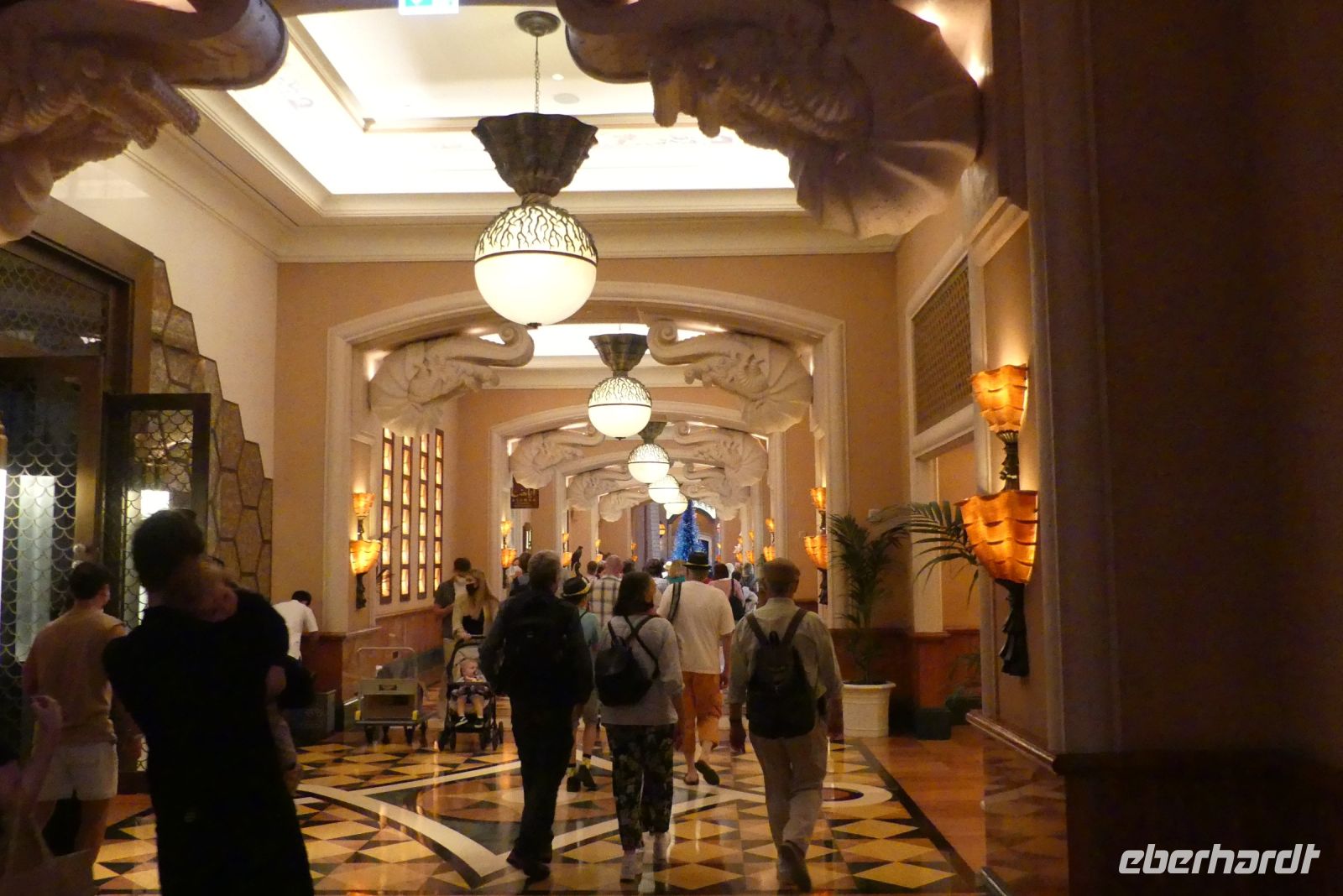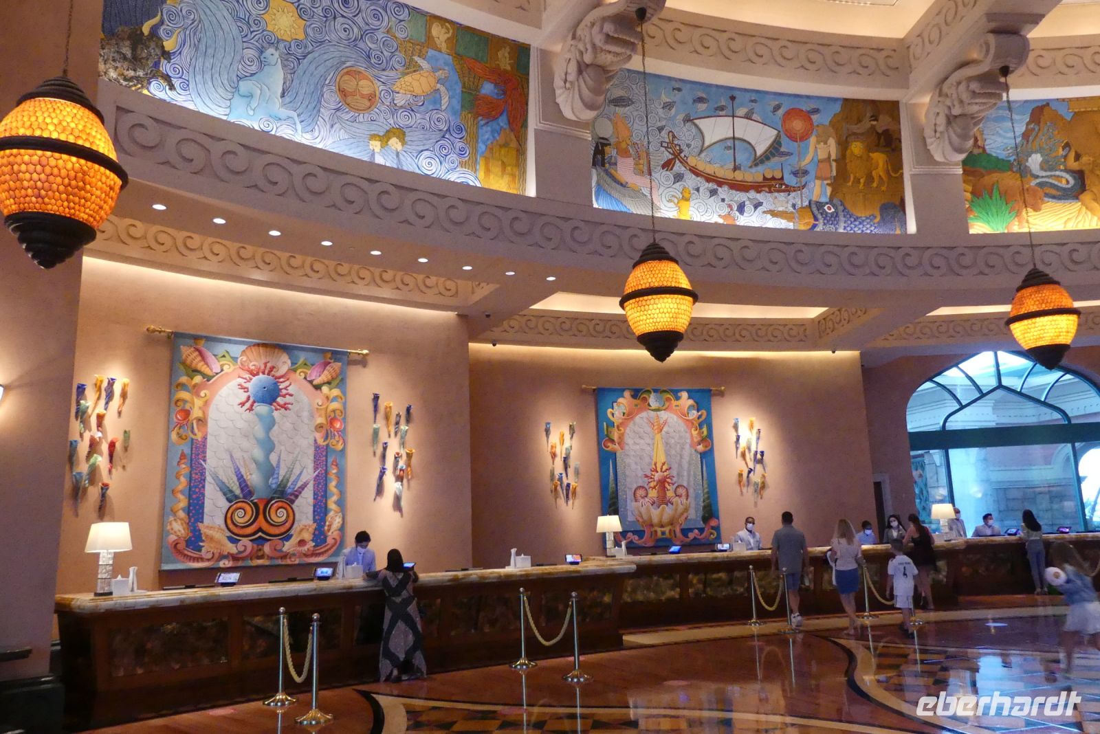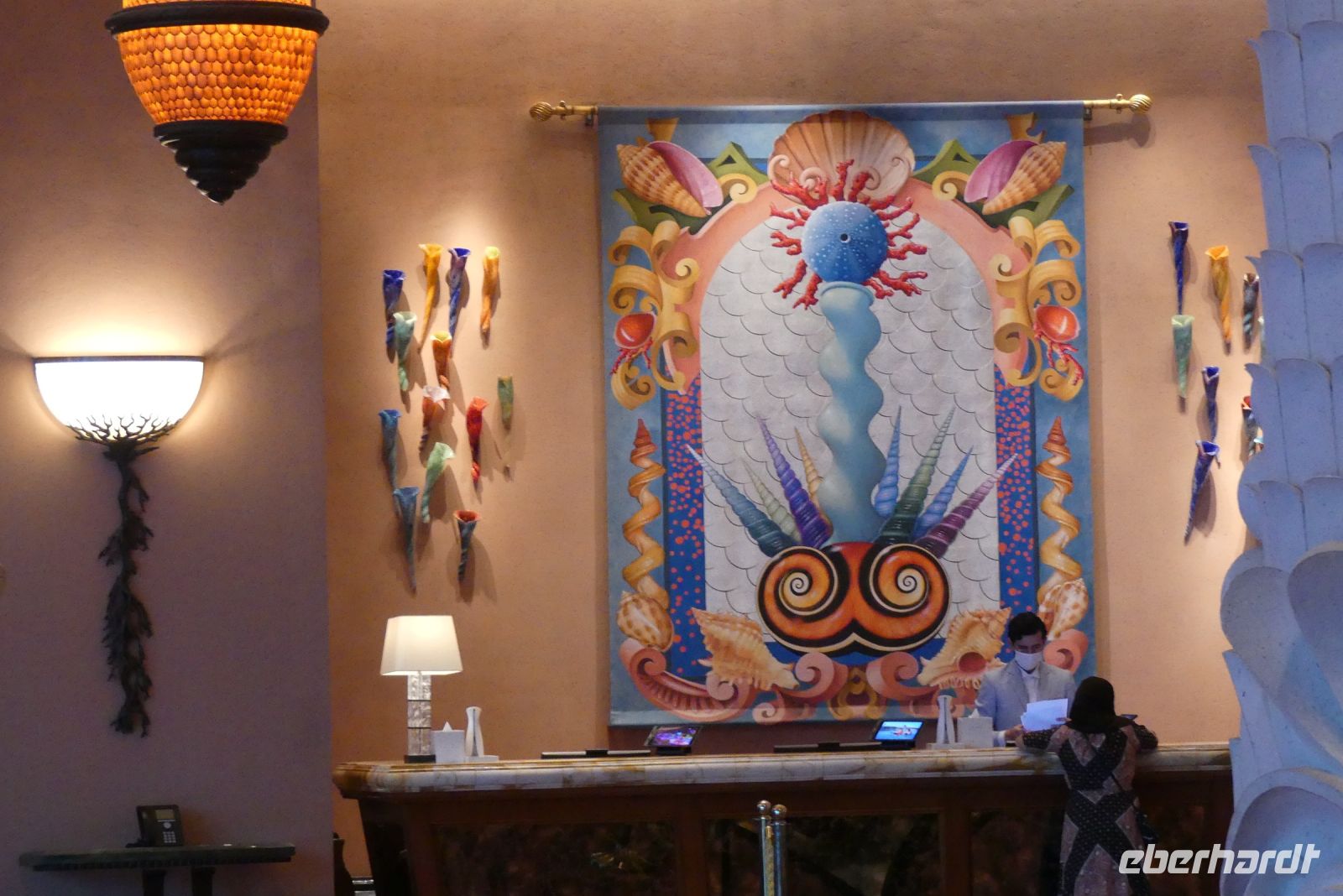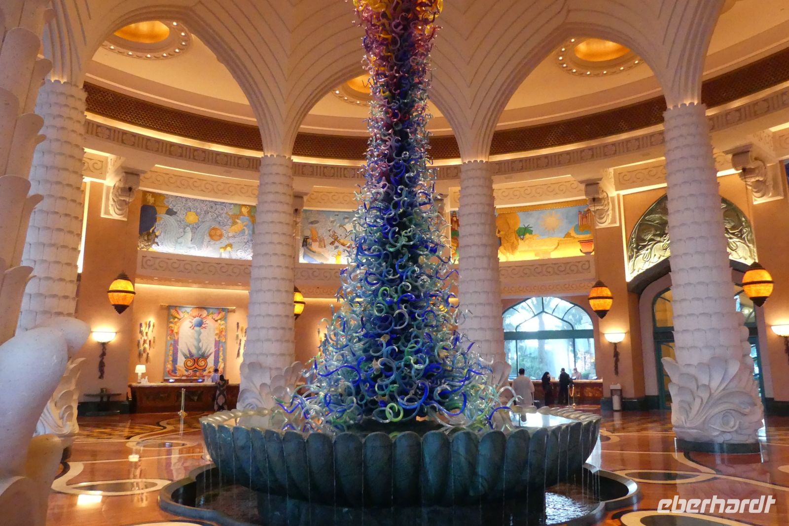 Auch der Lobbybereich des Hotels ist toll gestaltet. Beim Blick auf schöne Skulpturen und handgemalte Wand- und Deckengemälde taucht man bildlich in die Unterwasserwelt ein. Besonderer Blickfang ist ein zehn Meter hohes Kunstwerk von Dale Chihuly in der Mitte der Lobby. Es besteht aus 3.000 einzelnen farbigen und verschnörkelten Glaskörpern, welche Wasser und Feuer symbolisieren. Ibrahim meint, es soll 15 Mio Dollar gekostet haben. Das Motiv der sagenumwobenen, versunken geglaubten Stadt Atlantis setzt sich im gesamten Design des Hotels fort. Schließlich kommen wir zum Saffron Restaurant. Heute sind Meeresfrüchte das kulinarische Thema. Aber darüber hinaus gibt es ein vielfältiges Buffet. Auf der Terrasse genießen wir das außerordentlich schmackhafte Essen.