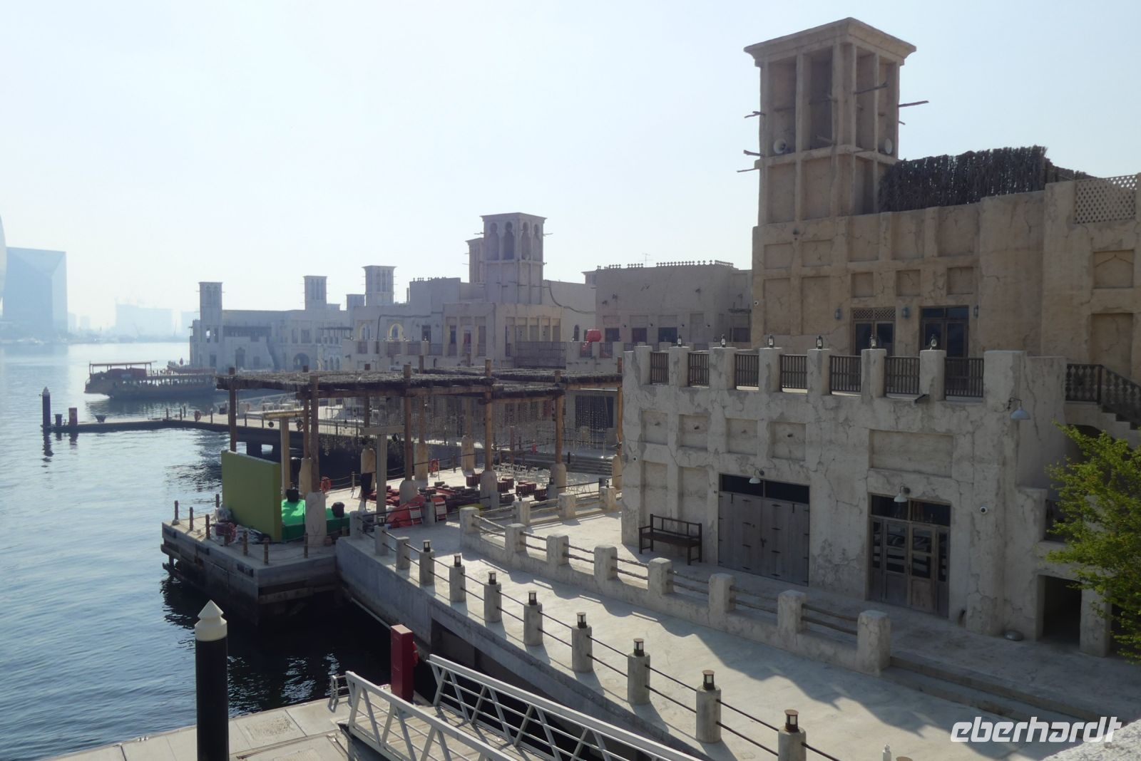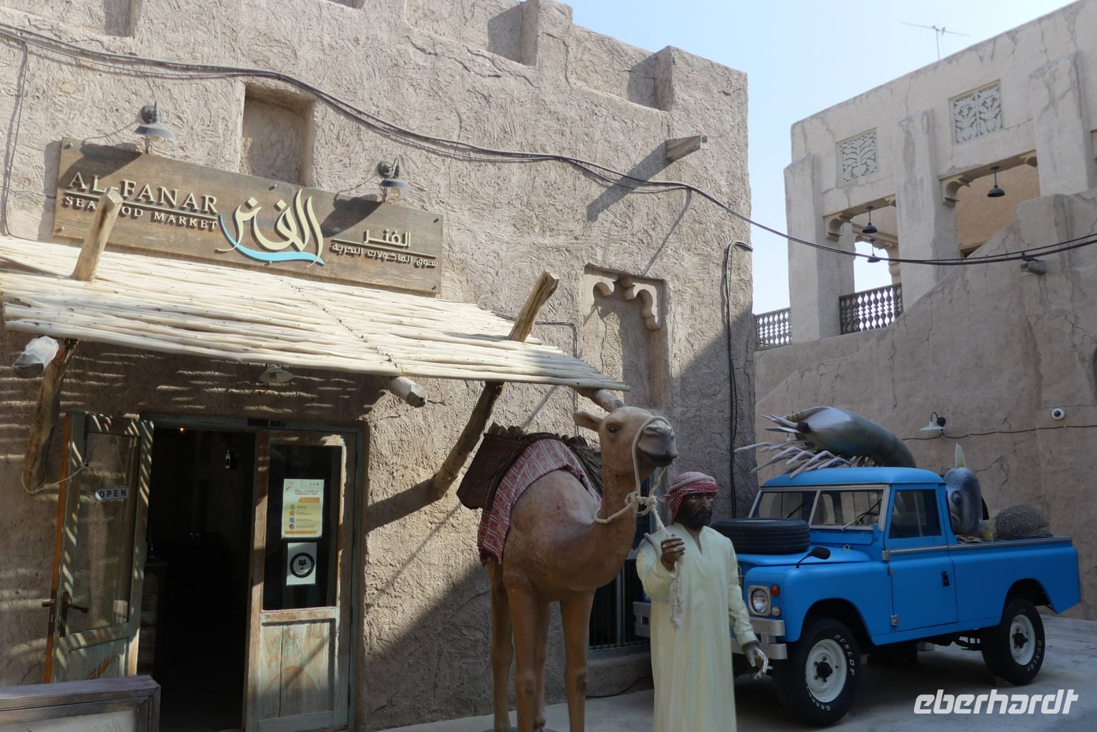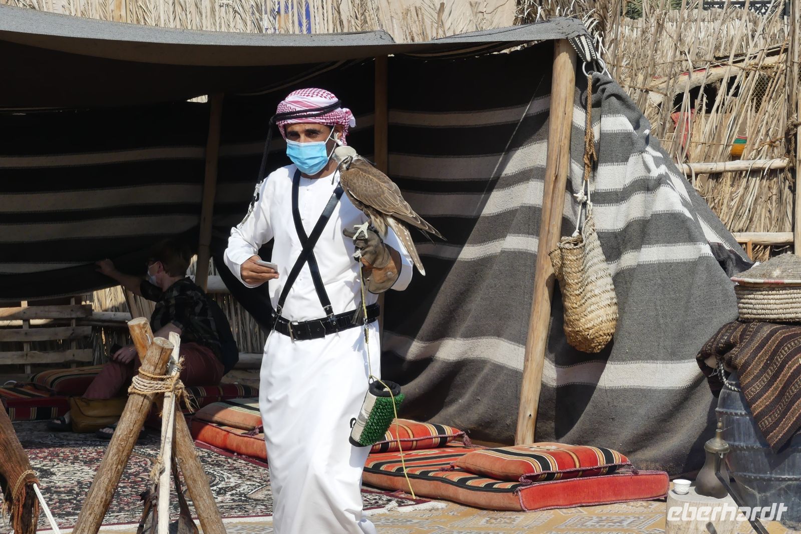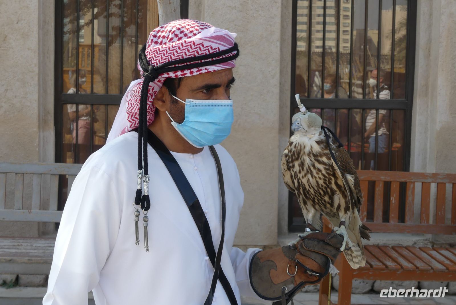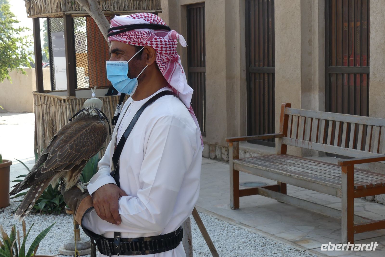 Am Morgen treffen wir Ibrahim am Creek. Hier ist mit „Al Seef“ eine neue Uferpromenade entstanden. Da wo einst Fischer und Perlentauscher ihre Hütten hatten, ist in den letzten Jahren diese Promenade entstanden, welche den historischen Charakter aufgreift und mit der Moderne verbindet. Viele Gebäude wurden im Stile der alten Windturmarchitektur errichtet. Darin befinden sich Geschäfte, Cafés, Restaurants… Die Gebäude sind so drei bis fünf Jahre alt, aber sind so perfekt mit scheinbar bröckelnden Fassaden, verrosteten Beschlägen u. ä. m. gestaltet, dass man sie gut und gern auf 100 Jahre schätzen könnte. Nebenan im echten historischen Viertel „Bastakiya“ kehren wir kurz ins „Bait Al Faaliyat“ ein. Bei arabischen Tee mit Datteln erfahren wir mehr über die orientalische Kaffeetradition. Noch erwähnen möchte ich den Mann mit dem Falken, der am Eingang des Viertels die Aufmerksamkeit auf sich zieht.