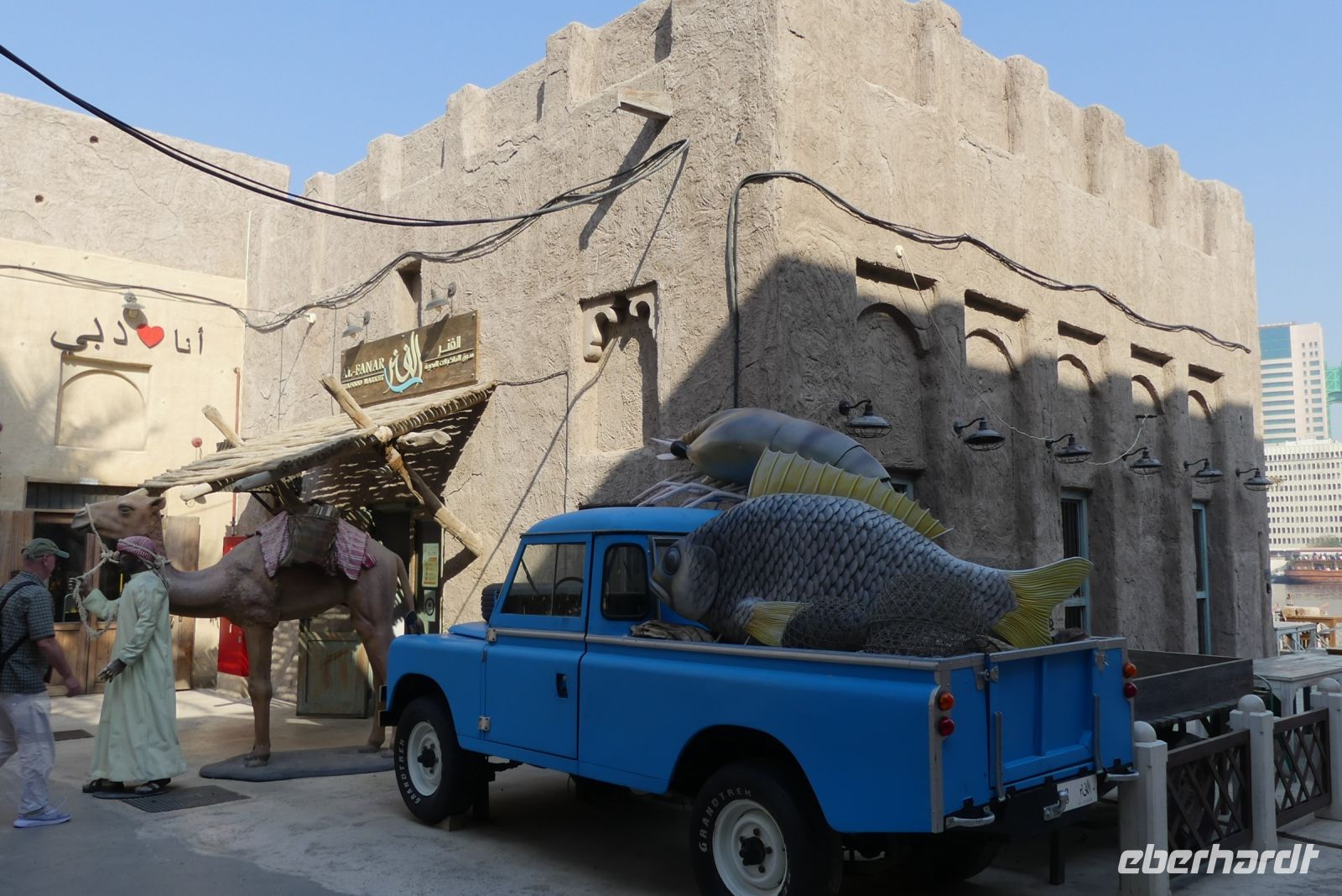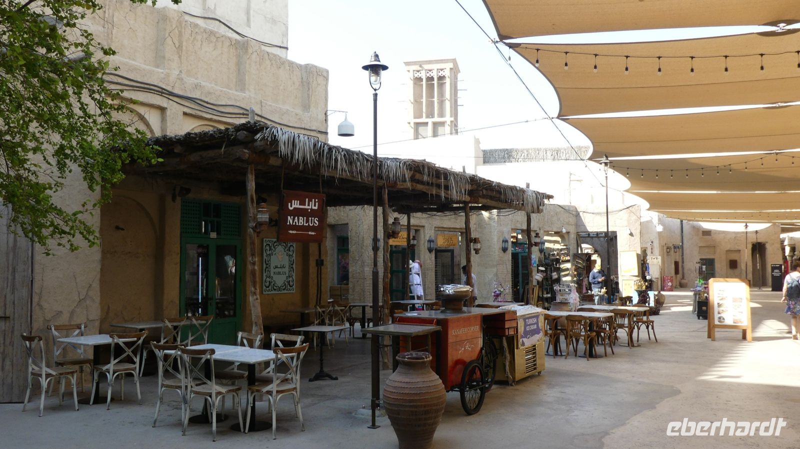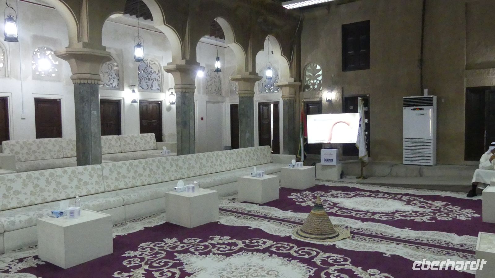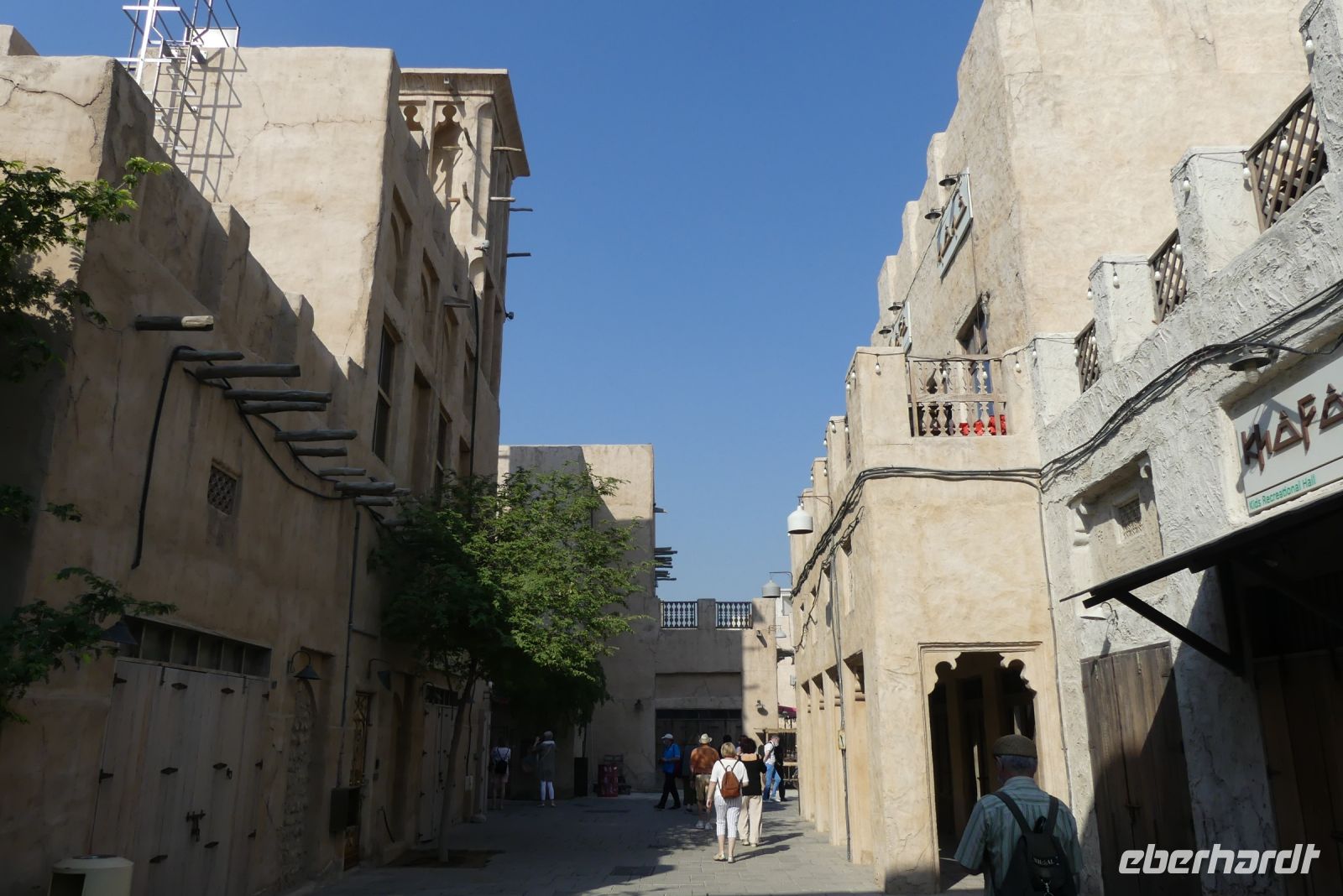 Am Morgen treffen wir Ibrahim am Creek. Hier ist mit „Al Seef“ eine neue Uferpromenade entstanden. Da wo einst Fischer und Perlentauscher ihre Hütten hatten, ist in den letzten Jahren diese Promenade entstanden, welche den historischen Charakter aufgreift und mit der Moderne verbindet. Viele Gebäude wurden im Stile der alten Windturmarchitektur errichtet. Darin befinden sich Geschäfte, Cafés, Restaurants… Die Gebäude sind so drei bis fünf Jahre alt, aber sind so perfekt mit scheinbar bröckelnden Fassaden, verrosteten Beschlägen u. ä. m. gestaltet, dass man sie gut und gern auf 100 Jahre schätzen könnte. Nebenan im echten historischen Viertel „Bastakiya“ kehren wir kurz ins „Bait Al Faaliyat“ ein. Bei arabischen Tee mit Datteln erfahren wir mehr über die orientalische Kaffeetradition. Noch erwähnen möchte ich den Mann mit dem Falken, der am Eingang des Viertels die Aufmerksamkeit auf sich zieht.