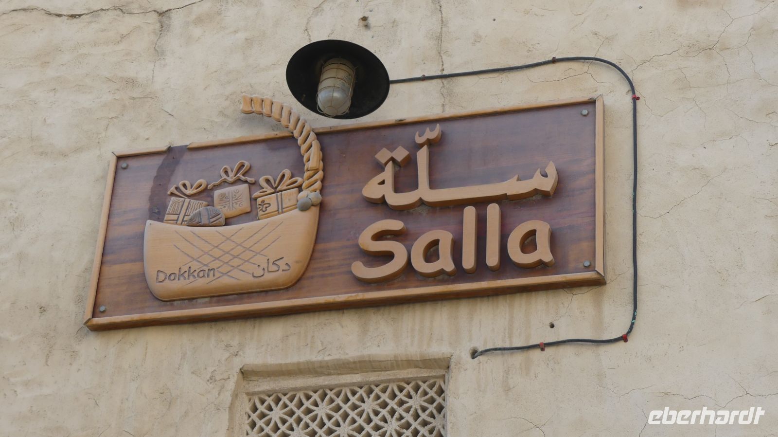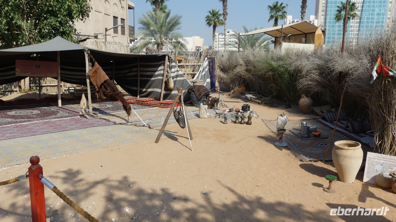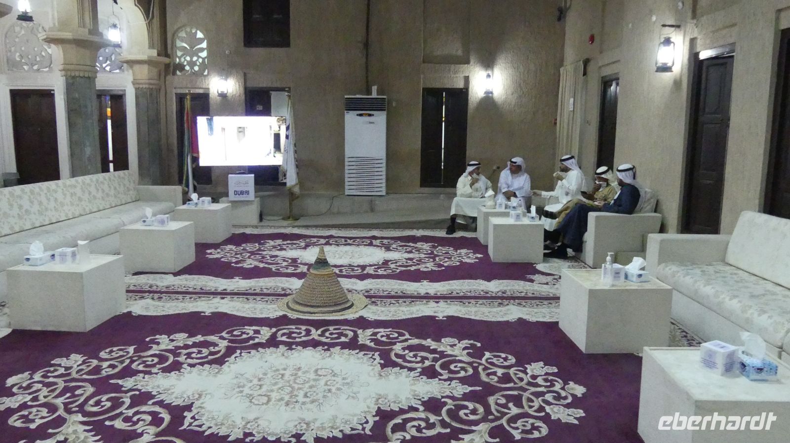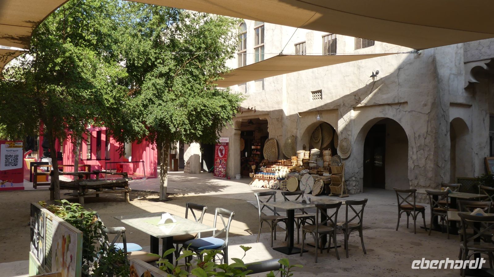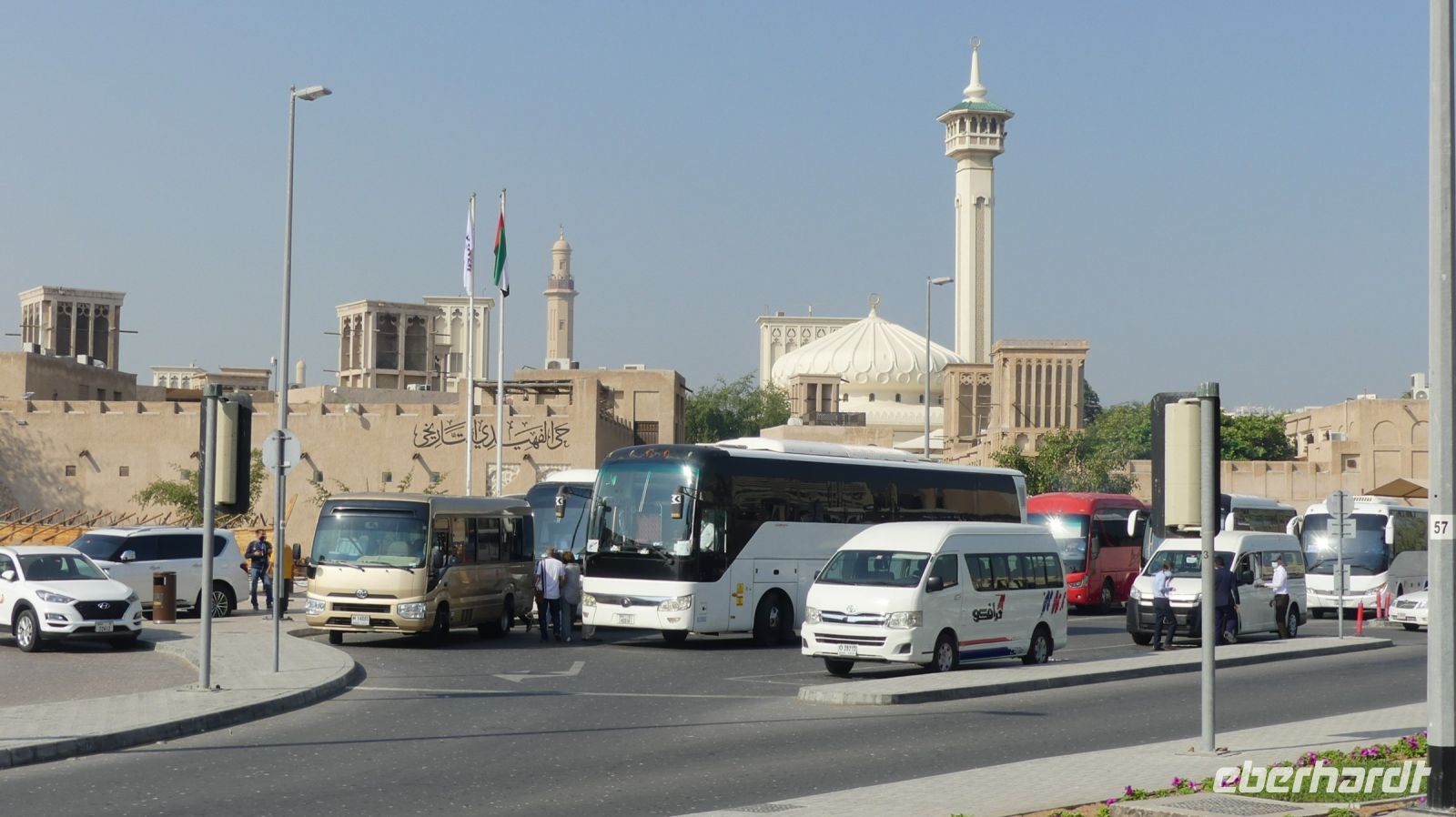 Am Morgen treffen wir Ibrahim am Creek. Hier ist mit „Al Seef“ eine neue Uferpromenade entstanden. Da wo einst Fischer und Perlentauscher ihre Hütten hatten, ist in den letzten Jahren diese Promenade entstanden, welche den historischen Charakter aufgreift und mit der Moderne verbindet. Viele Gebäude wurden im Stile der alten Windturmarchitektur errichtet. Darin befinden sich Geschäfte, Cafés, Restaurants… Die Gebäude sind so drei bis fünf Jahre alt, aber sind so perfekt mit scheinbar bröckelnden Fassaden, verrosteten Beschlägen u. ä. m. gestaltet, dass man sie gut und gern auf 100 Jahre schätzen könnte. Nebenan im echten historischen Viertel „Bastakiya“ kehren wir kurz ins „Bait Al Faaliyat“ ein. Bei arabischen Tee mit Datteln erfahren wir mehr über die orientalische Kaffeetradition. Noch erwähnen möchte ich den Mann mit dem Falken, der am Eingang des Viertels die Aufmerksamkeit auf sich zieht.