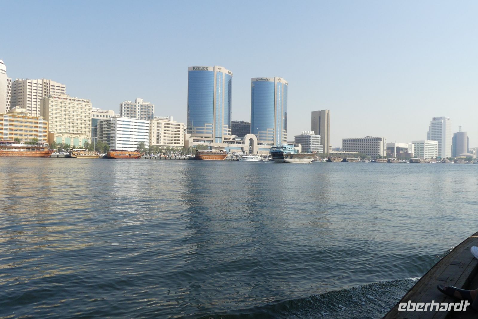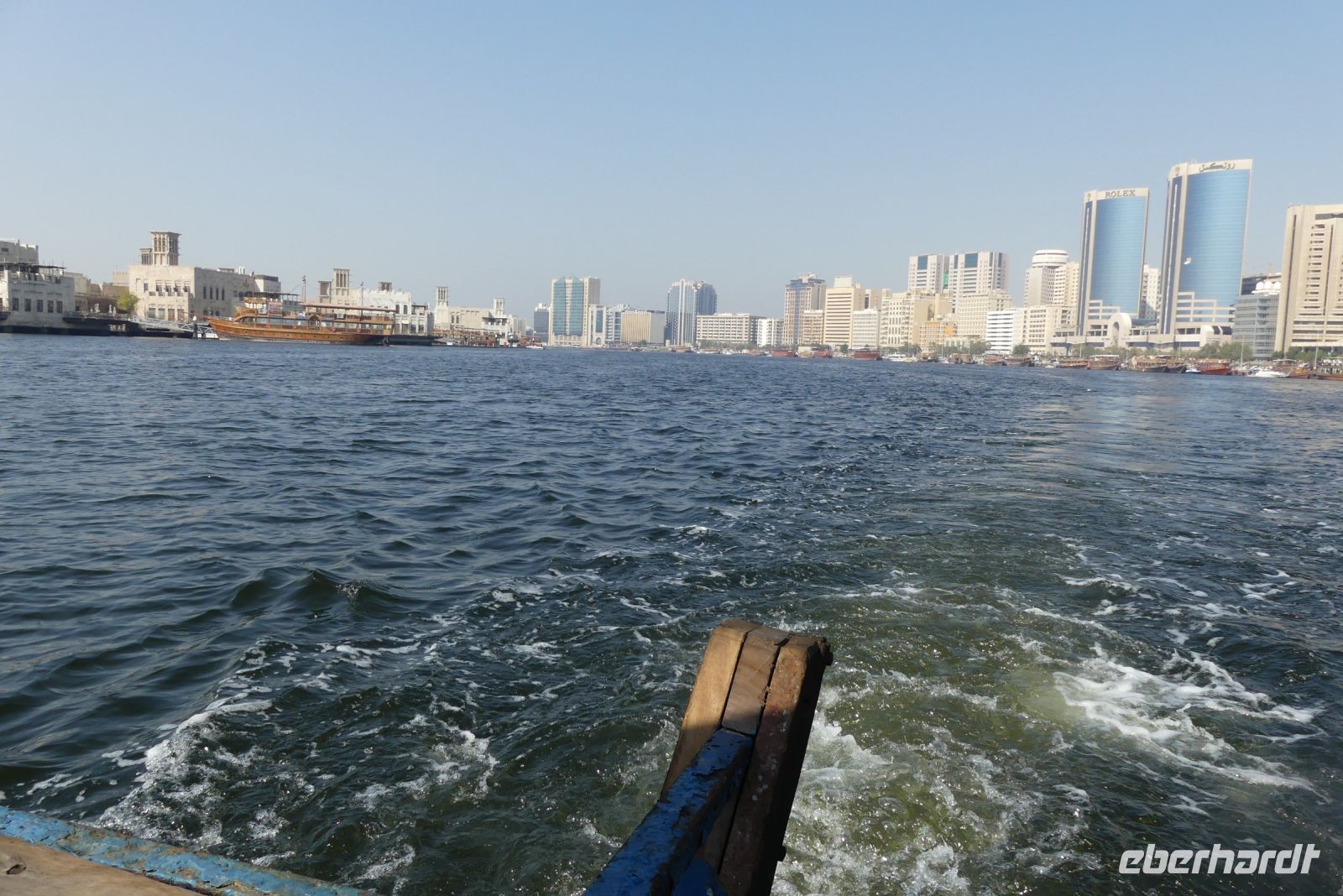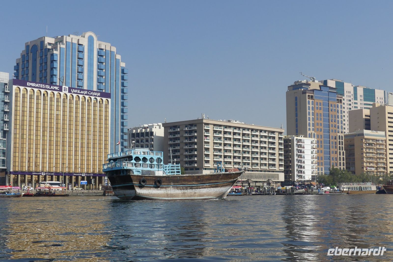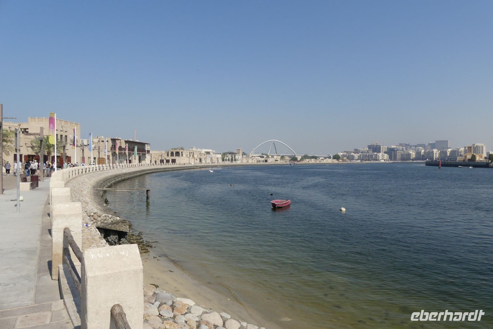 Weiter vorn am Creek im historischen Stadtviertel Al Shindagha besuchen wir das Al Shindagha Museum. Bei der Multimedia-Show "Dubai Creek: Birth of a City" bekommen wir einen sehenswerten Einblick in die Geschichte der Region. Von Al Shindagha laufen wir zur nächsten Anlagestelle für Wassertaxis. Man nennt sie Abra. Ich liebe es immer wieder, mit so einer Abra den Creek entlang zu fahren. Wir fahren eine Schleife auf dem Dubai Creek, wenden in Höhe der Bank of Dubai, ein markantes Bankgebäude mit gewölbter Fassade, in der wir unsere Abra als Spiegelbild sehen können.