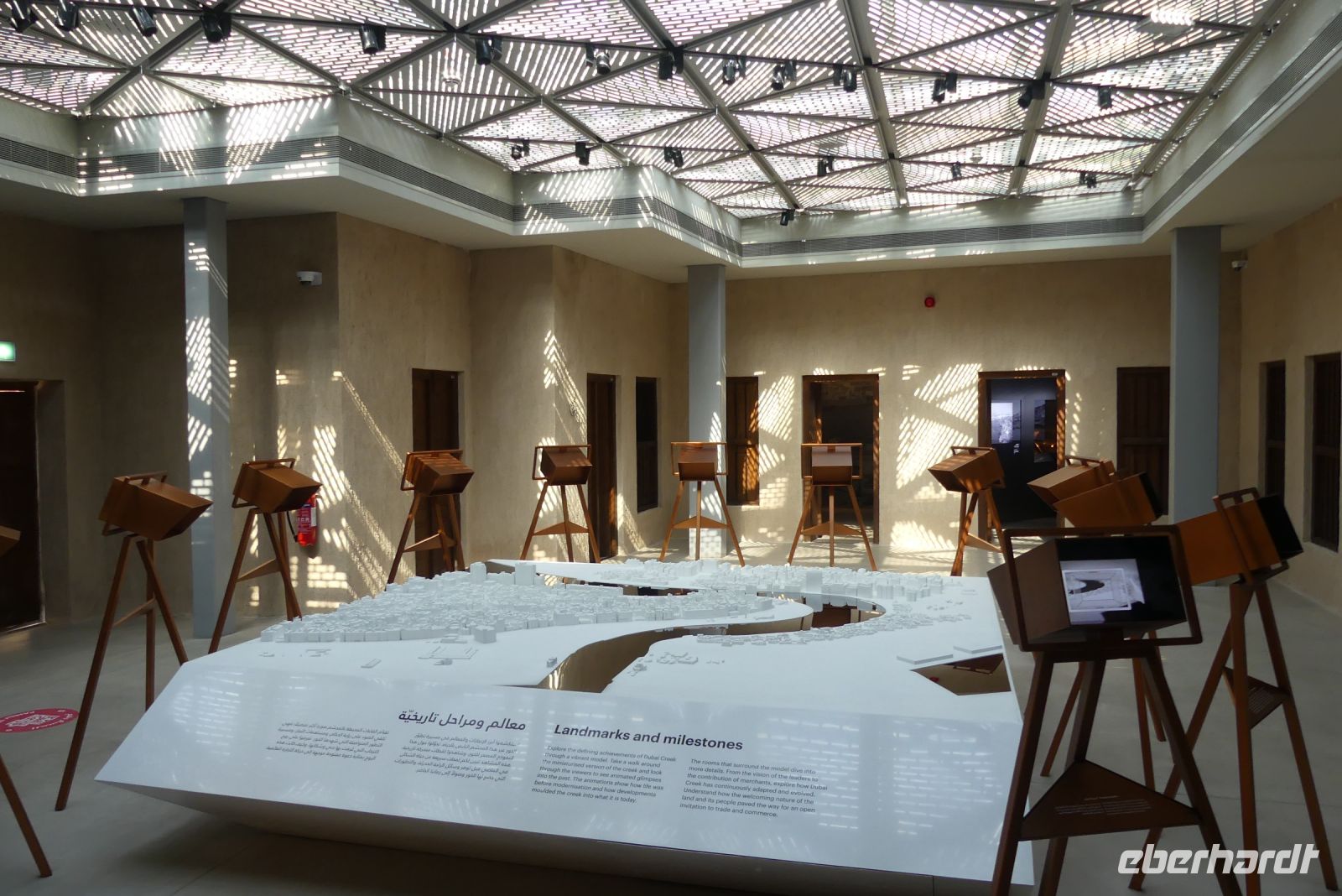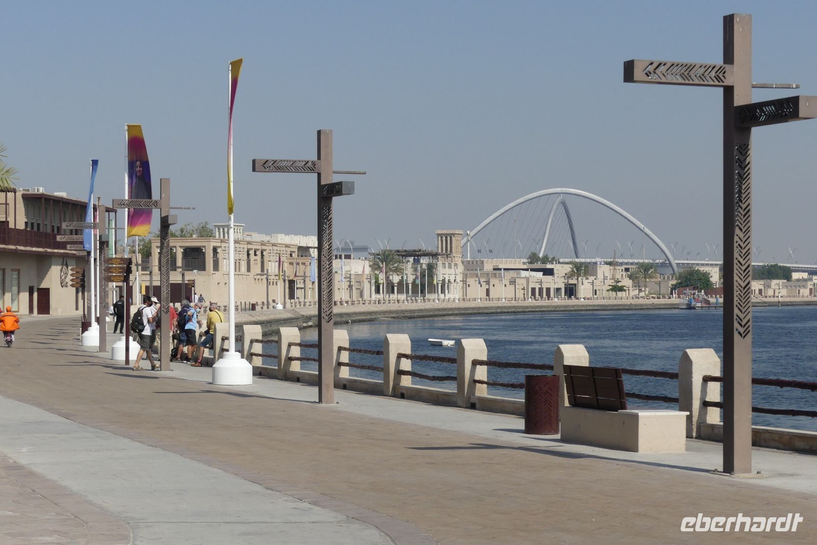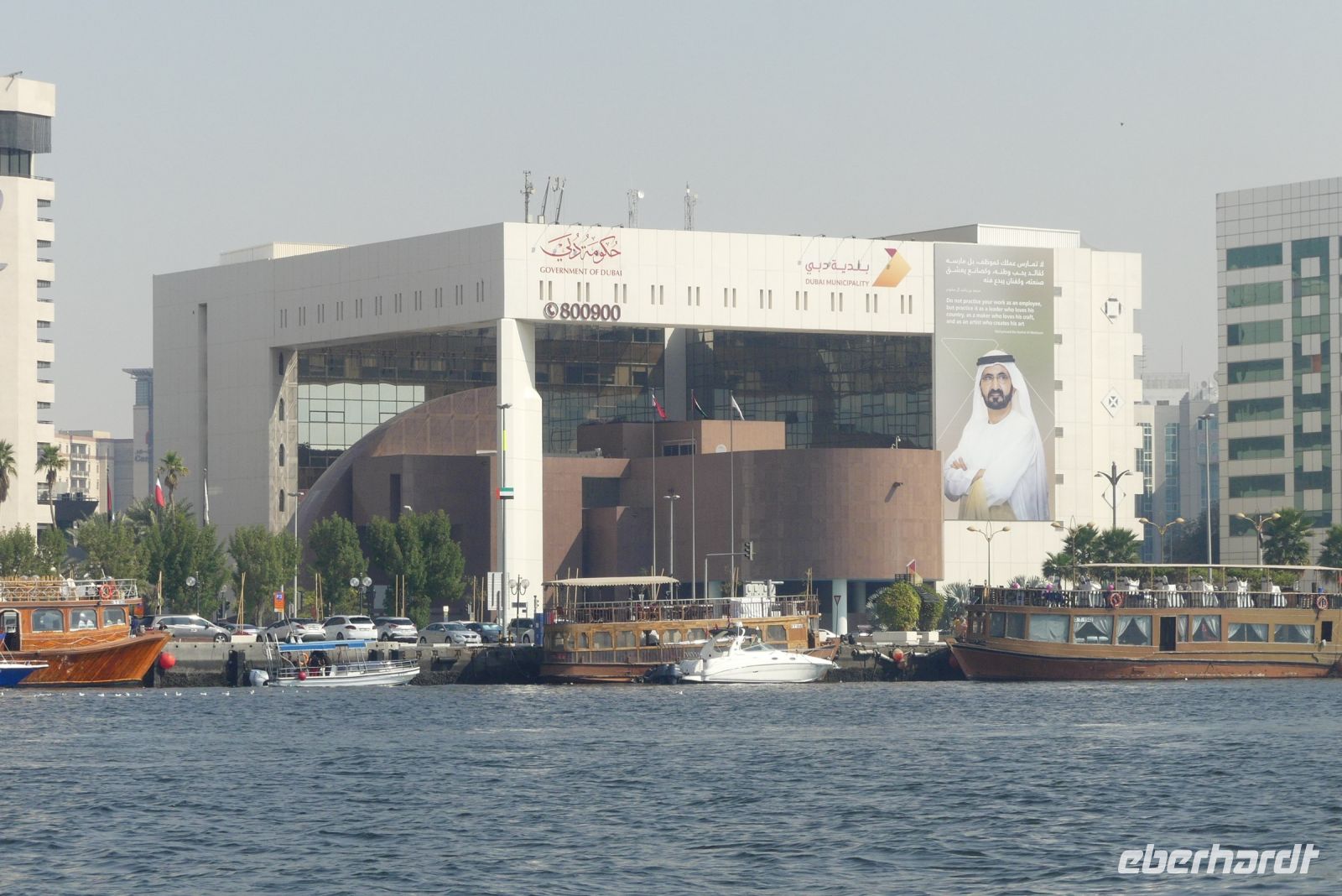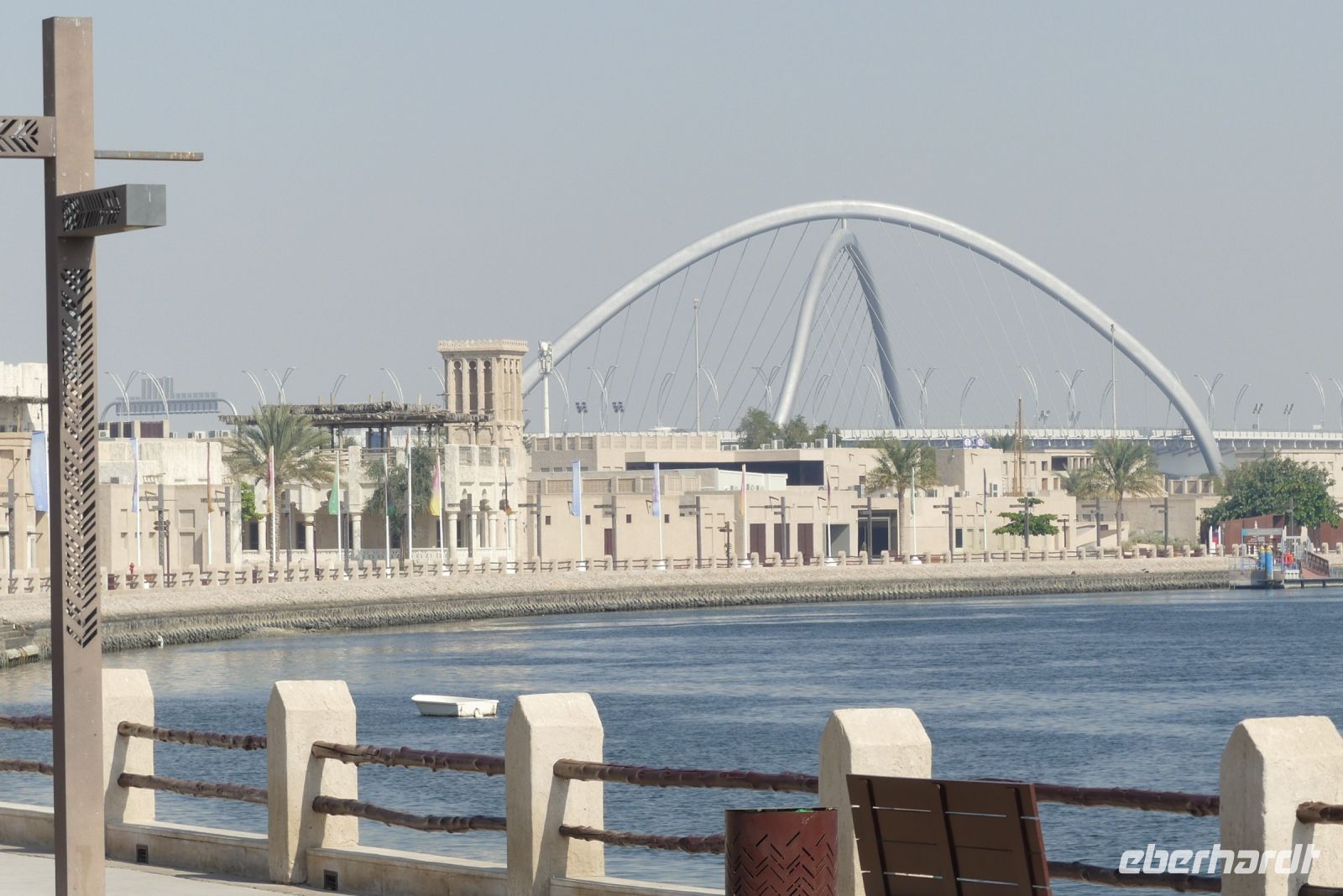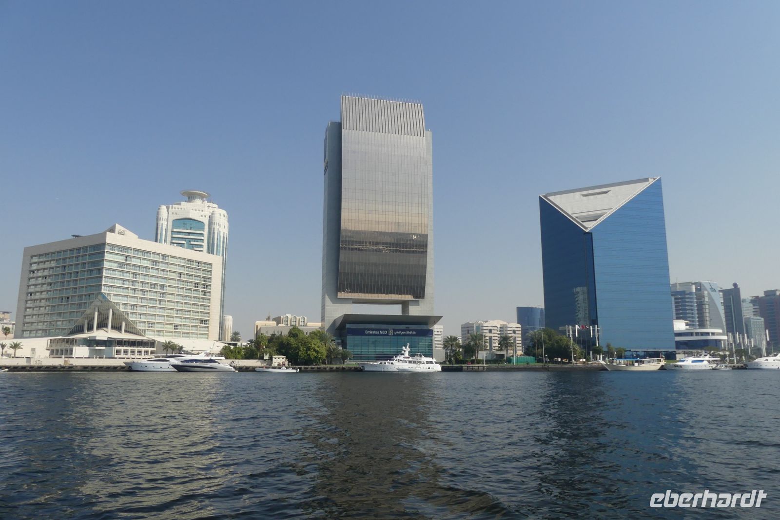 Weiter vorn am Creek im historischen Stadtviertel Al Shindagha besuchen wir das Al Shindagha Museum. Bei der Multimedia-Show "Dubai Creek: Birth of a City" bekommen wir einen sehenswerten Einblick in die Geschichte der Region. Von Al Shindagha laufen wir zur nächsten Anlagestelle für Wassertaxis. Man nennt sie Abra. Ich liebe es immer wieder, mit so einer Abra den Creek entlang zu fahren. Wir fahren eine Schleife auf dem Dubai Creek, wenden in Höhe der Bank of Dubai, ein markantes Bankgebäude mit gewölbter Fassade, in der wir unsere Abra als Spiegelbild sehen können.