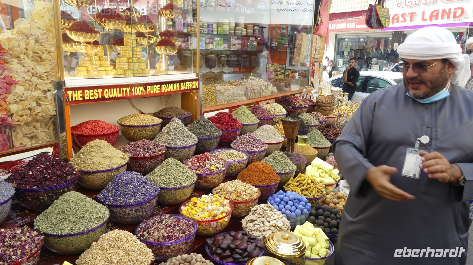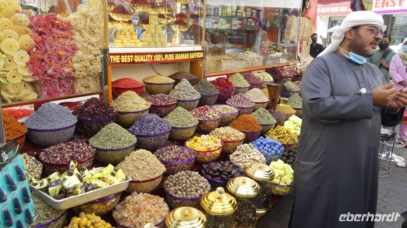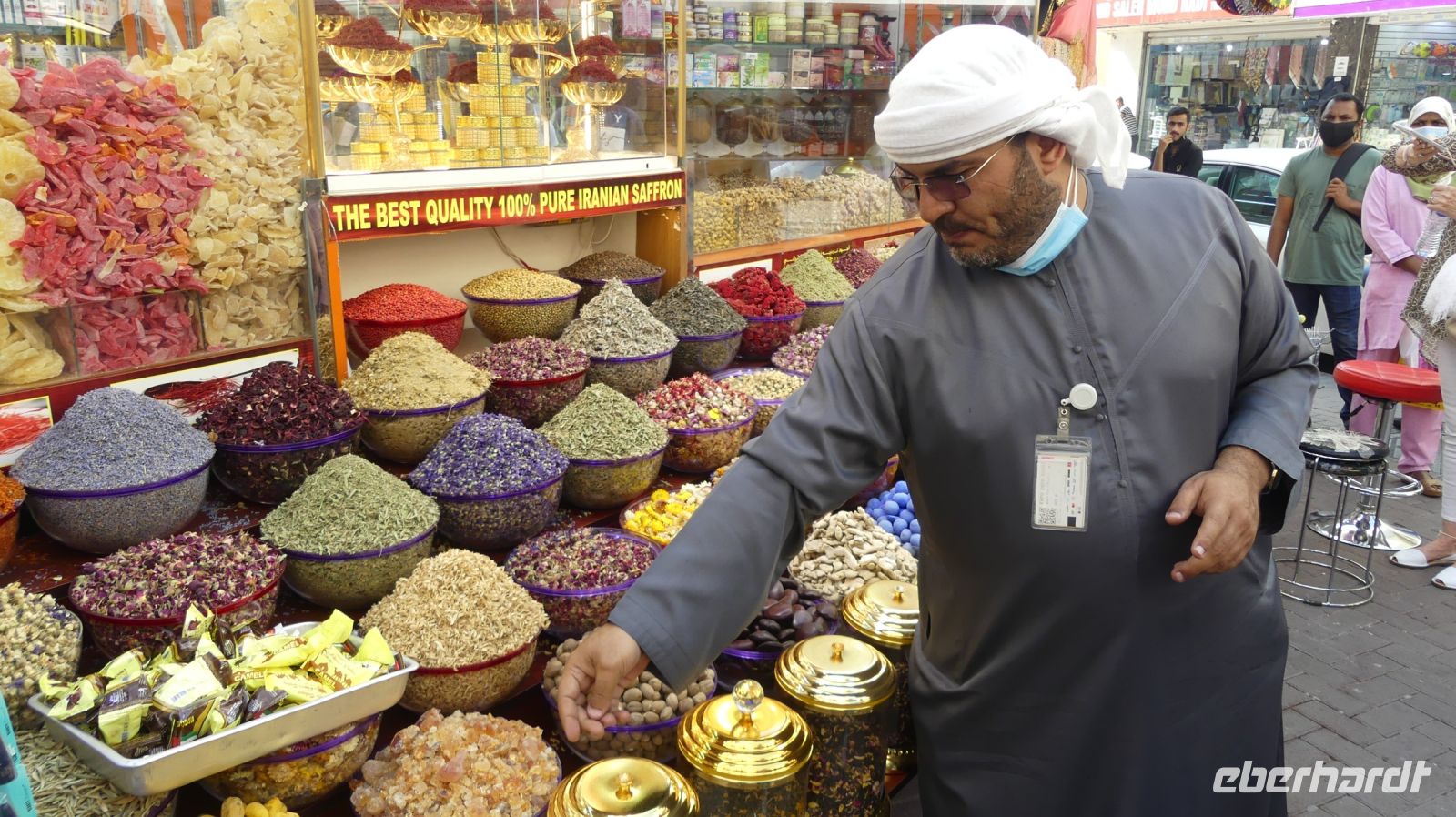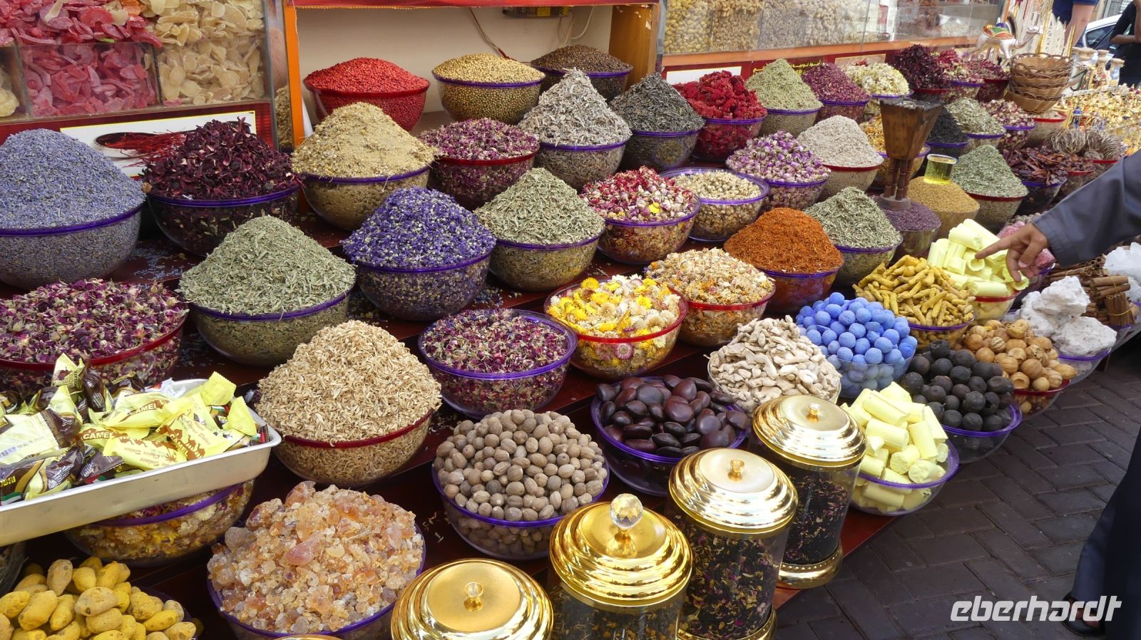 Schließlich kommen wir zum anderen Ufer, um dort den Gewürz- und Goldsouk zu erkunden. Beliebte Gewürze, die hier gekauft werden sind Safran, Vanille und Muskatnuss.