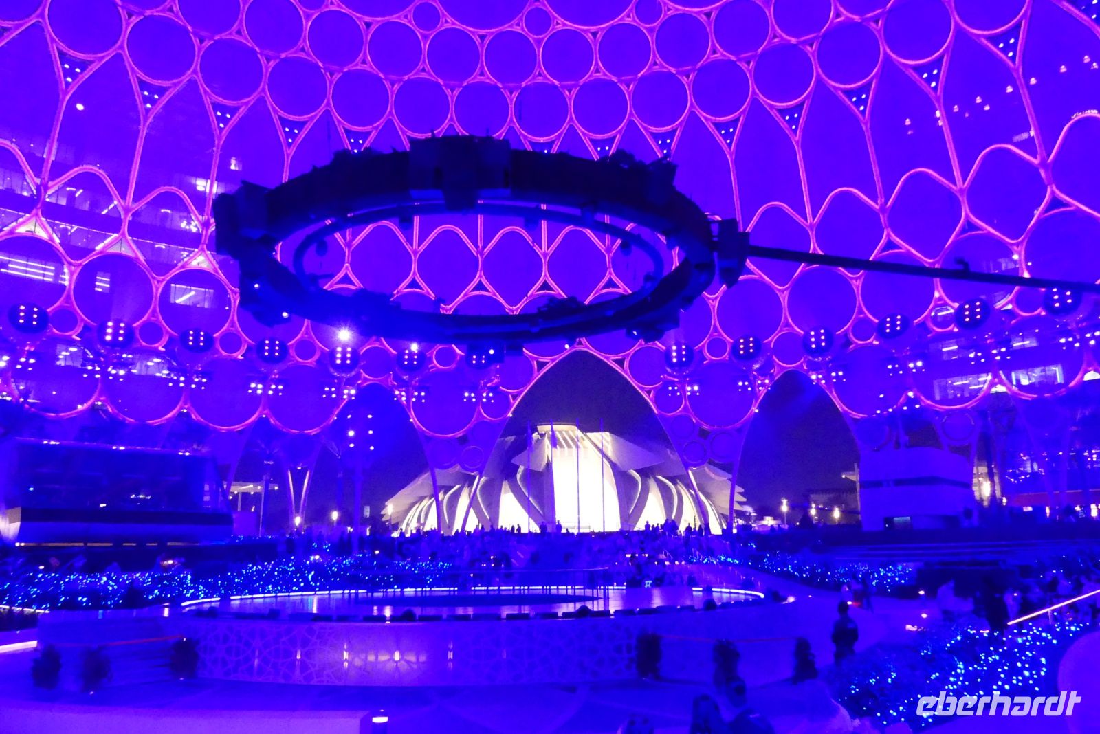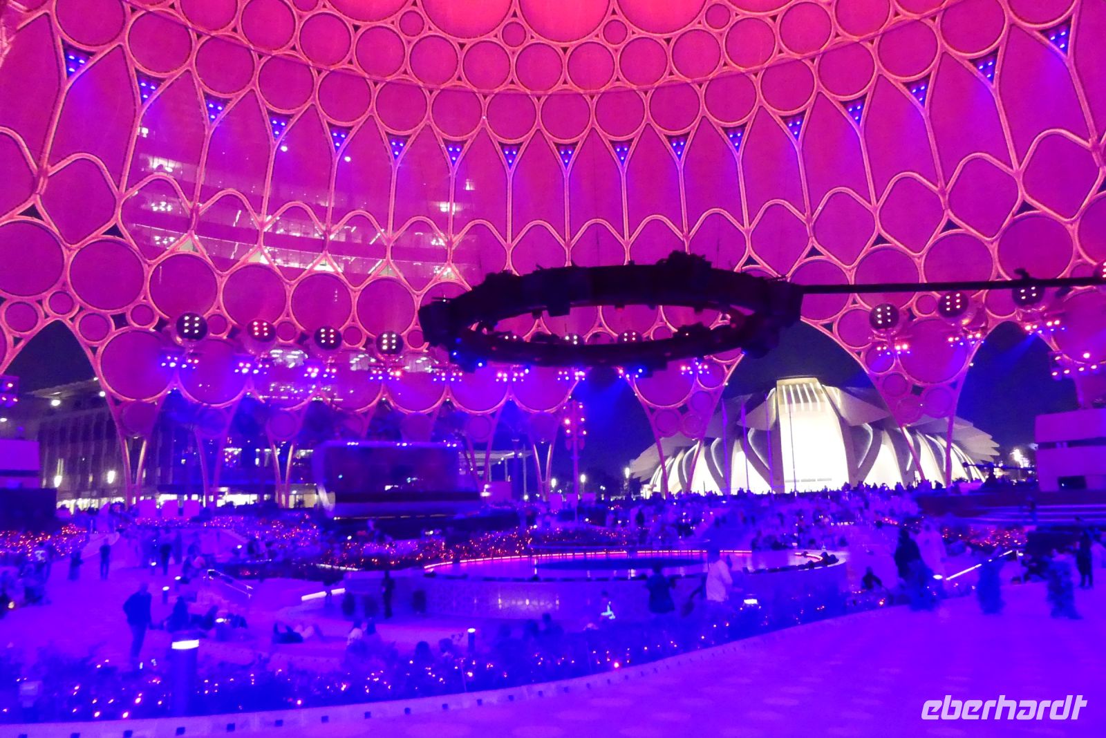 Am Abend zieht es mich wieder zum zentralen Kuppelgebäude, dem „Al Wasl Dome“, wo jeden Abend wechselnde Shows aufgeführt werden. „Al Wasl“ bedeutet im Arabischen „Verbindung“, „Kontakt“. So ist „Al Wasl“ im Kontext der EXPO das Bindeglied, welches die drei Themenfelder im Zentrum der Ausstellung zusammenführt und miteinander verbindet. Der Al Wasl Dome steht damit für das Motto der EXPO "Connecting Minds, Creating the Future". Gleichzeitig war „Al Wasl“ der ursprüngliche Name Dubais, als es noch ein kleiner Ort am Creek war.