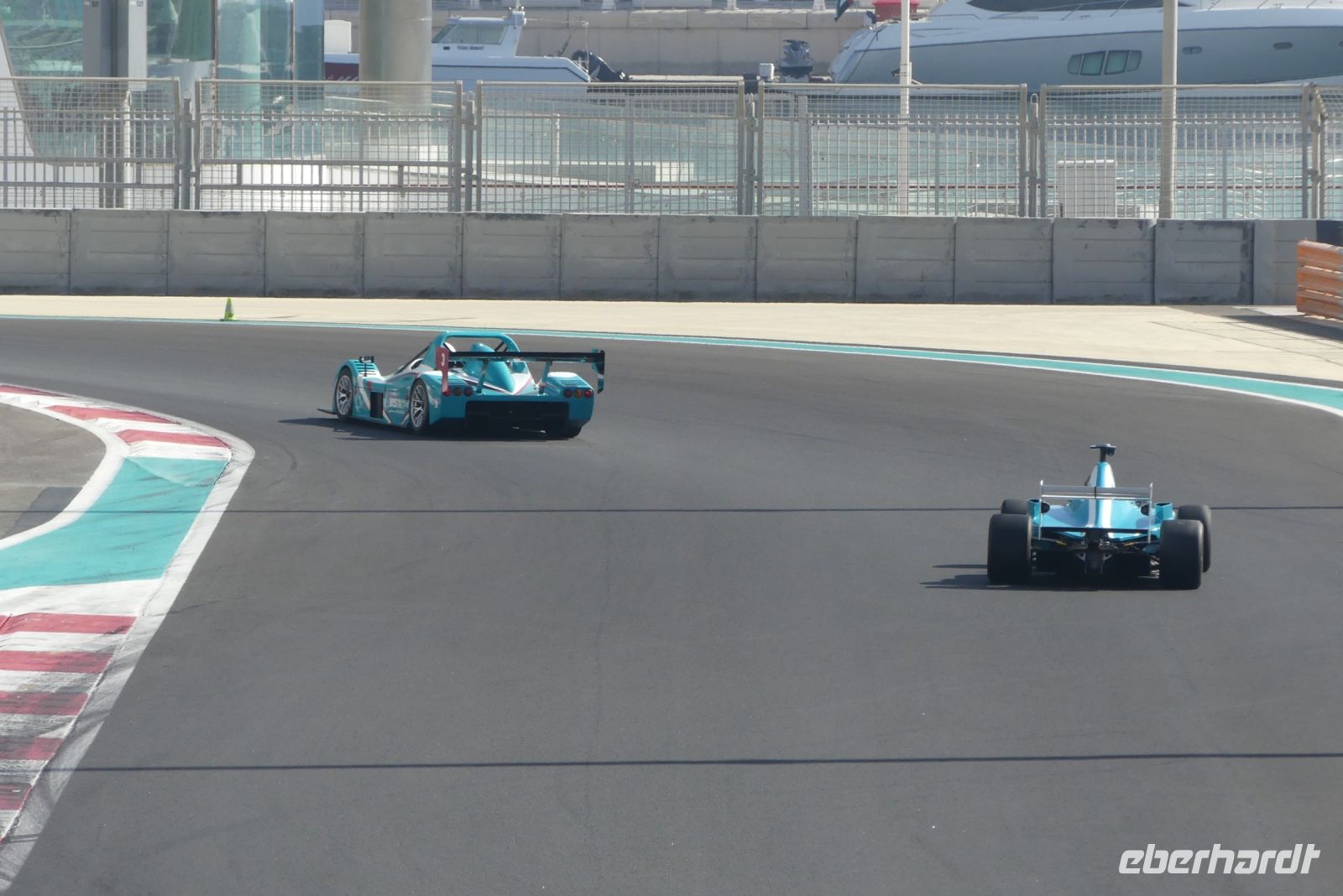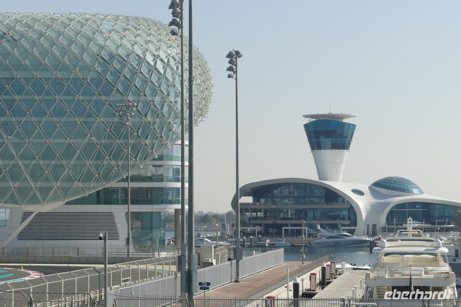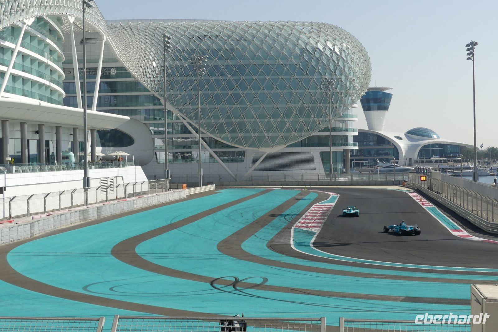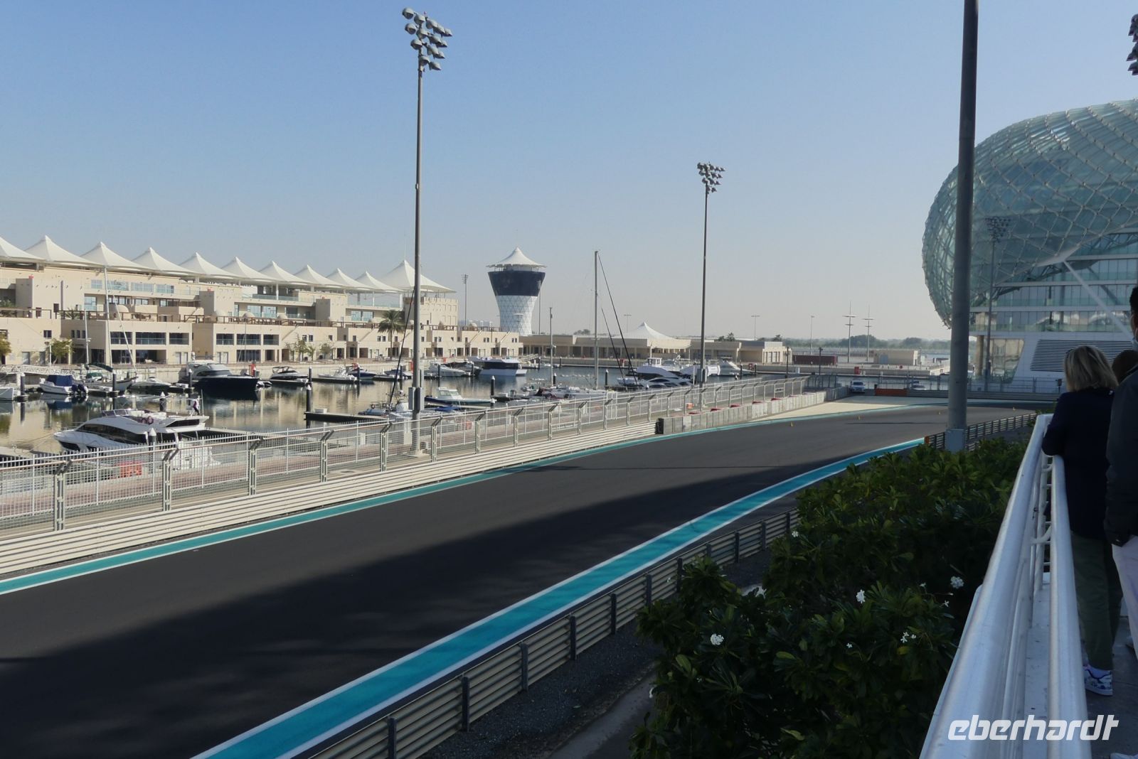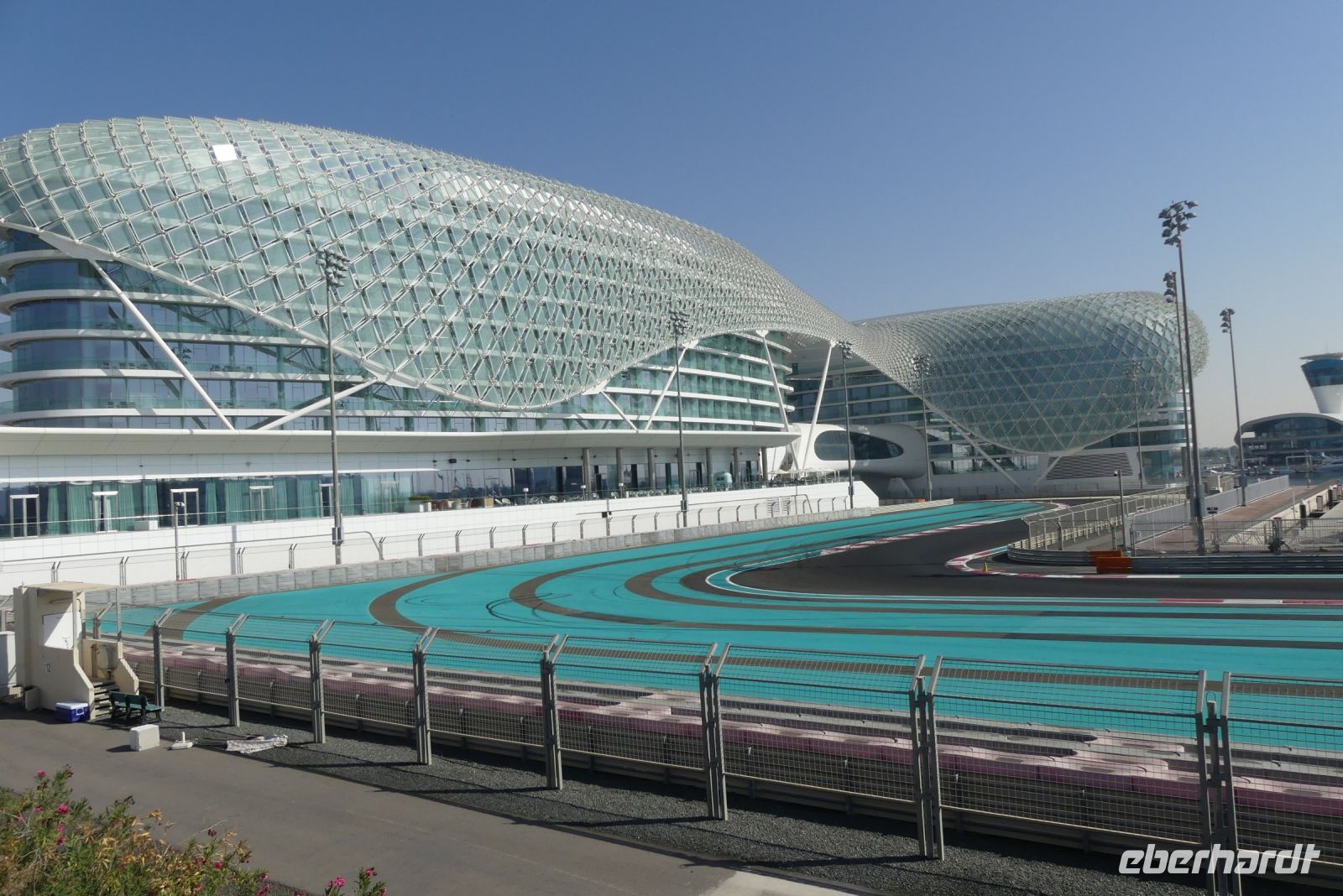 Ausgestattet mit unserem aktuellen Corona-Testergebnis verlassen wir am Morgen Dubai Richtung Abu Dhabi. Normalerweise gibt es keine Grenzstation zwischen den beiden Emiraten. Lediglich die wechselnde Asphaltfarbe und die plötzlich vorhandene Alleebepflanzung entlang der Autobahn zeigen an, dass man im Emirat Abu Dhabi angekommen ist. Neu ist ein in der Art einer Mautstation errichteter Kontrollpunkt. Er dient der Kontrolle der Fahrzeuginsassen. Ohne unseren in Dubai durchgeführten Corona-Test kämen wir hier nicht weiter. Aber wir sind gut vorbereitet und die ganze Aktion dauert keine 10 Minuten, dann können wir unsere Fahrt Richtung Yas Island fortsetzen. Yas Island steht ganz im Zeichen von Motorsport und Geschwindigkeit. Neben dem Vergnügungspark Ferrari World befindet sich hier die Formel 1 Strecke Yas Marina Circuit. Wir halten am Yas Hotel (jetzt W-Hotel), um einen Blick auf die Rennstrecke zu werfen. Wir haben Glück, gerade drehen einige Formel 3 Rennwagen lautstark ein paar Trainingsrunden.