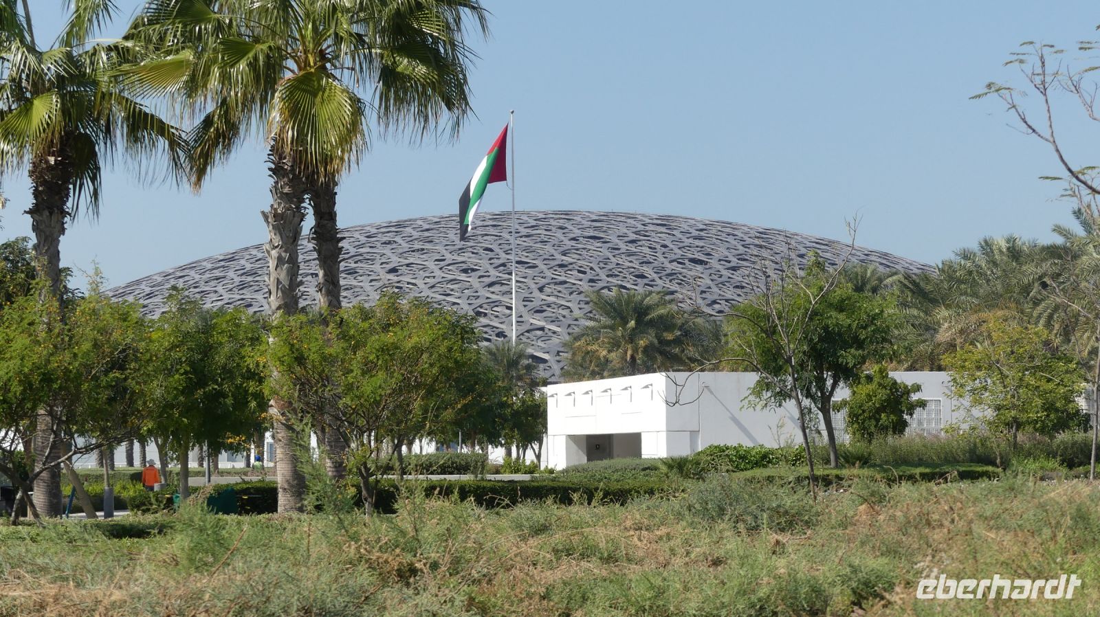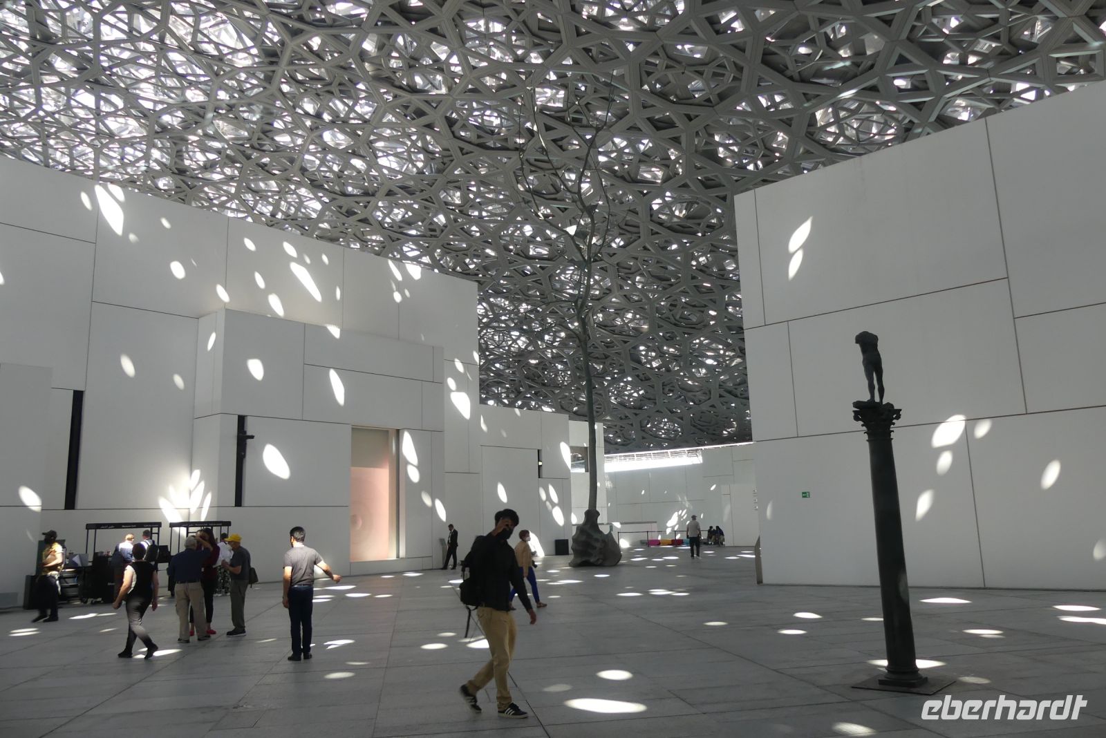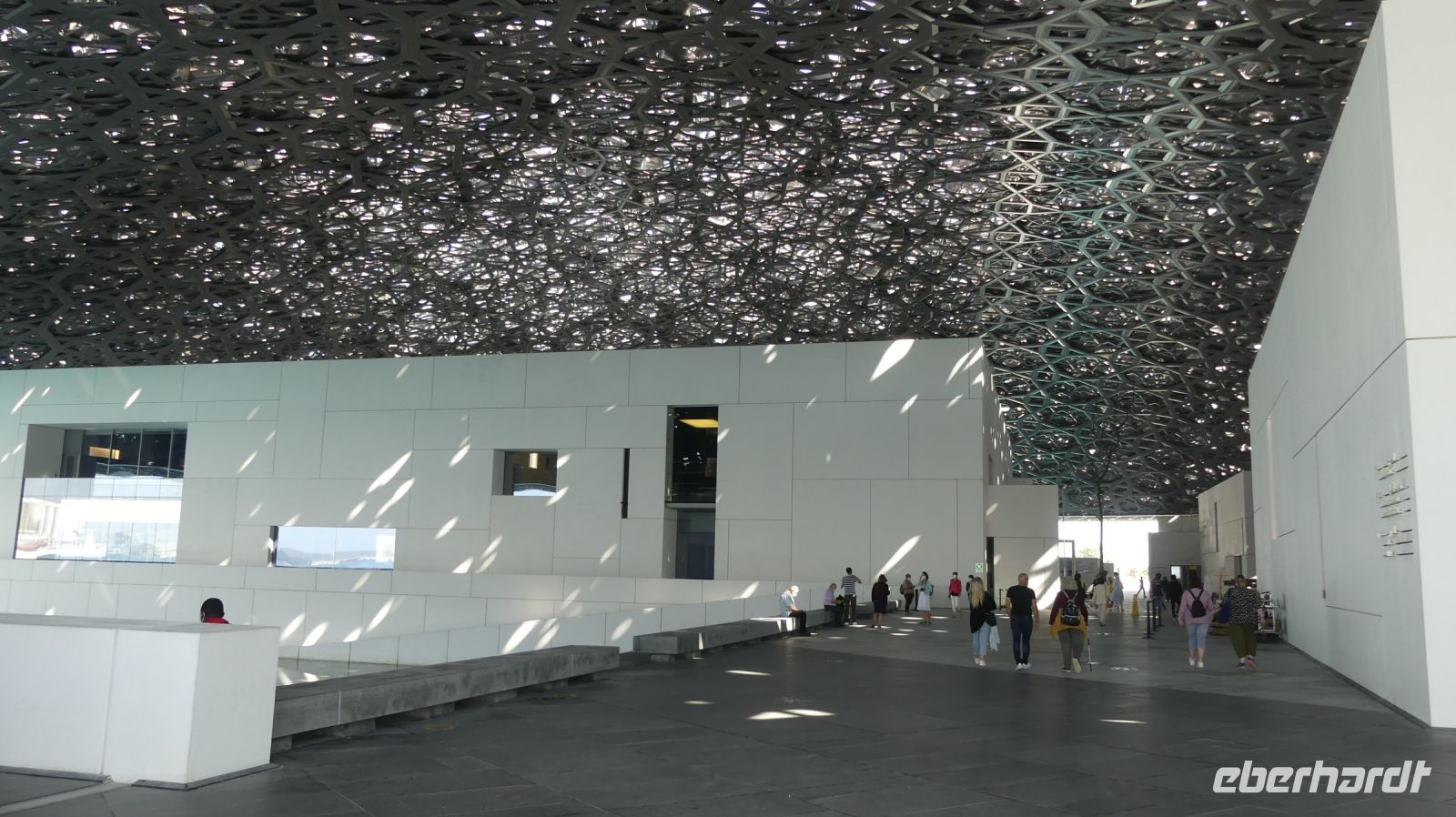 Vorbei an Mangrovenwäldern fahren wir Richtung Saadiyat Island, der Insel der „Glückseligkeit“. Hier entsteht ein sehr ambitioniertes Kulturzentrum mit dem Nationalmuseum, einem Guggenheim Museum, dem Maritim Museum und einer Konzerthalle. Schon fertig gestellt ist der Louvre Abu Dhabi. Unter seiner 180 Meter breiten Kuppel zu stehen, ist ein ganz besonderes Erlebnis. Die Kuppel ist so gestaltet, dass einzelne Sonnenstrahlen durchdringen, man nennt es „Rain of Light Building“. Der Architekt Jean Nouvel nennt den Louvre einen „Archipel der Kunst“, denn das Kunstmuseum wurde ins Meer gebaut, ist von drei Seiten vom Arabischen Golf umspült. Und es ist ein Fingerzeig auf das Ausstellungskonzept: ein Ort an dem Kunstwerke aus verschiedenen Kulturen der Welt vereint sind.