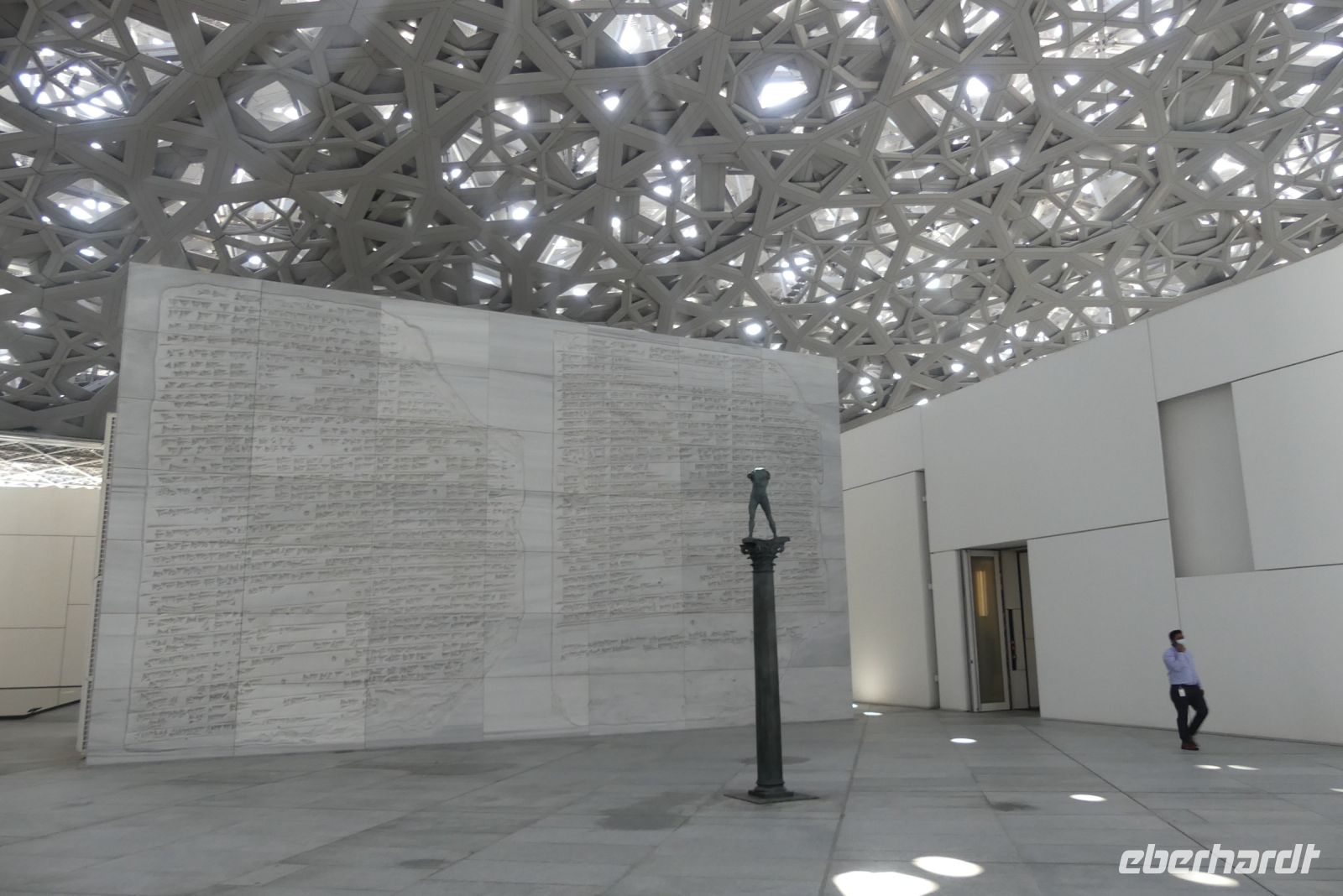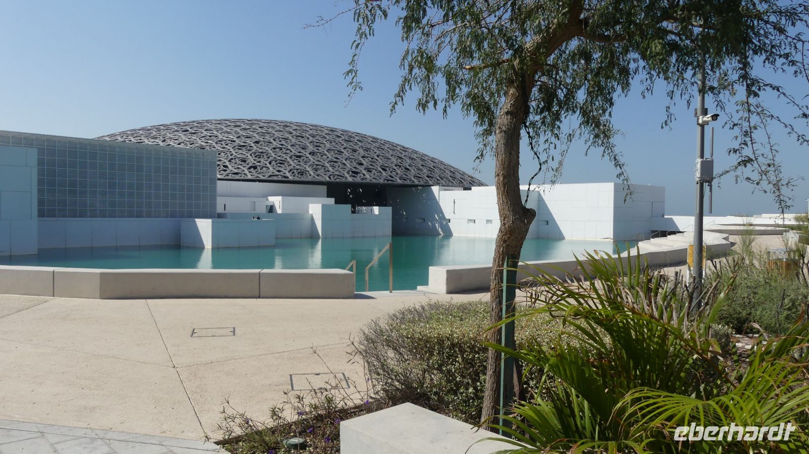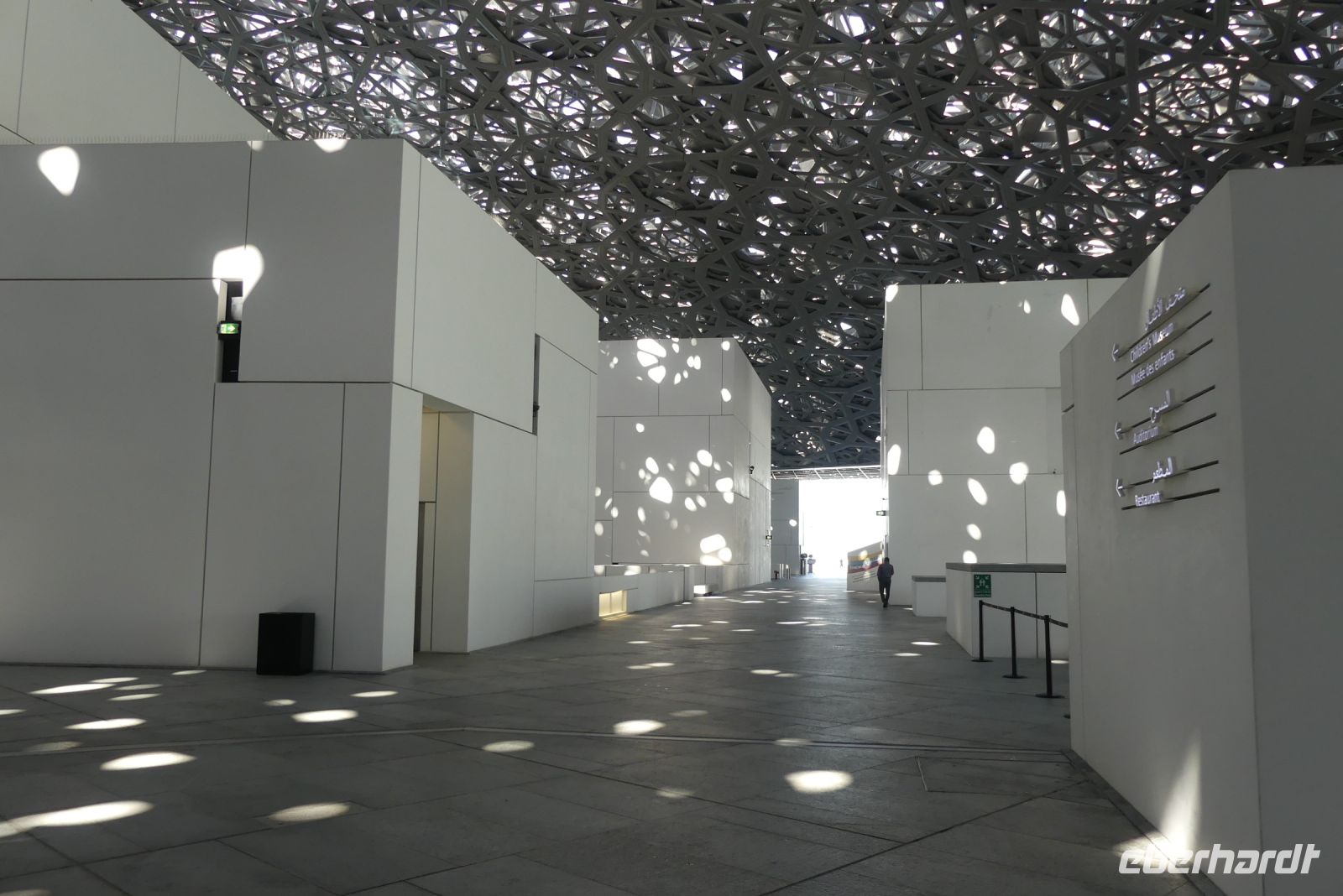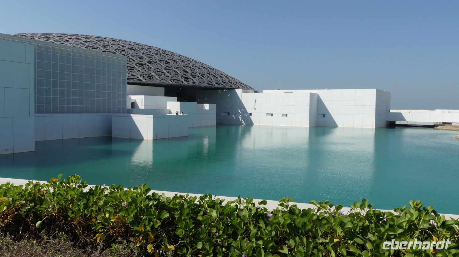 Vorbei an Mangrovenwäldern fahren wir Richtung Saadiyat Island, der Insel der „Glückseligkeit“. Hier entsteht ein sehr ambitioniertes Kulturzentrum mit dem Nationalmuseum, einem Guggenheim Museum, dem Maritim Museum und einer Konzerthalle. Schon fertig gestellt ist der Louvre Abu Dhabi. Unter seiner 180 Meter breiten Kuppel zu stehen, ist ein ganz besonderes Erlebnis. Die Kuppel ist so gestaltet, dass einzelne Sonnenstrahlen durchdringen, man nennt es „Rain of Light Building“. Der Architekt Jean Nouvel nennt den Louvre einen „Archipel der Kunst“, denn das Kunstmuseum wurde ins Meer gebaut, ist von drei Seiten vom Arabischen Golf umspült. Und es ist ein Fingerzeig auf das Ausstellungskonzept: ein Ort an dem Kunstwerke aus verschiedenen Kulturen der Welt vereint sind.