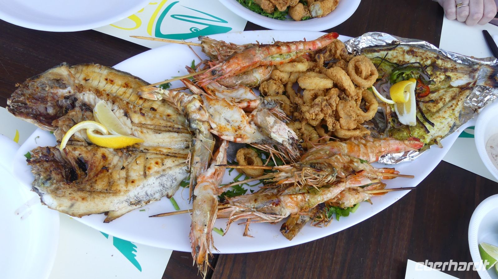 Anschließend setzen wir unsere Fahrt fort und kommen zum Hafen von Abu Dhabi. Am Fischmarkt nutzen wir das Angebot von frischem Fisch und Meeresfrüchten für eine Stärkung….lecker :-)