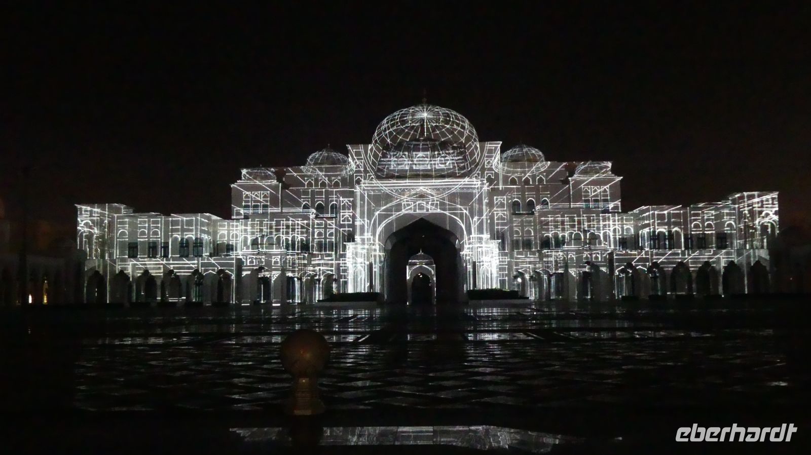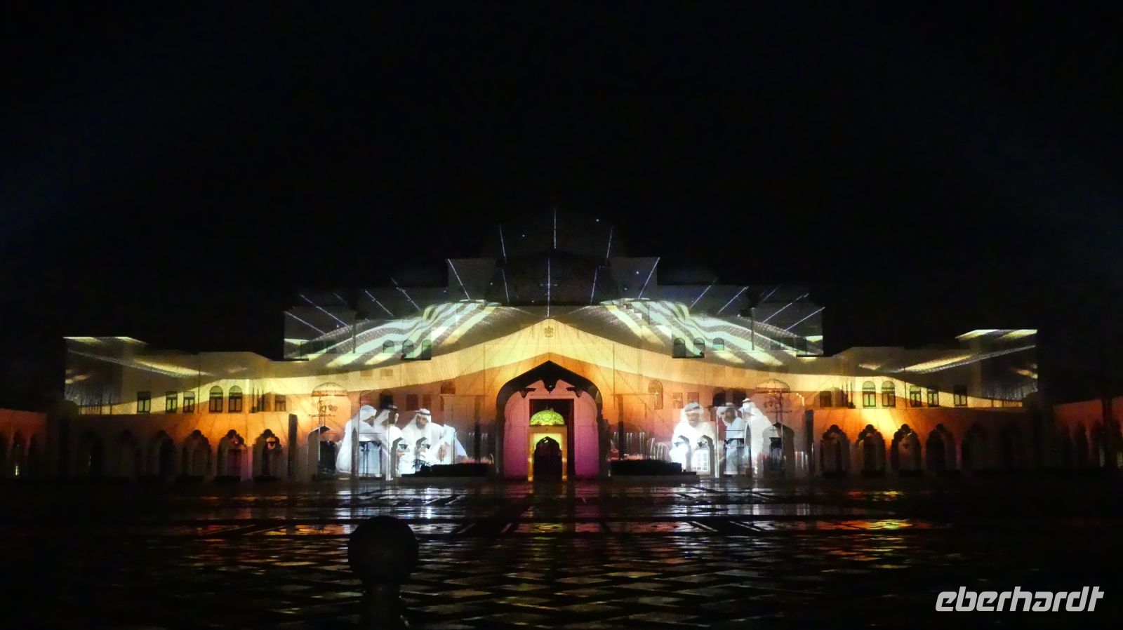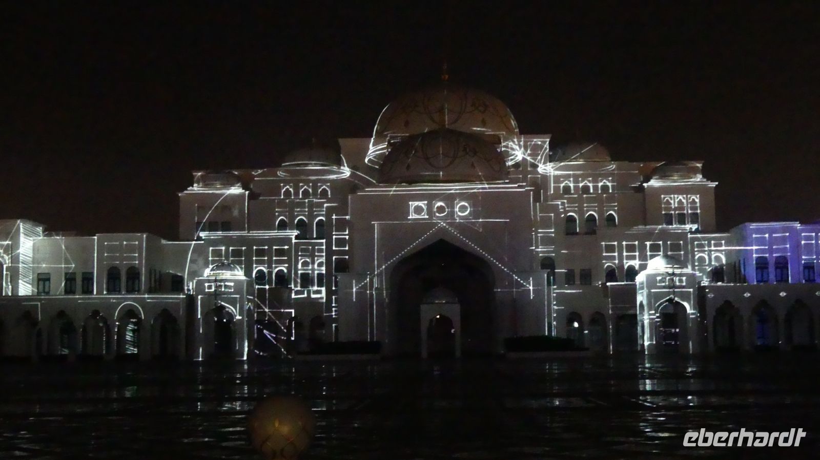 Nach Sonnenuntergang erleben wir zum Abschluss unseres Palastbesuches eine Licht- und Tonschau. Die „Palace in Motion“ Show zeigt Motive aus der Geschichte, Gegenwart und Zukunft der VAE.