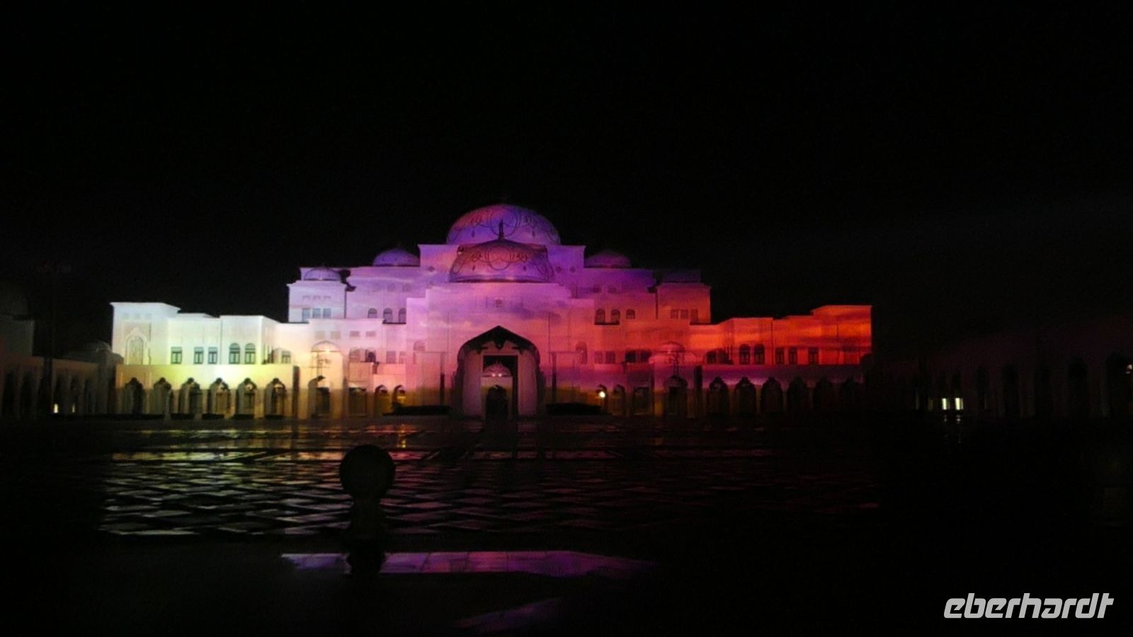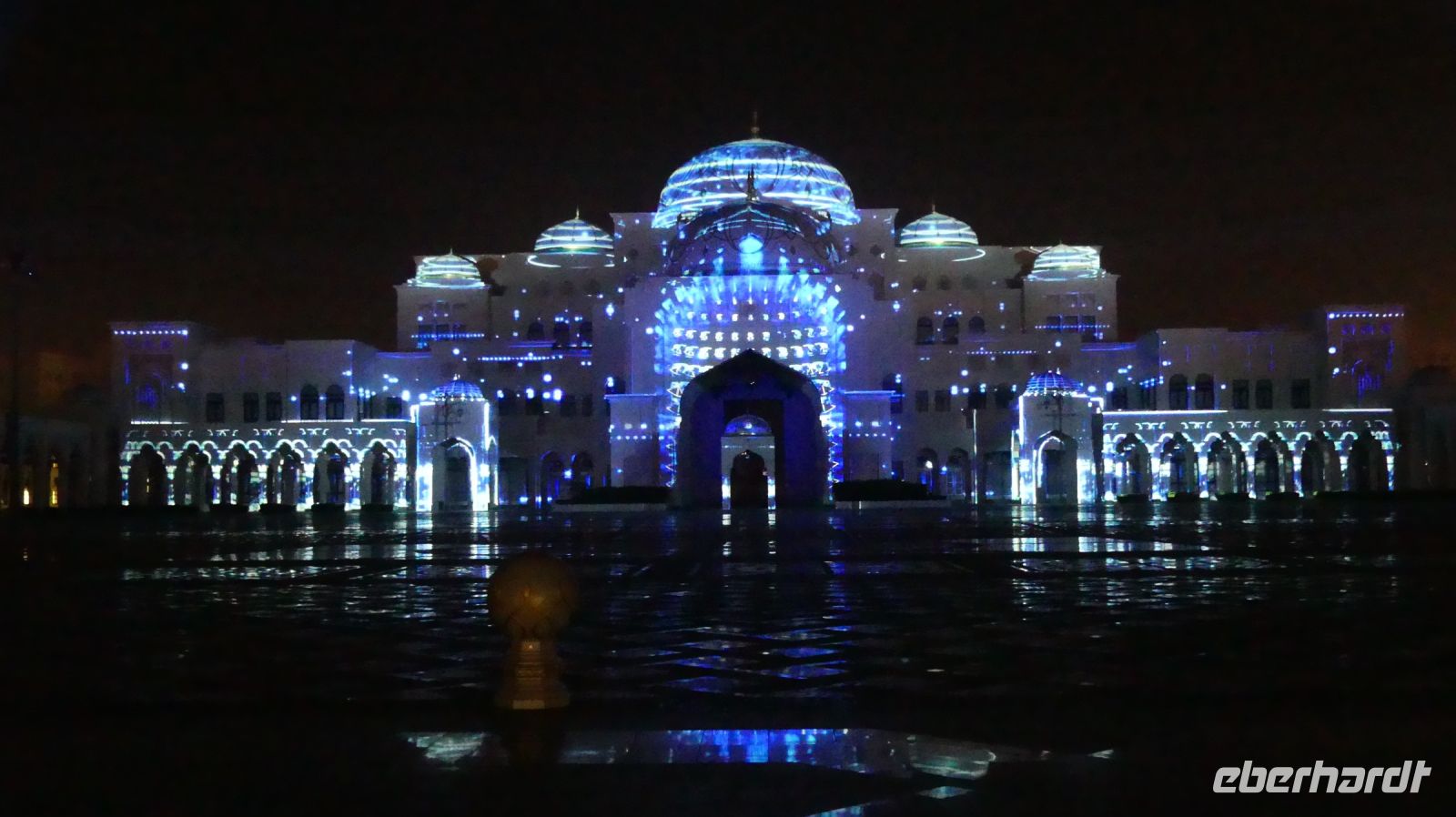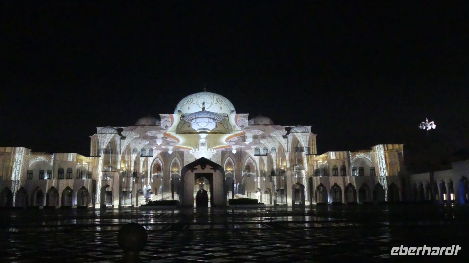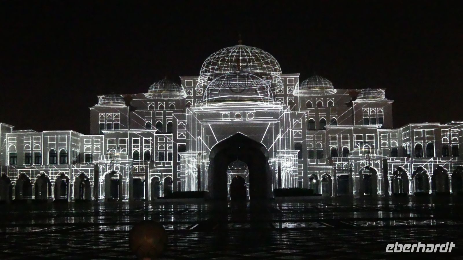 Nach Sonnenuntergang erleben wir zum Abschluss unseres Palastbesuches eine Licht- und Tonschau. Die „Palace in Motion“ Show zeigt Motive aus der Geschichte, Gegenwart und Zukunft der VAE.