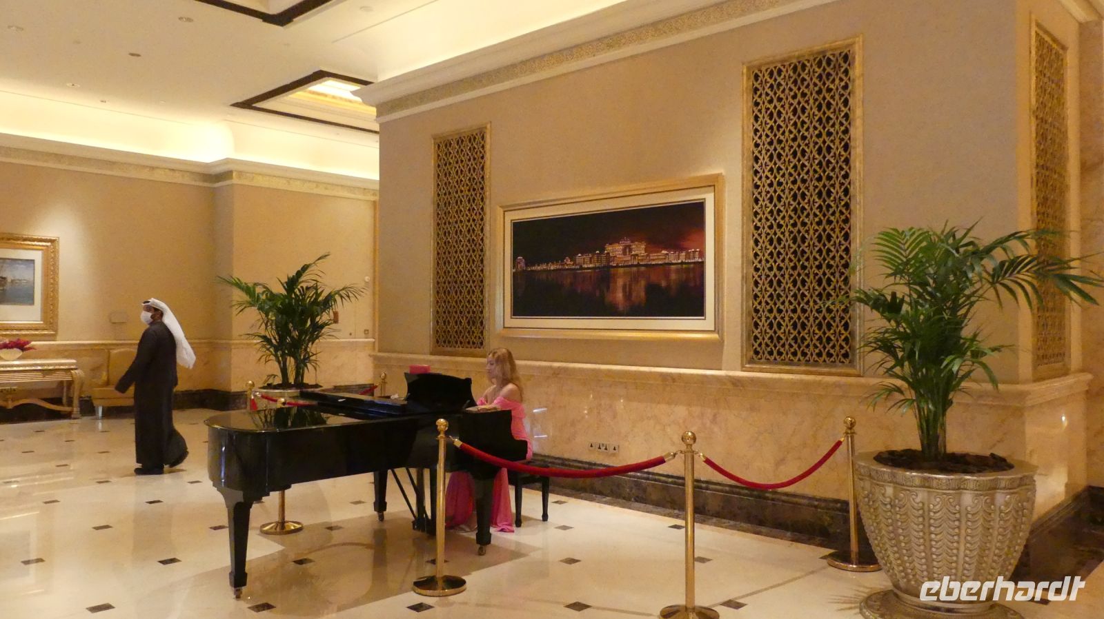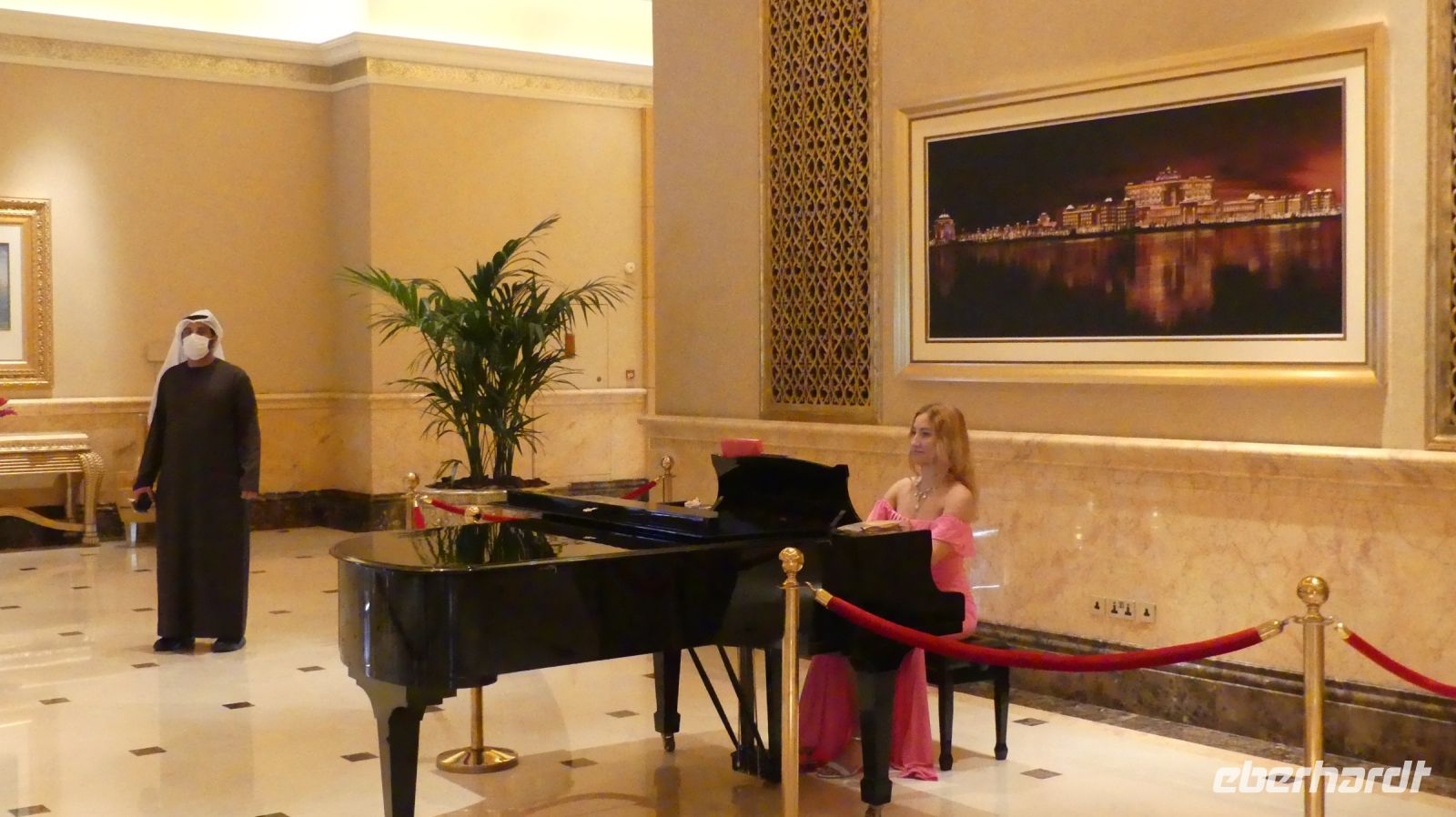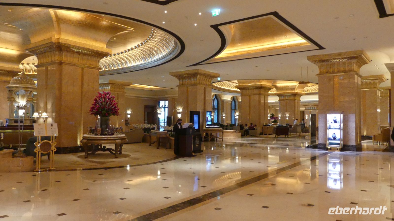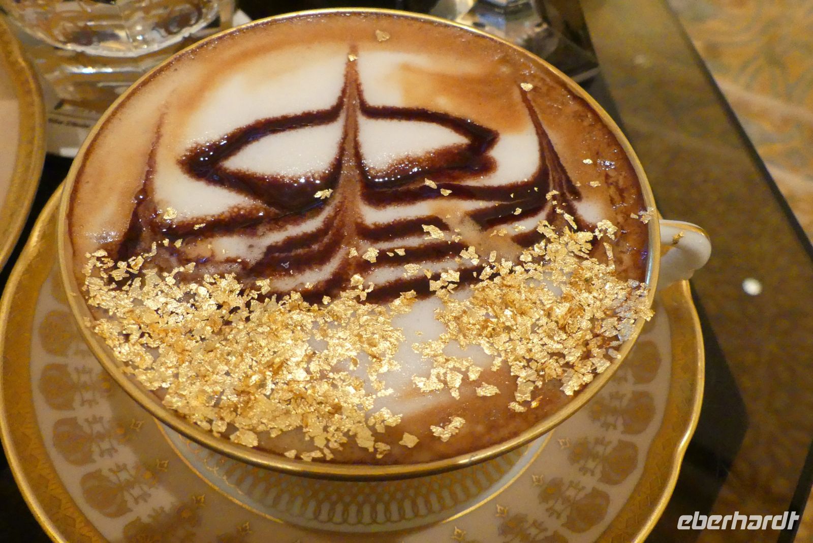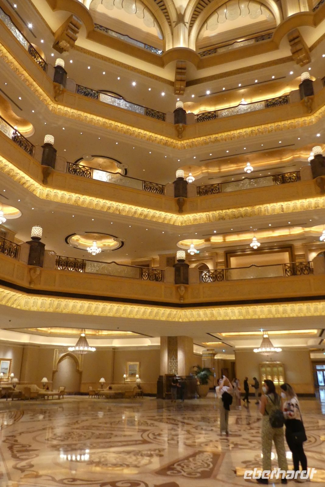 Auf ein Mittagessen verzichten wir. Dafür kehren wir gegenüber ins Emirates Palace zur Teestunde ein. Das Luxushotel dient auch der Beherbergung von Staatsgästen. Ohne Vorlage von Impfnachweis, PCR-Test und Sicherheitskontrolle gäbe es keinen Zugang. Im luxuriösen Ambiente genießen wir unseren mit Blattgold verzierten Kaffee, dazu gibt es herzhafte und süße Leckereien.