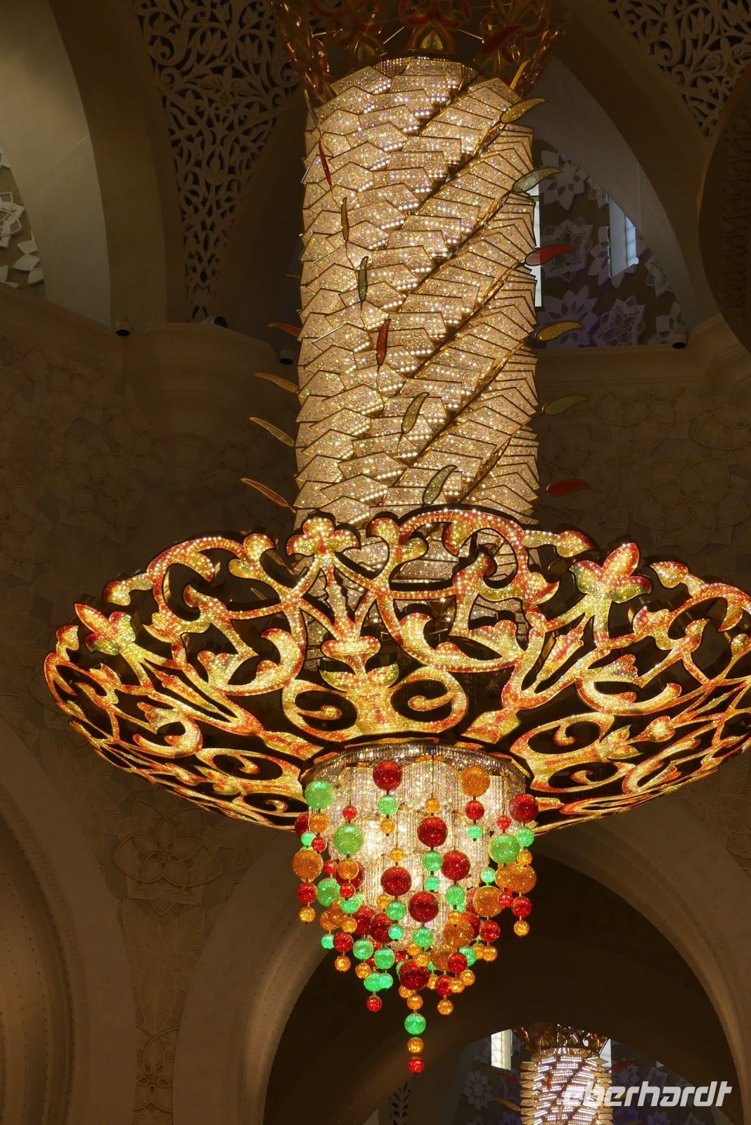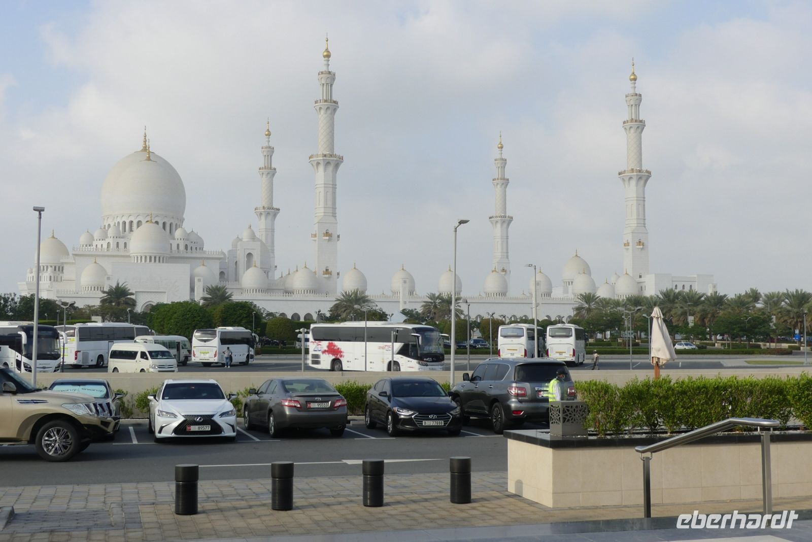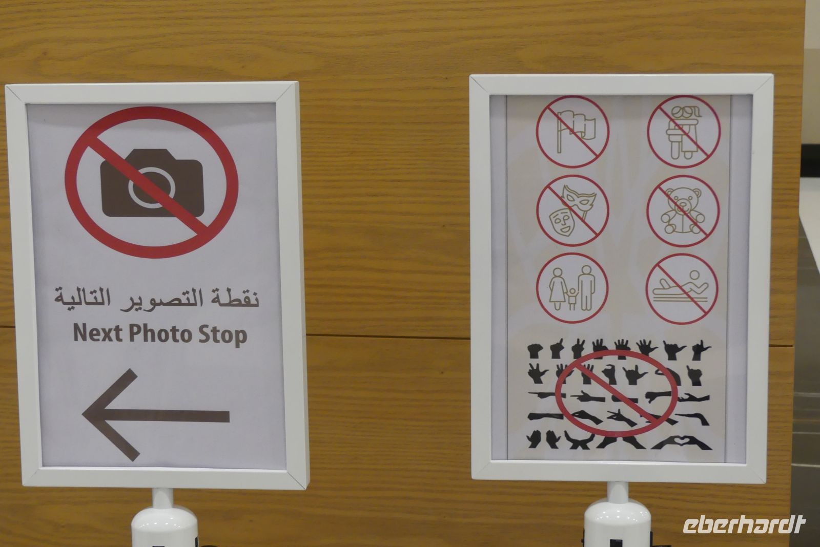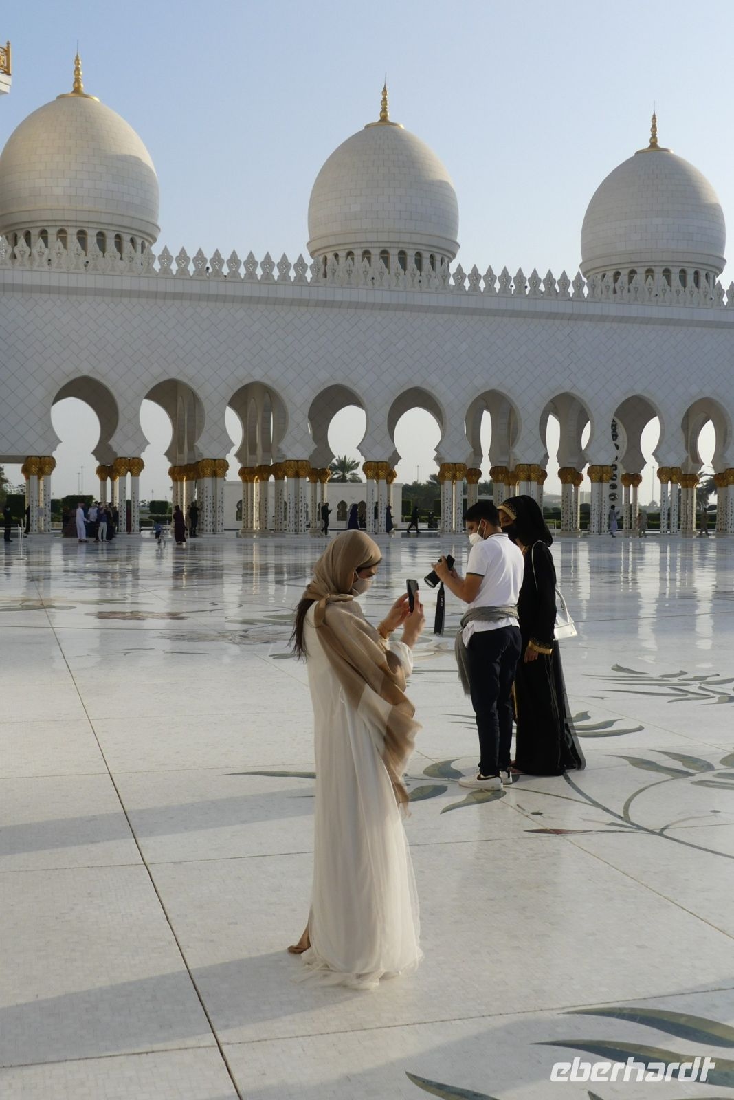 Anschließend fahren wir zur vielleicht bekanntesten Sehenswürdigkeit von Abu Dhabi. Auf dem Weg dahin passieren wir den schiefen Turm mit dem Namen Capital Gate Tower. An der Moschee heißt es für die Frauen Kopftuch aufsetzen und lange Kleidung anlegen. Die Große Shaikh Zayed Moschee gehört zu den weltgrößten Moscheen. Hier haben etwa 40.000 Muslime Platz. Die Freitagsmoschee strahlt im weißen italienischen Marmor, sie hat 82 Kuppeln in sieben verschiedenen Größen. Nachdem im letzten Dezember sich ein Tourist aus Israel mit einer Regenbogenfahne vor der Moschee fotografiert und diese Bilder online gestellt hatte, sind die hiesigen Behörden ziemlich verschnupft. Im Ergebnis finden wir jetzt völlig überzogene Regeln vor, die zum Beispiel jegliche Handzeichen auf Fotos verbieten. Mit eingerichteten „Fotopoints“ sollen jetzt Sicherheitskräfte kontrollieren, dass nur „anständige“ Fotos gemacht werden. Schade.