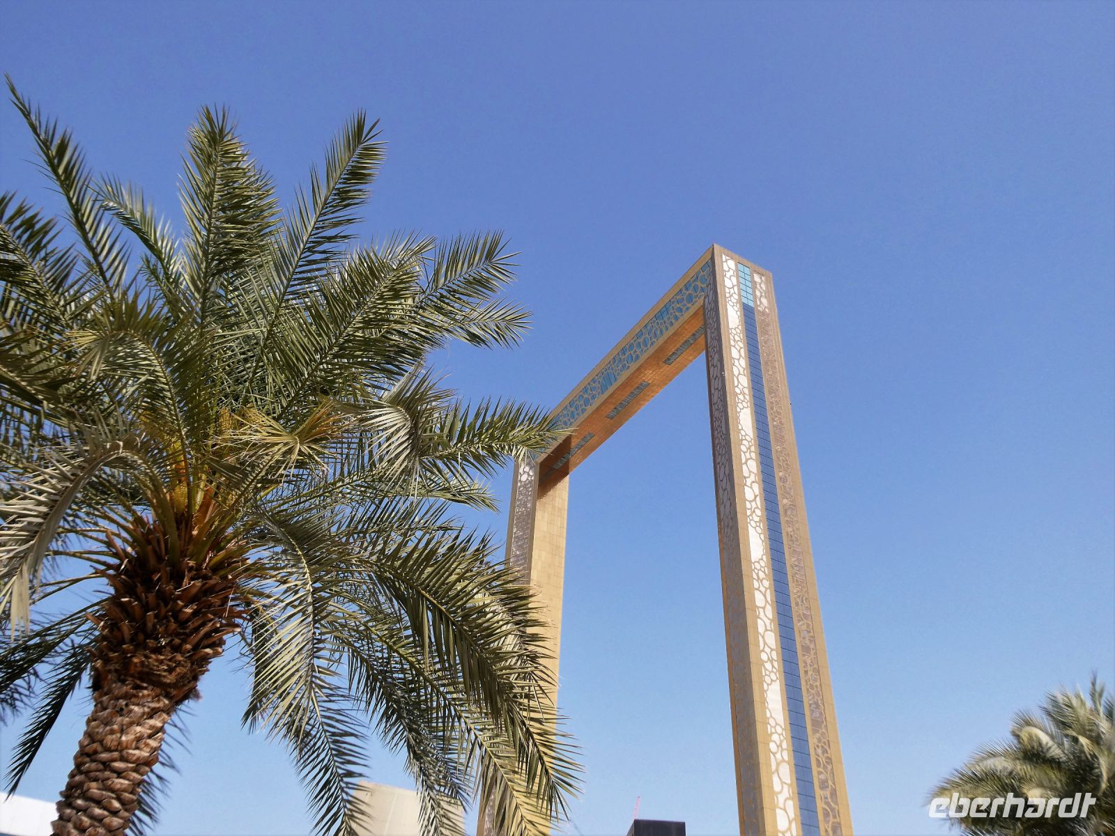 Unser erstes Ziel ist der wohl "größte Bilderrahmen" der Welt. Das Bauwerk besteht aus zwei 150 Meter hohen Türmen, die unten durch ein Basisgebäude und oben durch eine 93 Meter lange Brücke verbunden sind. Es sieht einfach nur wie ein Bilderrahmen aus. Im Basisgebäude wird in einer kleinen Ausstellung die Entwicklung Dubais vom Fischerdorf in eine moderne Metropole gezeigt.