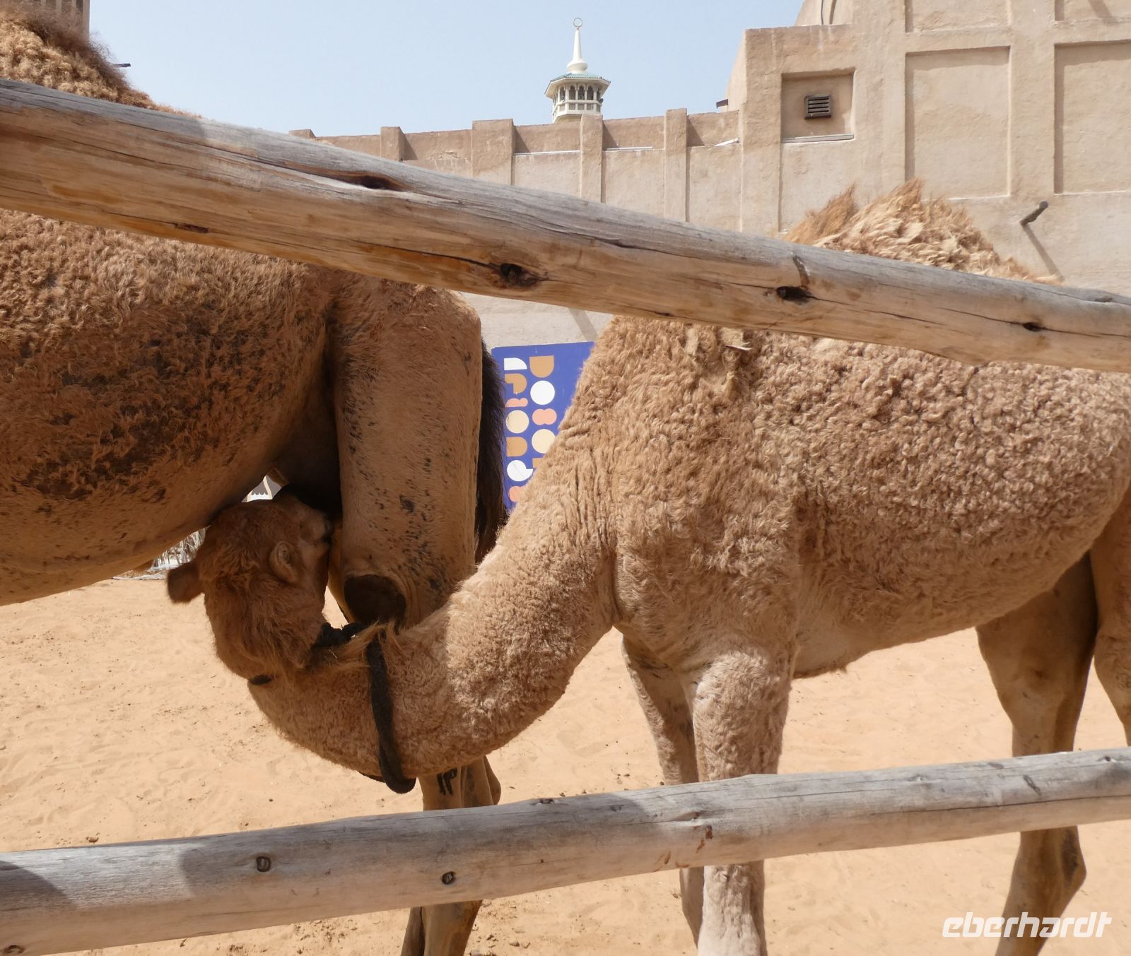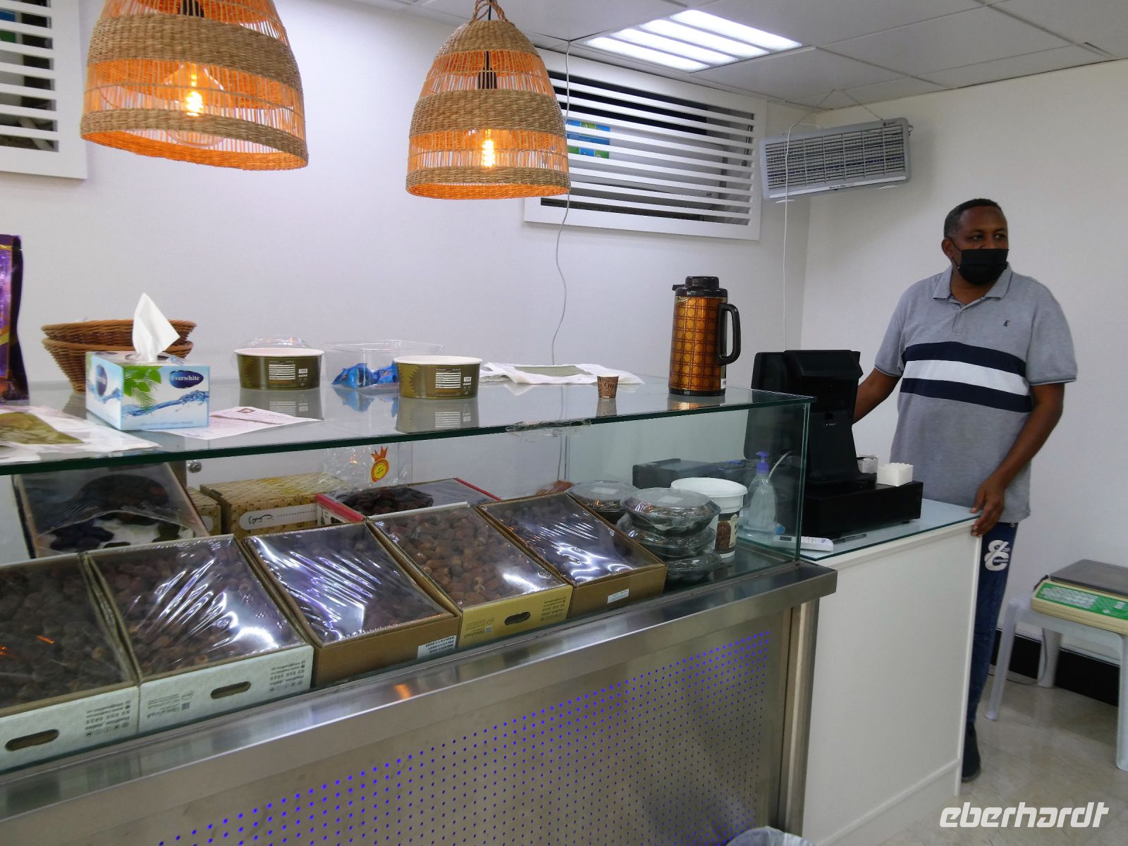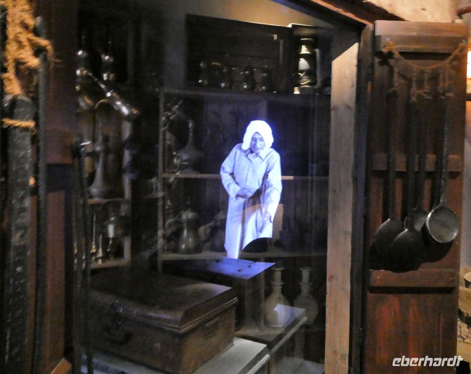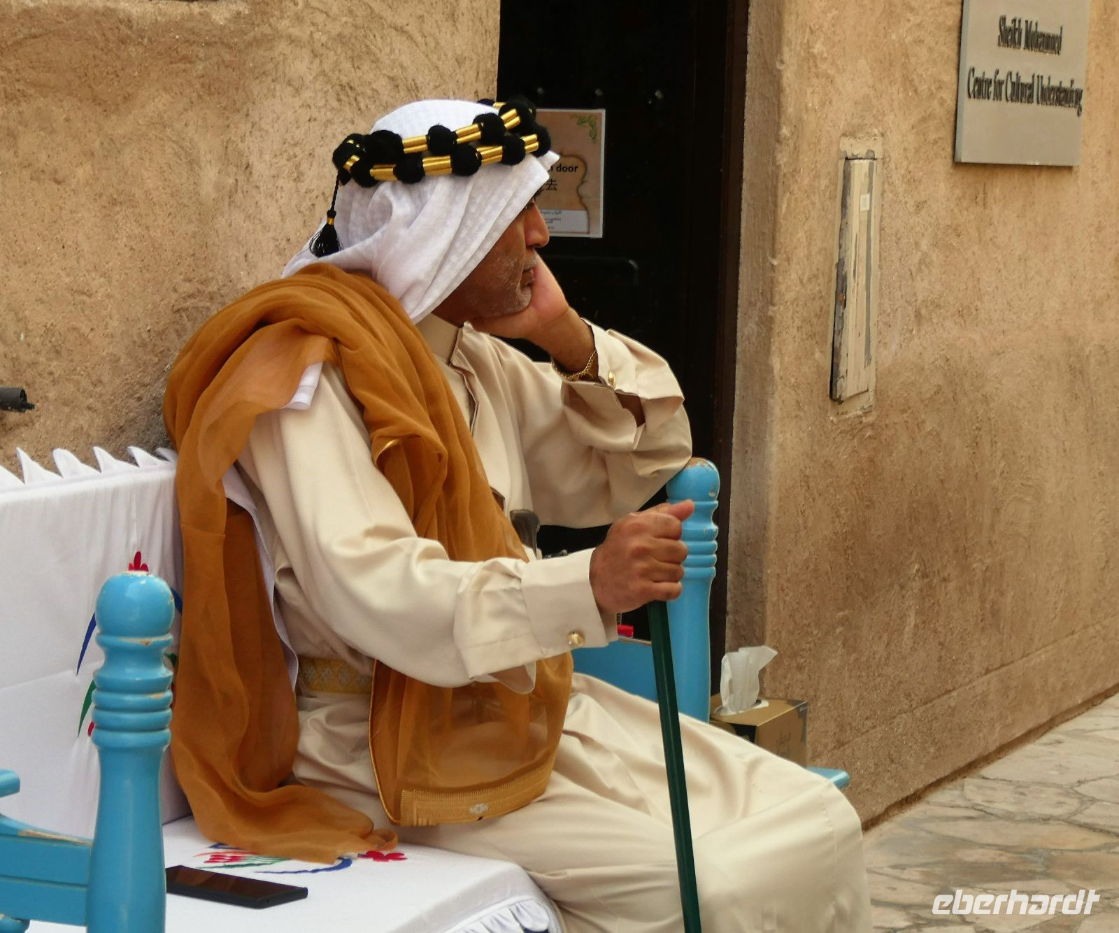 Wir besuchen ein Haus, welches die Wohnkultur und das Brauchtum vergangener Zeit (jedenfalls in Dubai) zeigt. Und in einem anderen Gebäude erhalten wir einen traditionellen arabischen Kaffee mit viel Kardamom und Zucker. Dazu gibt es Datteln, nahrhaft, süß und sehr gesund.