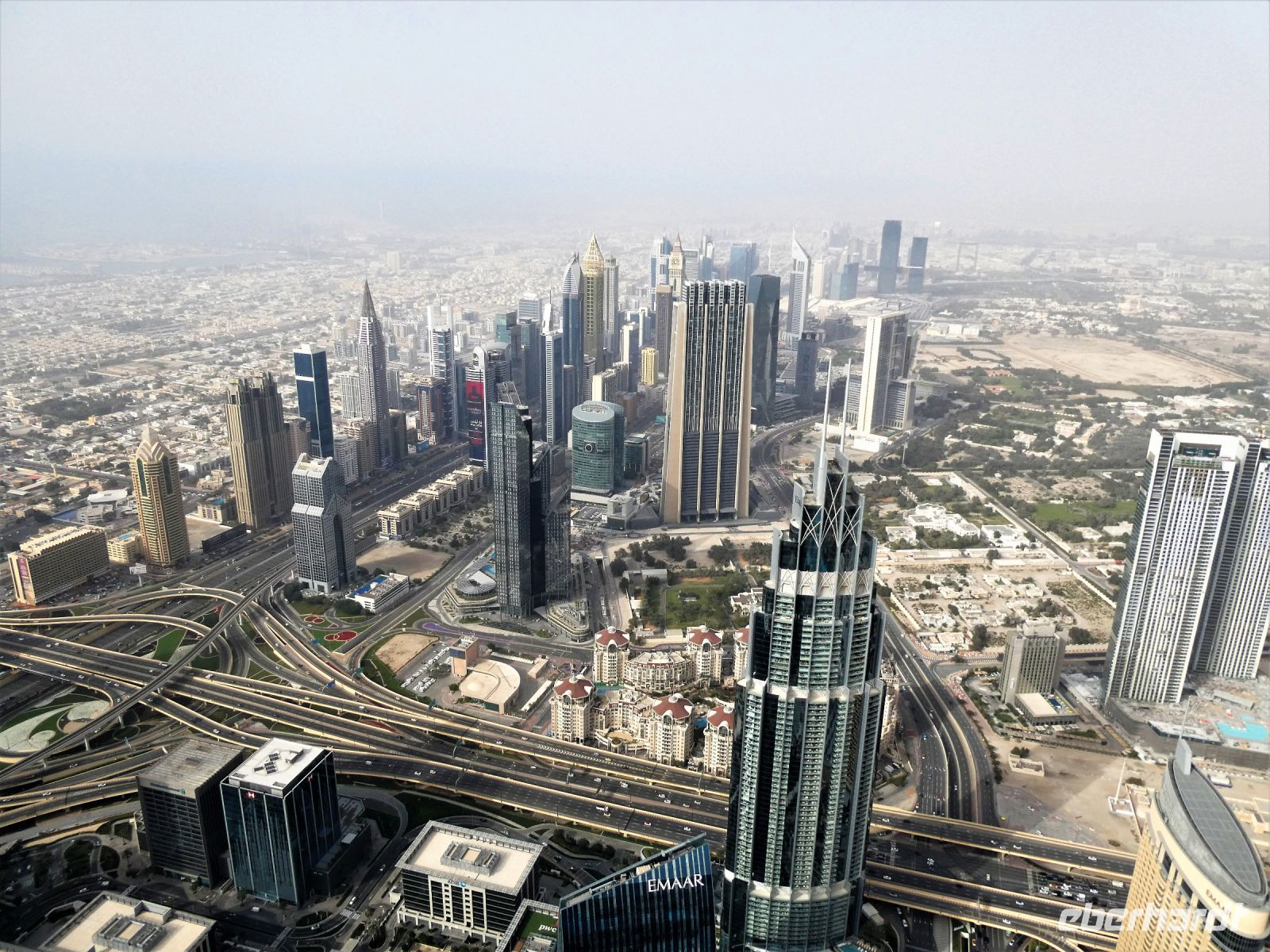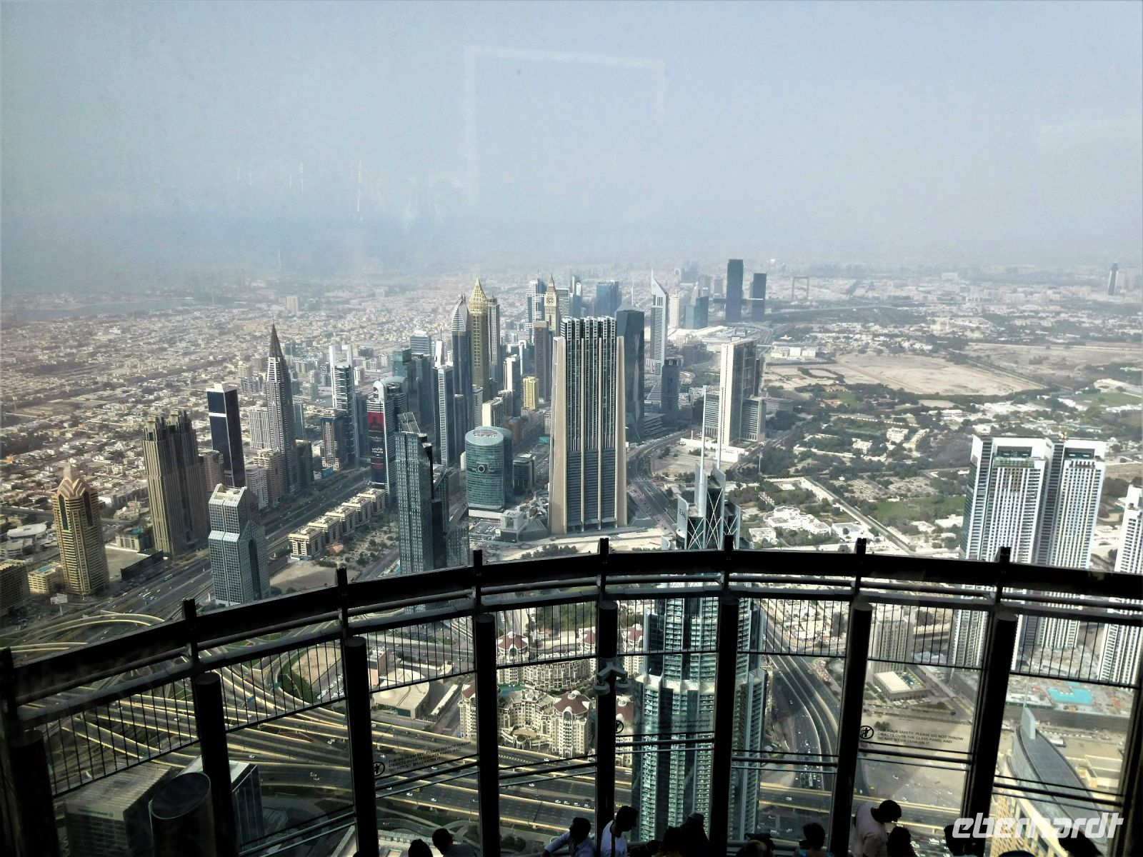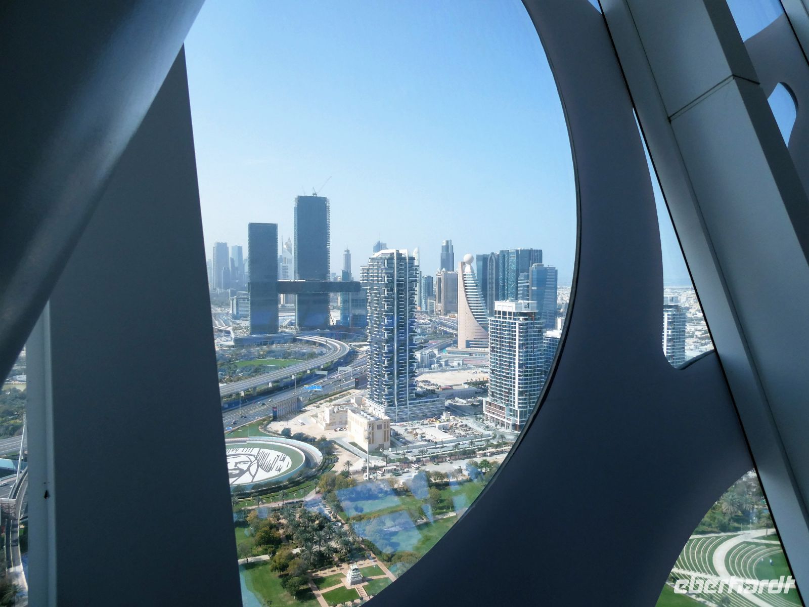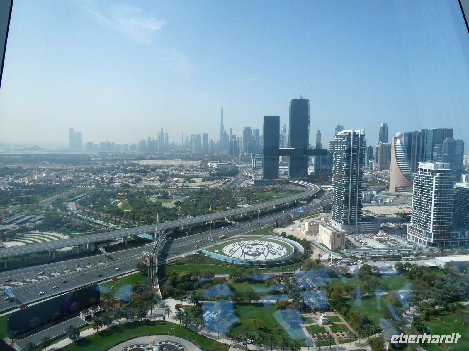 Wir fahren hinauf und haben oben ein wenig Zeit die Aussicht zu genießen: auf der einen Seite auf das moderne Dubai und auf der anderen Seite Deira mit dem älteren Teil der Stadt. Für Schwindelfreie gibt es auf der Brücke den Blick senkrecht auf den "Zabeel-Park".