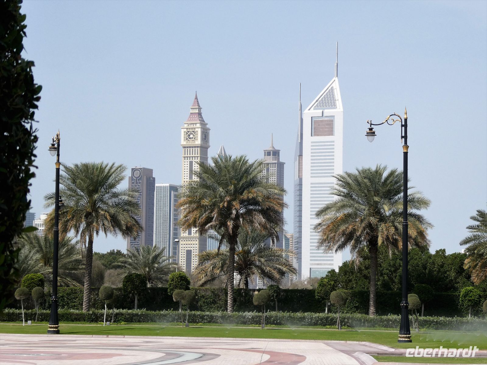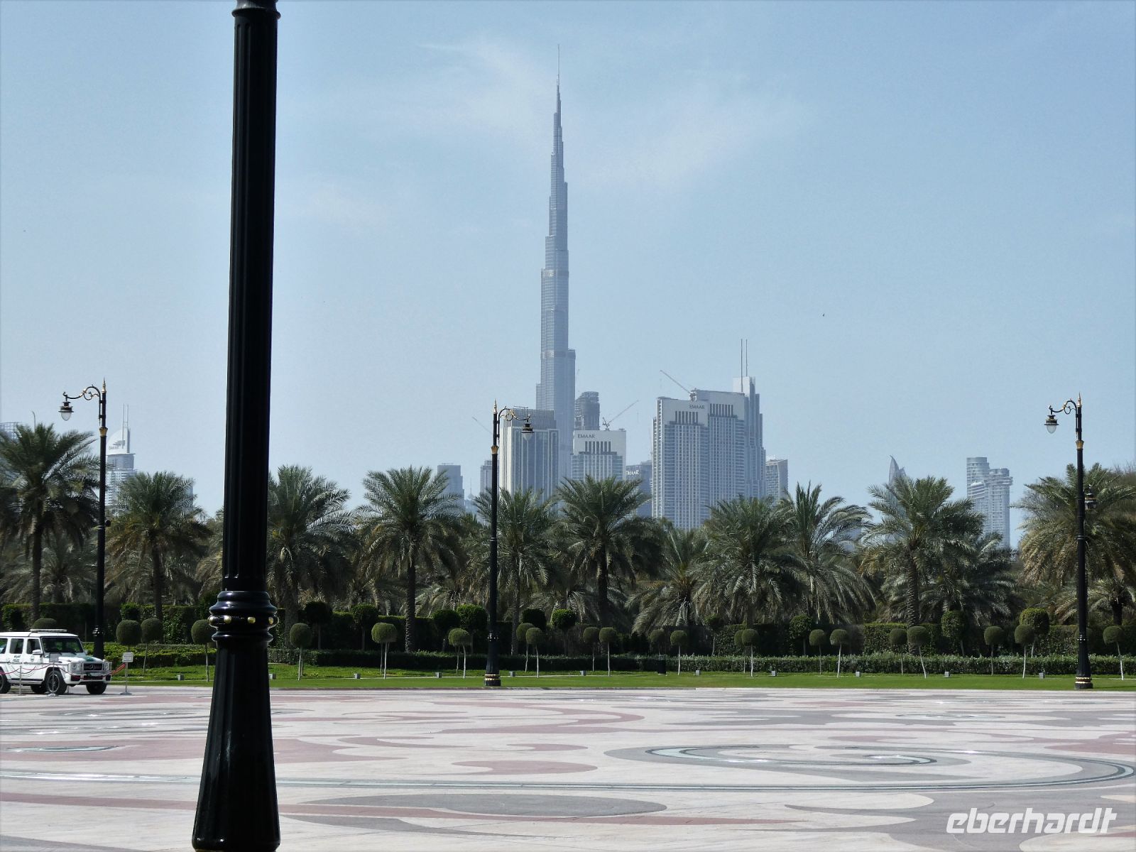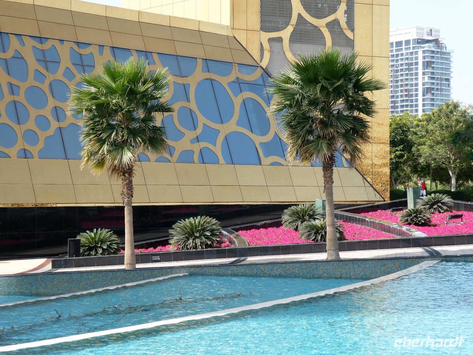 Wieder unten können wir noch ein wenig unter Palmen und Blumen verweilen. Auf unserem Weg zum Etihad Museum machen wir noch einen Abstecher zum Herrscherpalast von Dubai. Hier wohnt "Sheikh Hamdan bin Rashid Al Maktoum" und seine Familie. Er ist Herrscher des Emirats Dubai und Vizepräsident, Premierminister und Verteidigungsminister der Vereinigten Arabischen Emirate. In der letzten Zeit wurde auch in unseren Medien über ihn berichtet.