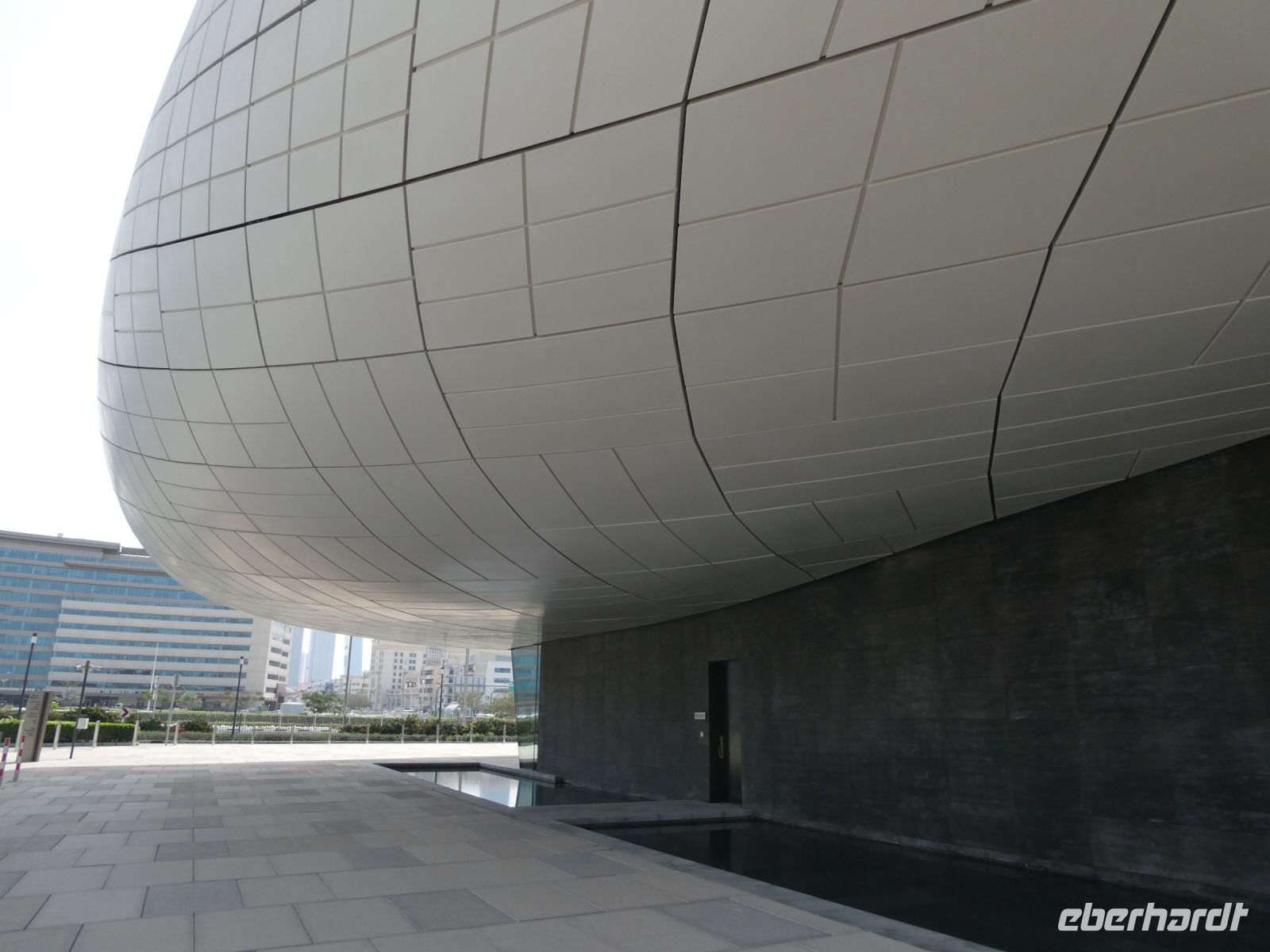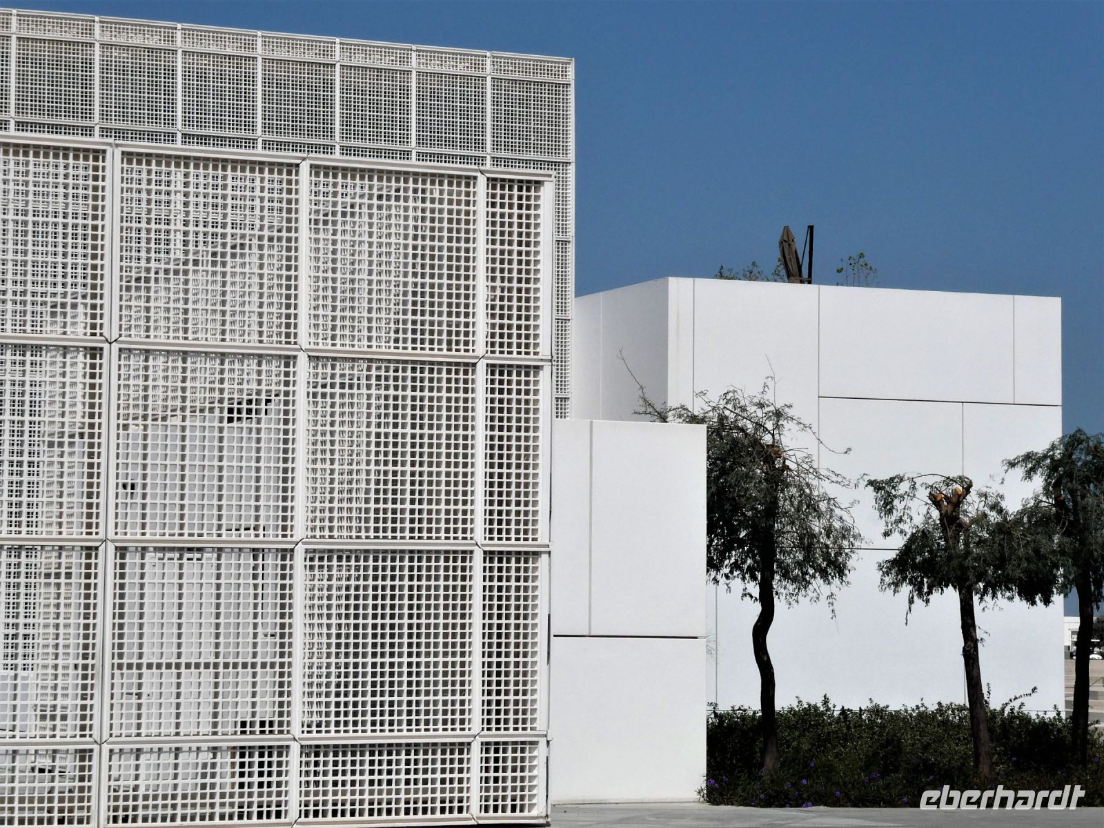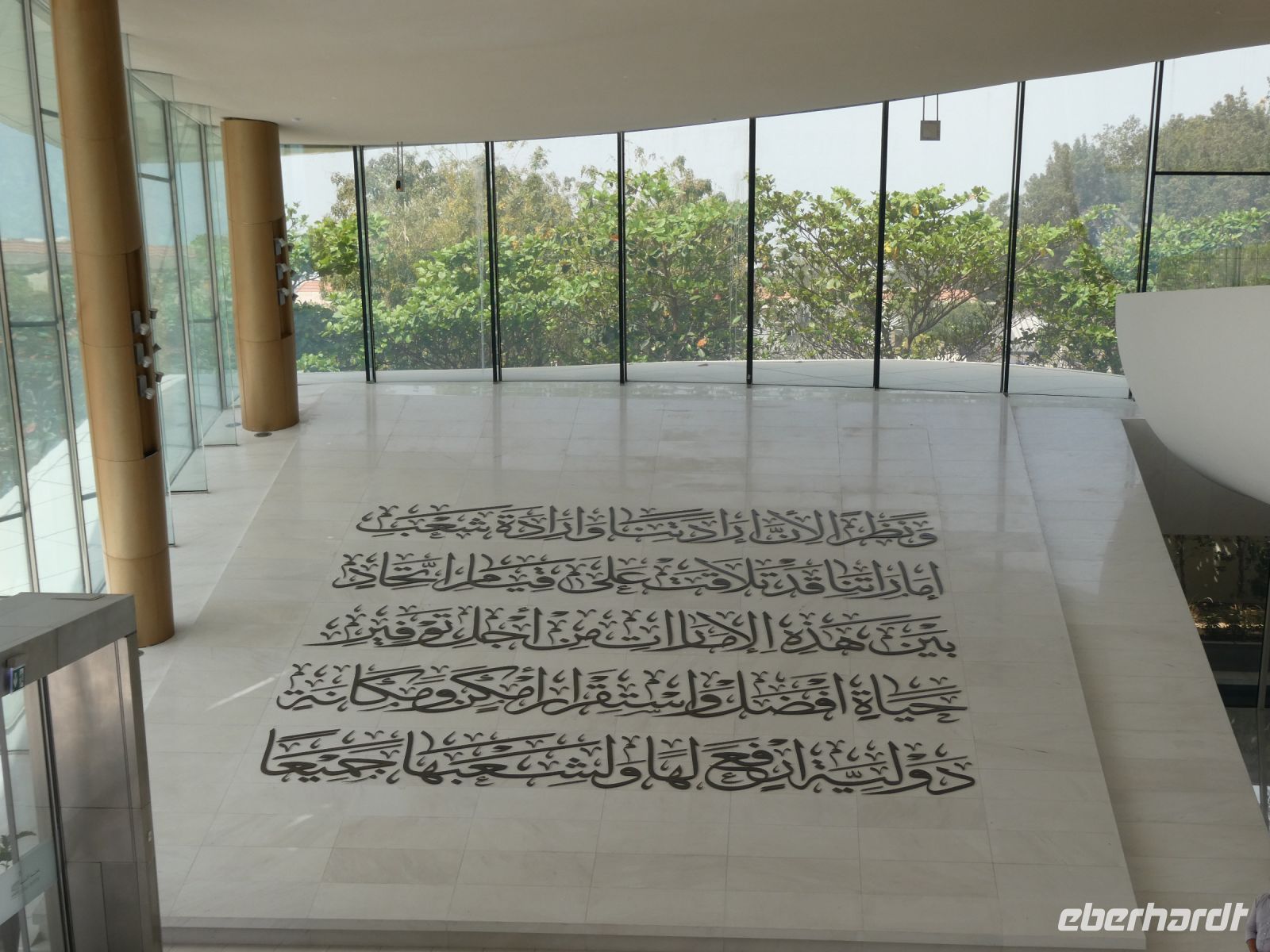 Die Idee bei dem Bau war, moderne Architektur mit der Tradition arabischer Bauten zu verbinden, so lautete der Auftrag des Bauherrn. Heraus kam ein faszinierendes Ensemble von 55 Quaderbauten, die von Wasserbecken umgeben sind. Das Ganze wird von einer 180 m im Durchmesser flachen Kuppel überragt. Diese Kuppelkonstruktion aus Metallsternen zaubert im Tagesverlauf immer wieder sich verändernde Reflexionen und Spiegelungen auf die Fläche und die Betrachter.