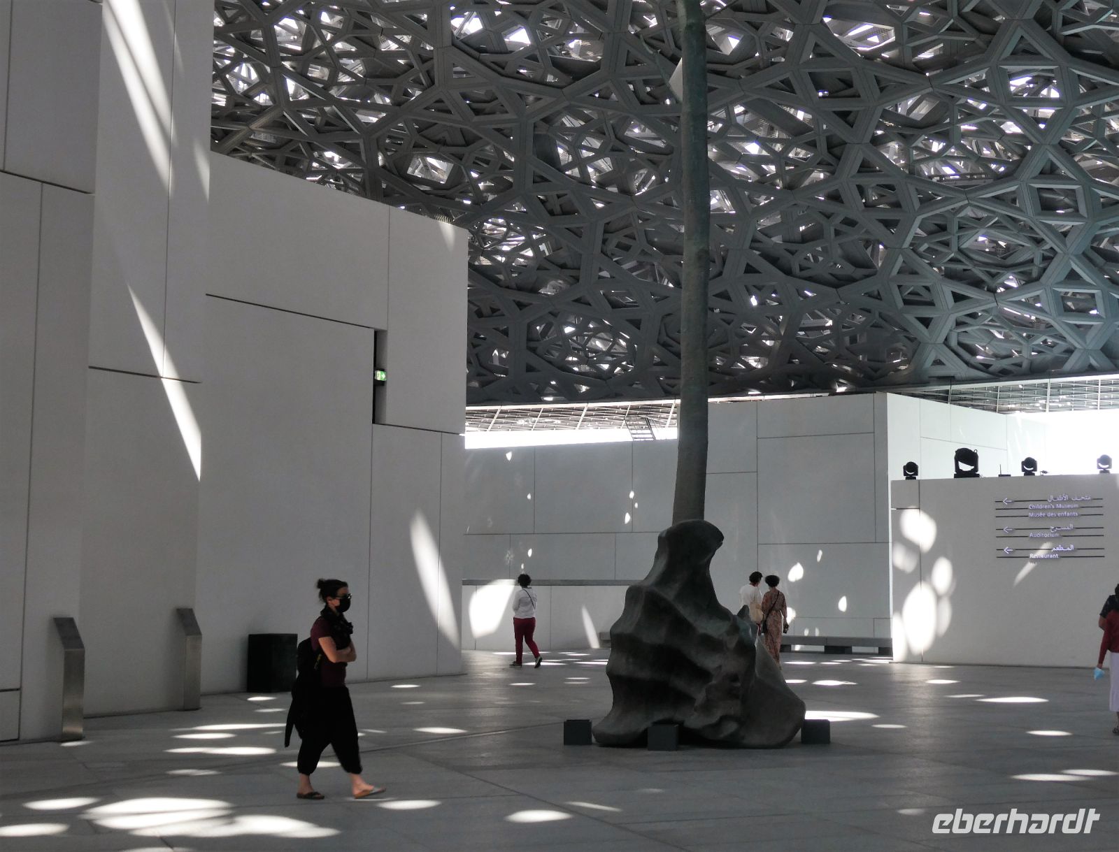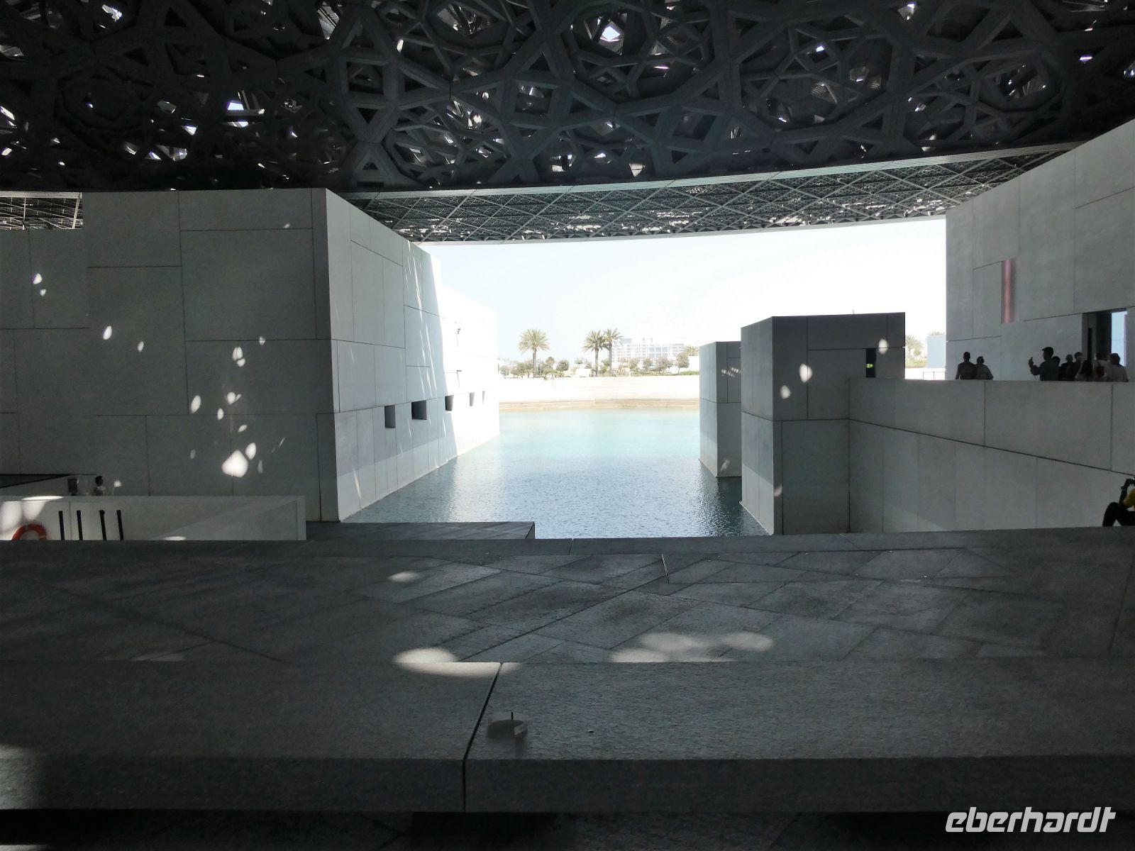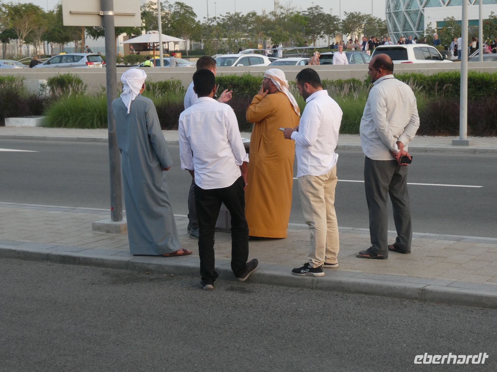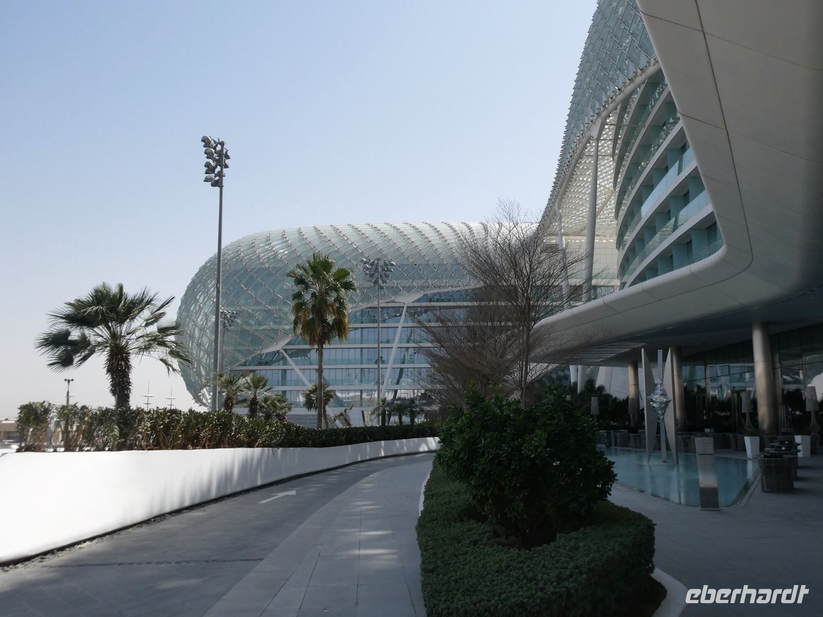 Auch unser erstes Ziel "Yas Island" ist eine Insel, welche auch als die Freizeitinsel bezeichnet wird. Hier finden sich zahlreiche Vergnügungen für die ganze Familie, wie die "Yas Waterworld" oder die "Warner Bros. World". Wir fahren vorbei an "Ferrari World" und gelangen zu unserem ersten Stopp des heutigen Tages, dem „Yas Marina Circuit“, der Formel 1 Rennstrecke. Sie wurde von dem deutschen Architekten Hermann Tilke kreiert und 2009 eröffnet. Auf der 5,182 km langen Strecke mit 16 Kurven wird alljährlich der "Große Preis von Abu Dhabi" ausgetragen. Futuristisch mutet die Zufahrt zu dem Luxushotel „W-Abu Dhabi“ an und auch das Hotel selber. Dort machen wir einen halbstündigen Fotostopp und nutzen das ganze für einen technische Pause. Dabei bekommen wir einen Eindruck von diesem Hotel des 21.Jahrhunderts. Ich fühle mich irgendwie in das „Raumschiff Enterprise“ versetzt. Von draußen vernimmt man die Fahrgeräusche zweiter Rennautos, denn die Rennstrecke kann auch von Besuchern genutzt werden. Die Wagenmiete kostet aber einiges. Nachdem wir genug geschaut und, nicht zu vergessen: gehört haben, setzen wir unsere Fahrt in Richtung unseres heutigen Hauptziels fort, dem „Louvre Abu Dhabi“ auf der Insel "Saadiyat".