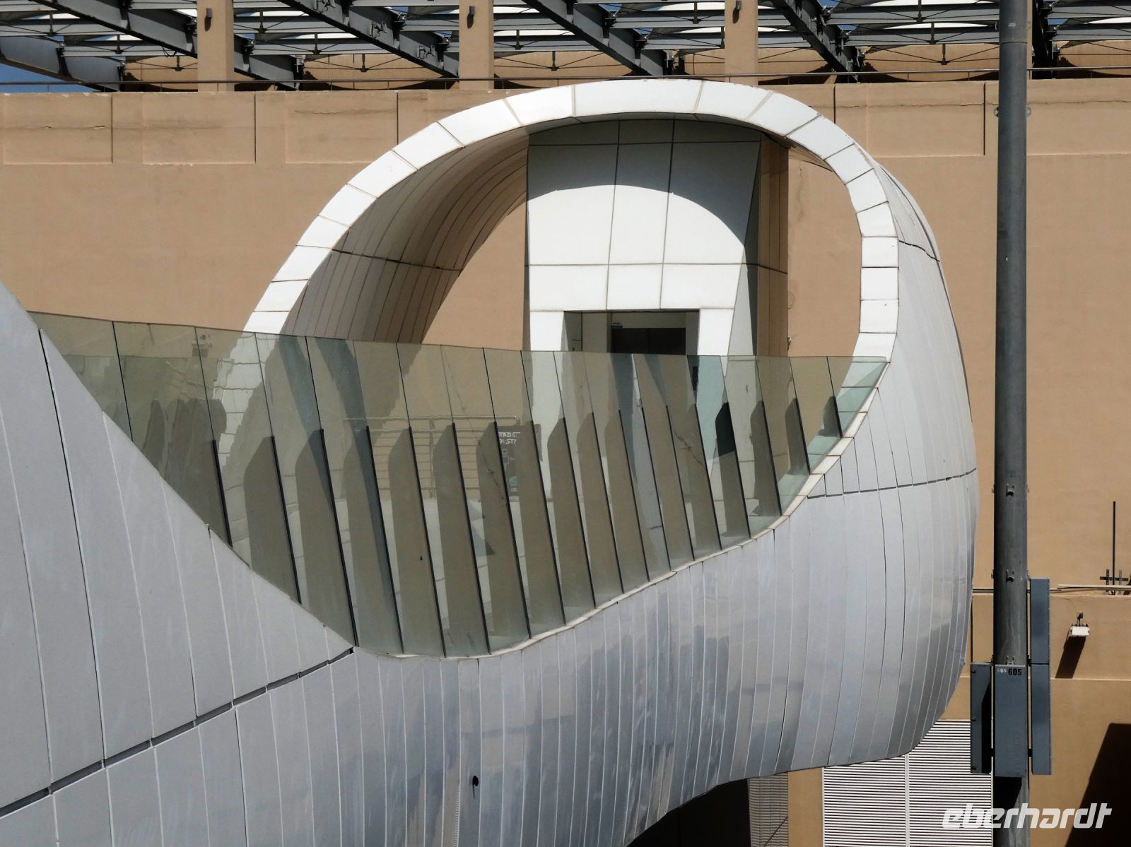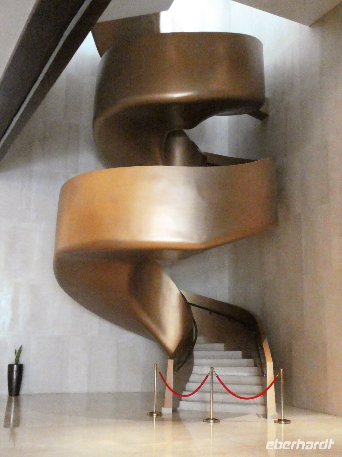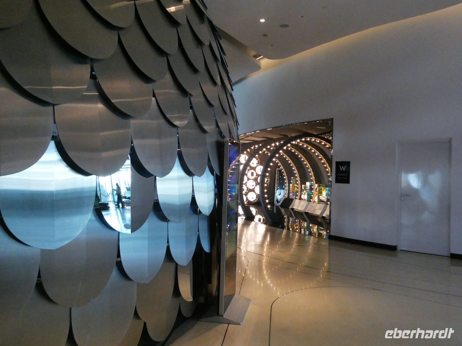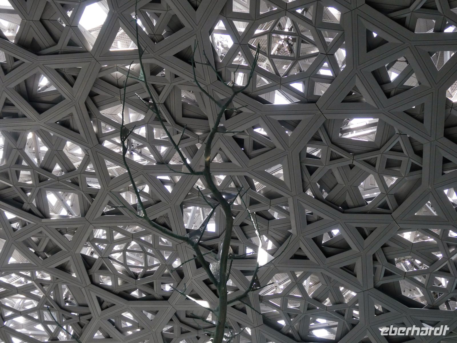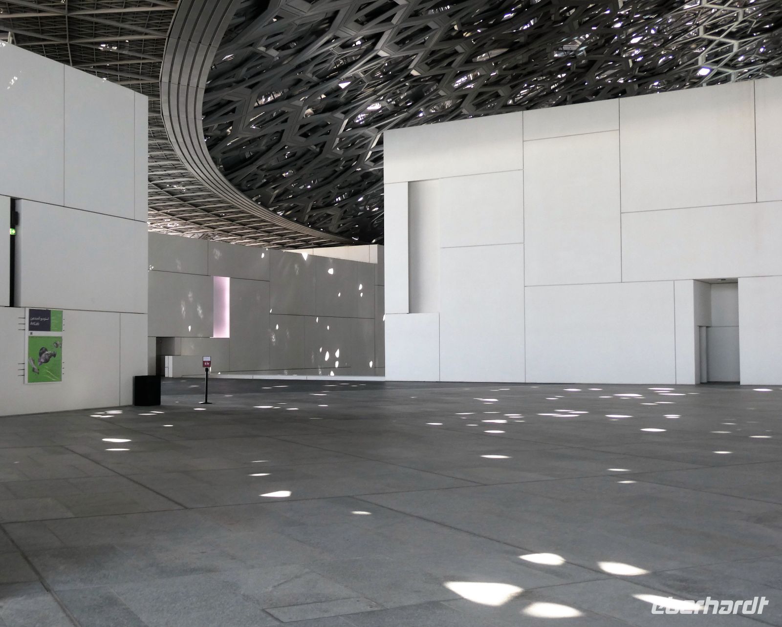 Auch unser erstes Ziel "Yas Island" ist eine Insel, welche auch als die Freizeitinsel bezeichnet wird. Hier finden sich zahlreiche Vergnügungen für die ganze Familie, wie die "Yas Waterworld" oder die "Warner Bros. World". Wir fahren vorbei an "Ferrari World" und gelangen zu unserem ersten Stopp des heutigen Tages, dem „Yas Marina Circuit“, der Formel 1 Rennstrecke. Sie wurde von dem deutschen Architekten Hermann Tilke kreiert und 2009 eröffnet. Auf der 5,182 km langen Strecke mit 16 Kurven wird alljährlich der "Große Preis von Abu Dhabi" ausgetragen. Futuristisch mutet die Zufahrt zu dem Luxushotel „W-Abu Dhabi“ an und auch das Hotel selber. Dort machen wir einen halbstündigen Fotostopp und nutzen das ganze für einen technische Pause. Dabei bekommen wir einen Eindruck von diesem Hotel des 21.Jahrhunderts. Ich fühle mich irgendwie in das „Raumschiff Enterprise“ versetzt. Von draußen vernimmt man die Fahrgeräusche zweiter Rennautos, denn die Rennstrecke kann auch von Besuchern genutzt werden. Die Wagenmiete kostet aber einiges. Nachdem wir genug geschaut und, nicht zu vergessen: gehört haben, setzen wir unsere Fahrt in Richtung unseres heutigen Hauptziels fort, dem „Louvre Abu Dhabi“ auf der Insel "Saadiyat".