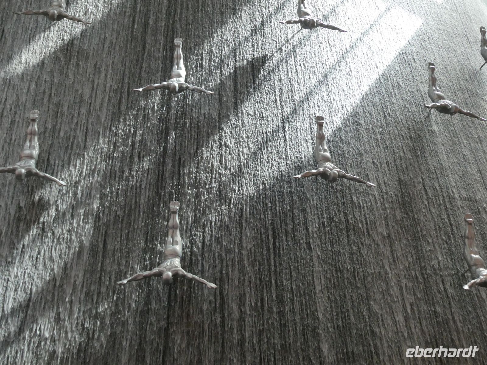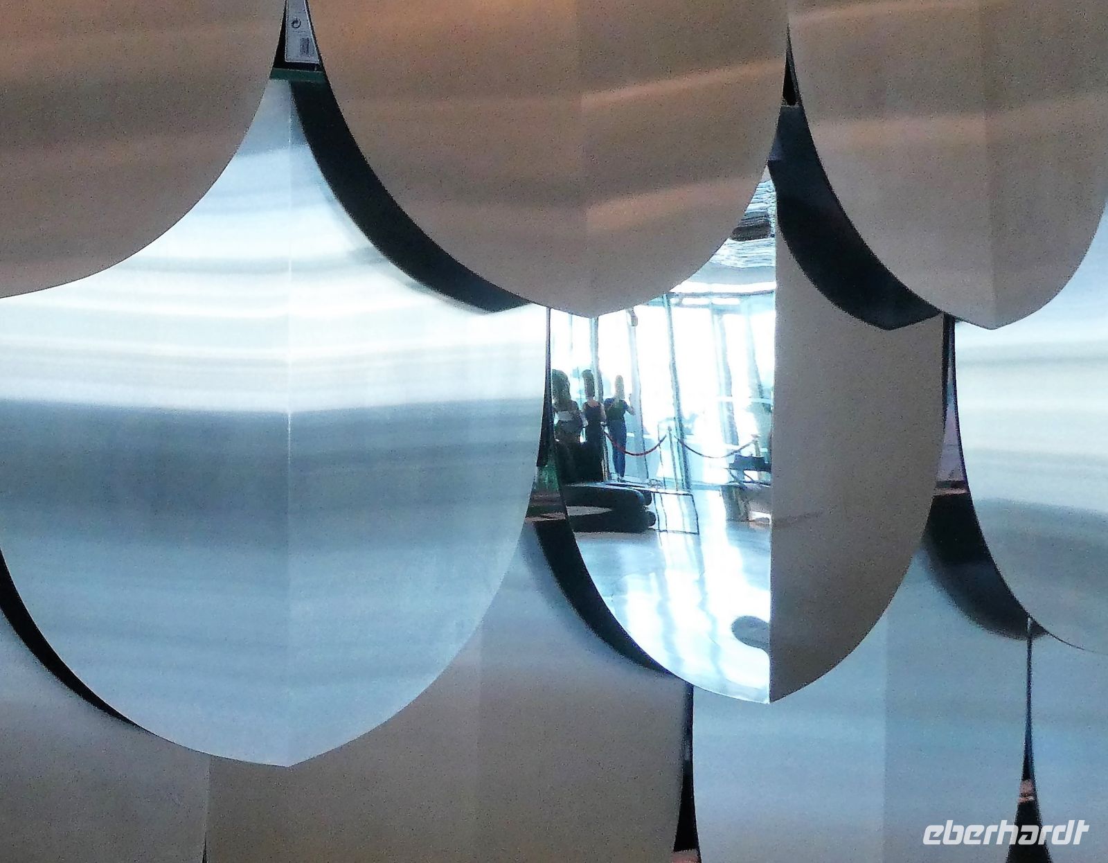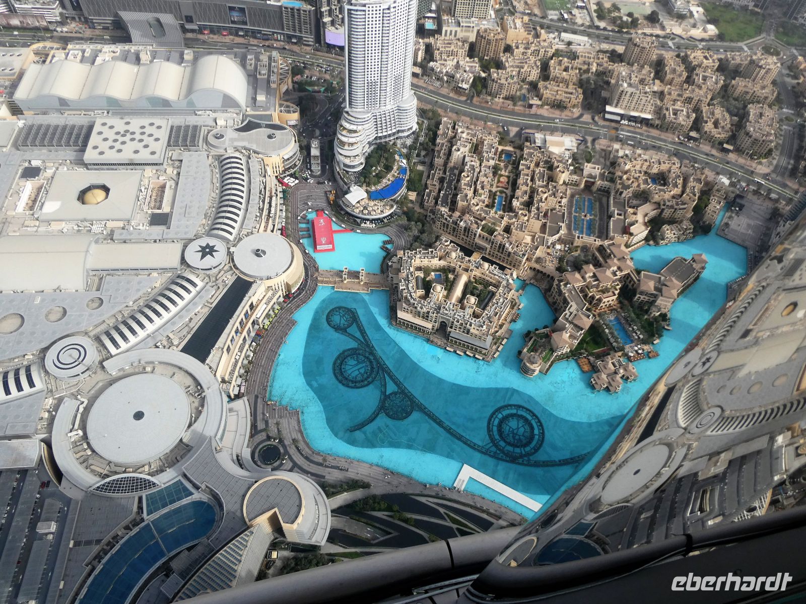 Vorher machen wir in der "Dubai Mall" eine kleine Pause und dann geht es nach oben in die 148. Etage wo man von einer Aussichtsplattform im Freien einen grandiosen Ausblick hat. Wir befinden uns in fast 500 m Höhe über 0. Die höchste bewohnte Etage liegt auf fast 600 m. Da soll man die Bodenhaftung nicht verlieren. Die Fahrt nach unten stellt sich für einige etwas abenteuerlich dar, geht es doch für einige nicht in einem "Rutsch" sondern ist mit Umsteigen verbunden. Aber letztendlich landen alle wieder auf dem Boden der Realität und die heißt: wir treffen uns im "Souk Al Bahar". Nun Souk heißt ja eigentlich Markt. Aber diese großen Einkaufsmalls haben eigentlich nicht mehr so viel mit dem Souk orientalischer Prägung zu tun. Dort wurde gehandelt und gefeilscht und die Farben des Orients vermischten sich mit den angenehmen und auch unangenehmen Gerüchen tierischer oder auch anderer Herkunft. Hier im Souk Al Bahar geht alles ordentlich und gesittet zu.