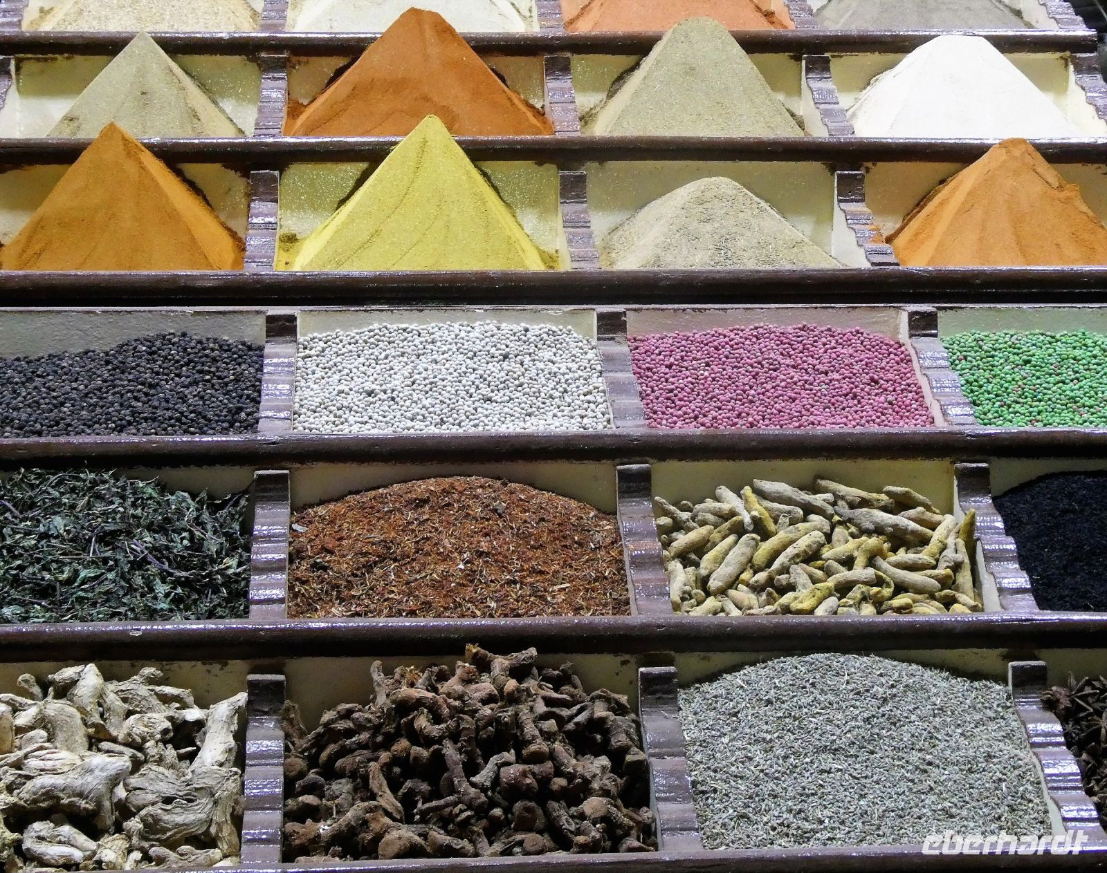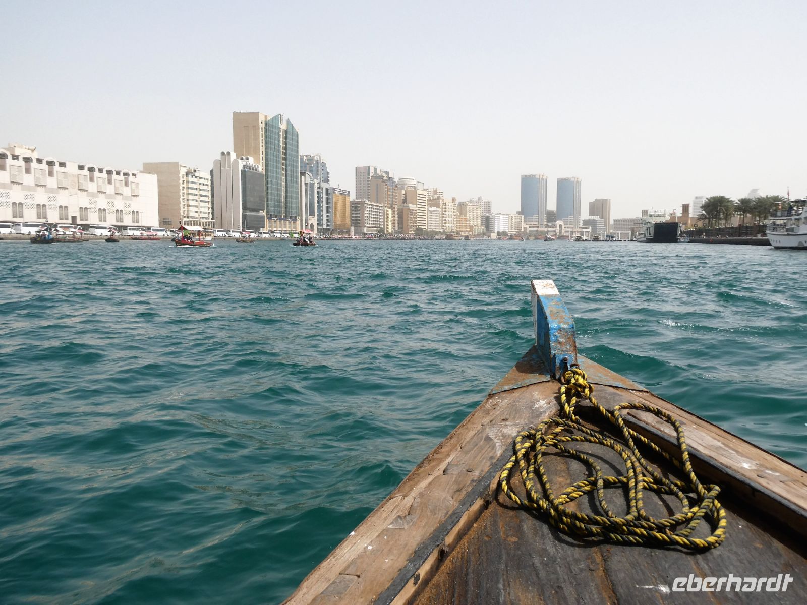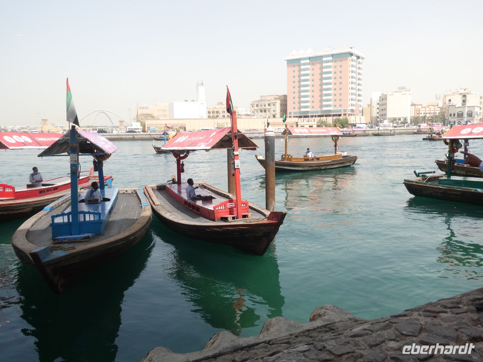 Wir fahren mit einer traditionellen Abra, einem Wassertaxi, auf die andere Seite des Creek. Bei einem Gewürzhändler werden uns verschiedene Gewürze erklärt, die besonders in der orientalischen Küche Verwendung finden. Dafür, dass diese Gewürze ihren weiten Weg von Fernost nach Arabien und damit auch nach Europa fanden, sorgten schon seit dem Mittelalter Kaufleute die damit in historischen Zeiten zu Reichtum gelangten. Reich werden die Indischen oder pakistanischen Händler mit Safran heute nicht mehr. Sie sichern sich aber ein Einkommen in diesem Land. Denn Gewürze sind bei allen Bewohnern aber auch bei den Reisenden als Mitbringsel begehrt. In unserer Gruppe erfreuen sich Muskatnüsse besonderer Beliebtheit. Ob meine Mitreisenden wissen, dass man sich mit Muskatnüssen einen Rausch verschaffen kann? Für Gewürze gilt, wenig ist Arznei, ein Zuviel führt bei einigen Gewürzen zum Tod, wie z.B. beim Safran, der auch als Heilmittel verwendet wird.