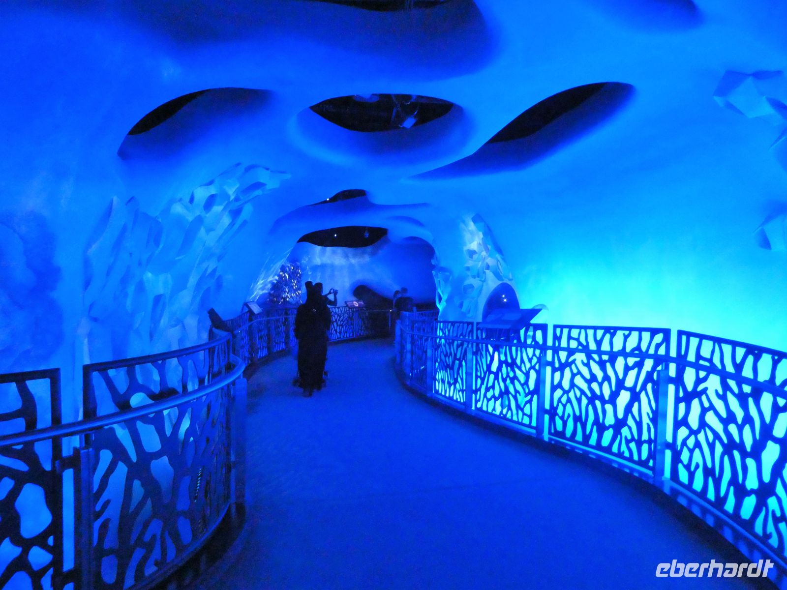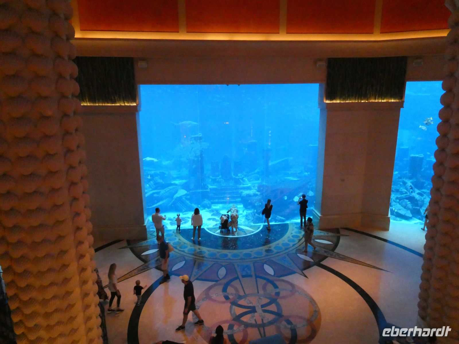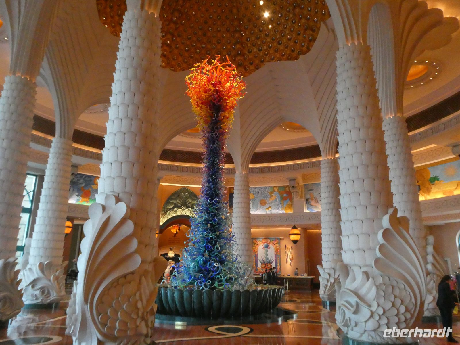 Wir fahren in Richtung "Madinat Jumeira" und können uns wohl eines der attraktivsten Hotels Dubais, das "Burj al Arab" aus der Nähe betrachten. Die Geschäfte der Mall sind sehr luxuriös und wir haben nach einer Kaffeepause ein wenig Zeit, Geld auszugeben. Natürlich nur wer möchte. Hier sind die Angebote in den Geschäften von sehr guter Qualität und so gibt es den einen oder anderen Kauf. Nach diesem kleinen Bummel wird es Zeit die Abfahrtstation der Monorail aufzusuchen. Sie wird uns auf die schon erwähnte Palminsel bringen, zum Atlantis-Hotel, wo wir zu Abend essen werden. Ruhig gleitet die Monorail in kurzer Zeit auf die künstlich angelegte aus dem Meer geschaffene Insel. Wir können die in der Ferne neu entstandenen Hotelkomplexe betrachten oder diejenigen welche noch im Baus sind. Dann am Eingang des riesigen Hotelkomplexes werden wir wie durch einen Erlebnisparcour vorbei an spektakulären Dekorelementen in einen Bereich geleitet, in dem sich ein riesiges Aquarium befindet. Haie, Rochen und bunte Seefische des Arabischen Meers gleiten vorbei. Schließlich landen wir im Restaurant. In einem riesigen Saal sind die überbordenden Buffets angerichtet. Thema ist heute: Asien. Es gibt so ziemlich alles was das Asien liebende Herz begehrt: indische Currys, Pekingente, Sushi, Seefood etc. Wo fängt man am besten an? Aber schließlich können wir diese schwierige Aufgabe bewältigen. Wir bekommen einen Tisch im Freien und niemand steht letztendlich hungrig vom Tisch auf. Voll der köstlichen Speisen treten wir mit dem Bus unsere Heimreise ins Hotel an.