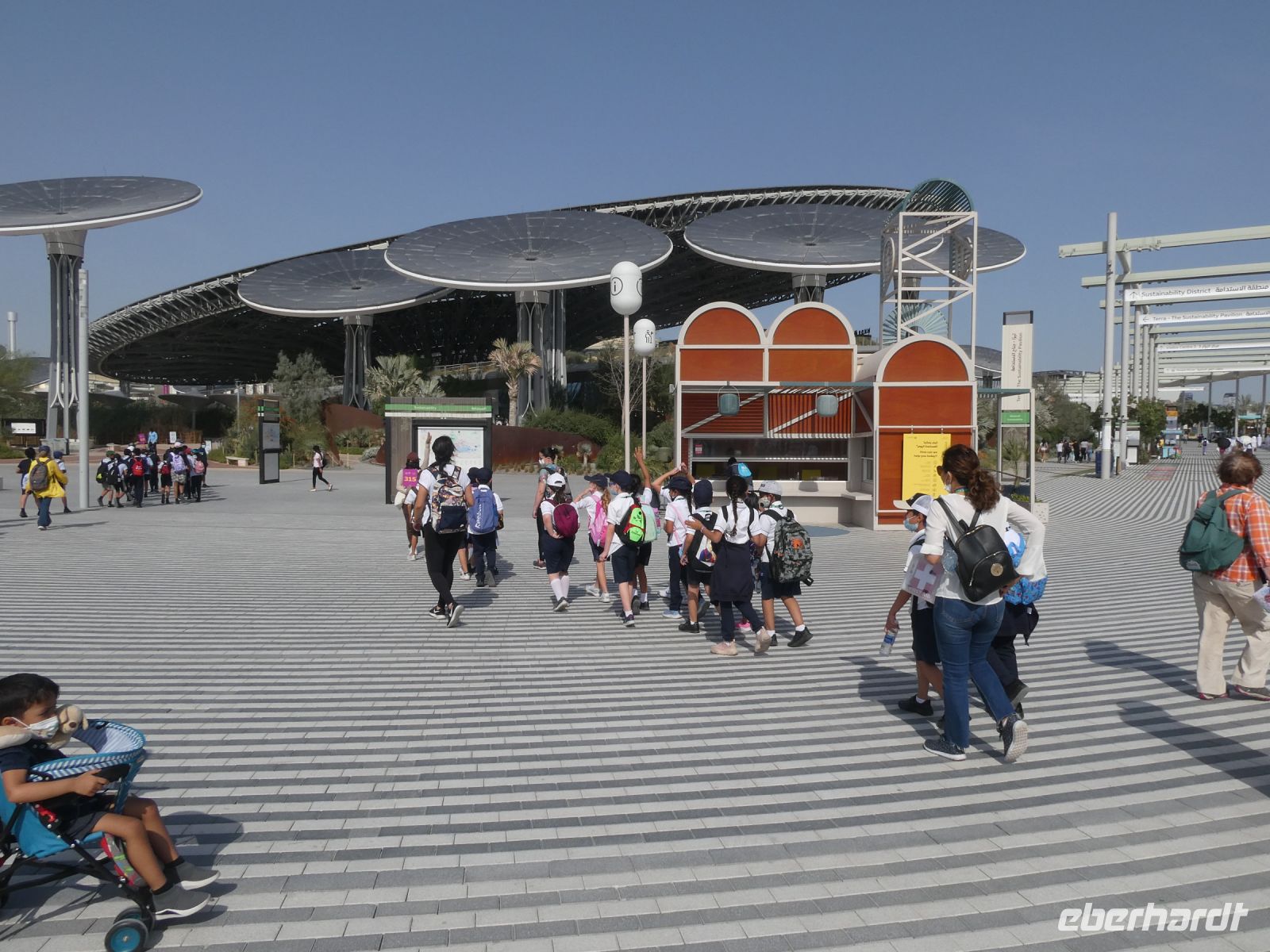 Heute nach dem Frühstück geht es schon am Morgen auf die EXPO. Zu dieser Tageszeit ist eine ganz andere Atmosphäre. Viel junges Volk ist zu sehen. Schulklassen frühstücken am Eingang in einem gesonderten Bereich. Und dann geht es weiter mit dem Lehrer oder der Lehrerin zu den einzelnen Pavillons. Die Erlebnisbereiche der Expo sind voll und überall ist etwas los. Schulklassen der verschiedenen Altersstufen die mit Schulbussen hierher gebracht werden. Es stimmt mit den 200 Nationalitäten, die in Dubai leben. Deren Kinder müssen die Schule besuchen.