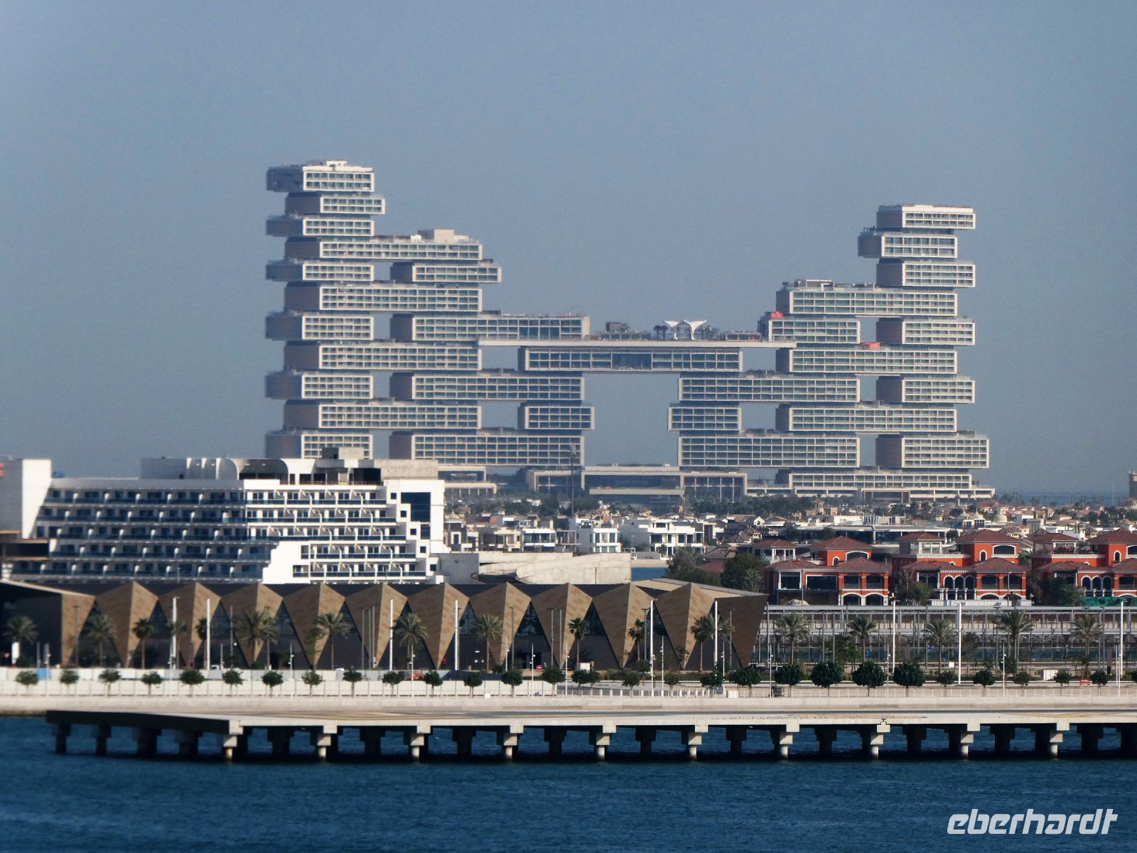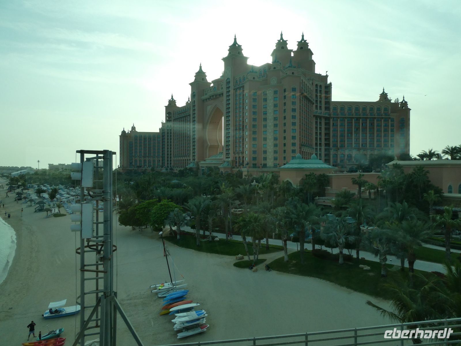 Wir fahren in ca. 90 Minuten hinaus in Richtung Hotel Atlantis und können diesen riesigen Hotelkomplex vom Meer aus betrachten. Das Hotel welches 2008 eröffnet wurde hat die versunkene Stadt Atlantis zum Thema und steht an der Spitze der Palm Jumeirah, einer der künstlich erschaffenen Palmeninseln Dubais. Die Anlage ist durch einen Unterwassertunnel mit dem PKW oder Bus oder mit der Dubai Monorail zu erreichen. Wir werden morgen dort zu Abend essen.