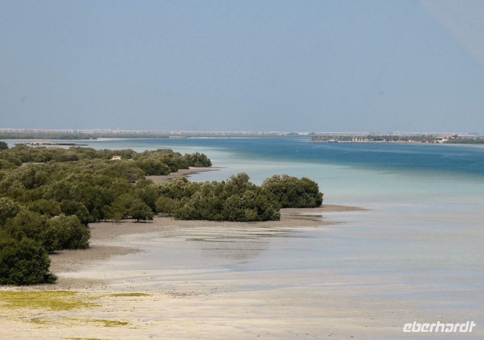 Seit gestern wissen wir, dass unsere Testergebnisse für Corona alle negativ sind. Positiv für uns, denn damit dürfen wir alle nach Abu Dhabi fahren. Nach dem Frühstück geht es los und schon nach einer Stunde bekommen wir eine Ahnung von der sehr unterschiedlichen Landschaft im Gegensatz zu Dubai. Lange Strände ziehen sich an der Küste entlang. Wir nähern uns Abu Dhabi welches aus mehr als 200 Inseln besteht. Man hat hier sogar einen Mangroven-Nationalpark angelegt, der erst 2020 eröffnet wurde. Offenbar verträgt die eher in tropischen Gebieten beheimatete Mangrove das Klima hier ganz gut.