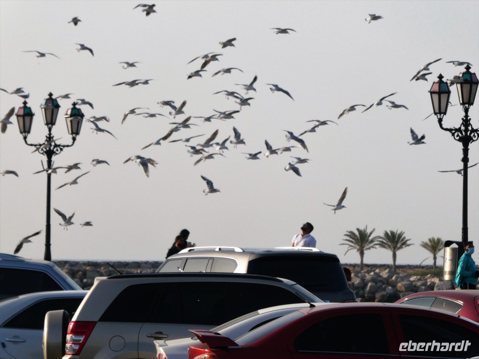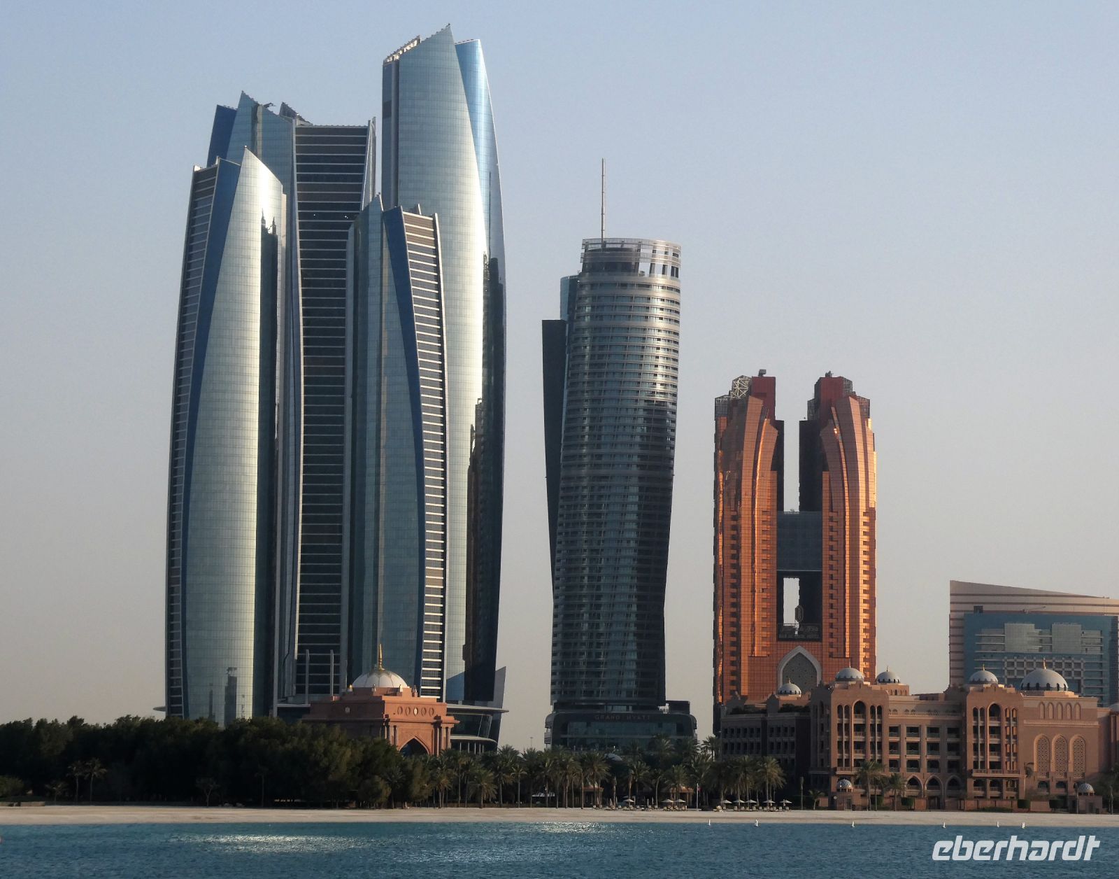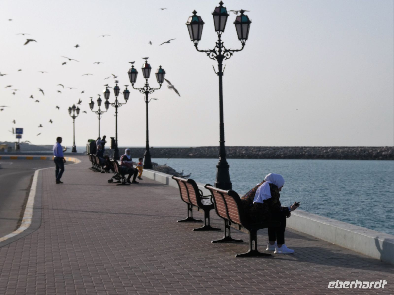 Am späten Nachmittag geht es dann gleich weiter zur sog. „Abu Dhabi Corniche“. Hier kommen Gäste und Einheimische am Nachmittag her um ein wenig zu Entspannen. Wir spazieren entlang der Promenade und werfen einen Blick auf die Skyline der „Etihad-Towers“. Ein Paar welche sich erfolgreich mit dem Parasailing versuchen, schwebt vor unsere Fotografenlinsen.