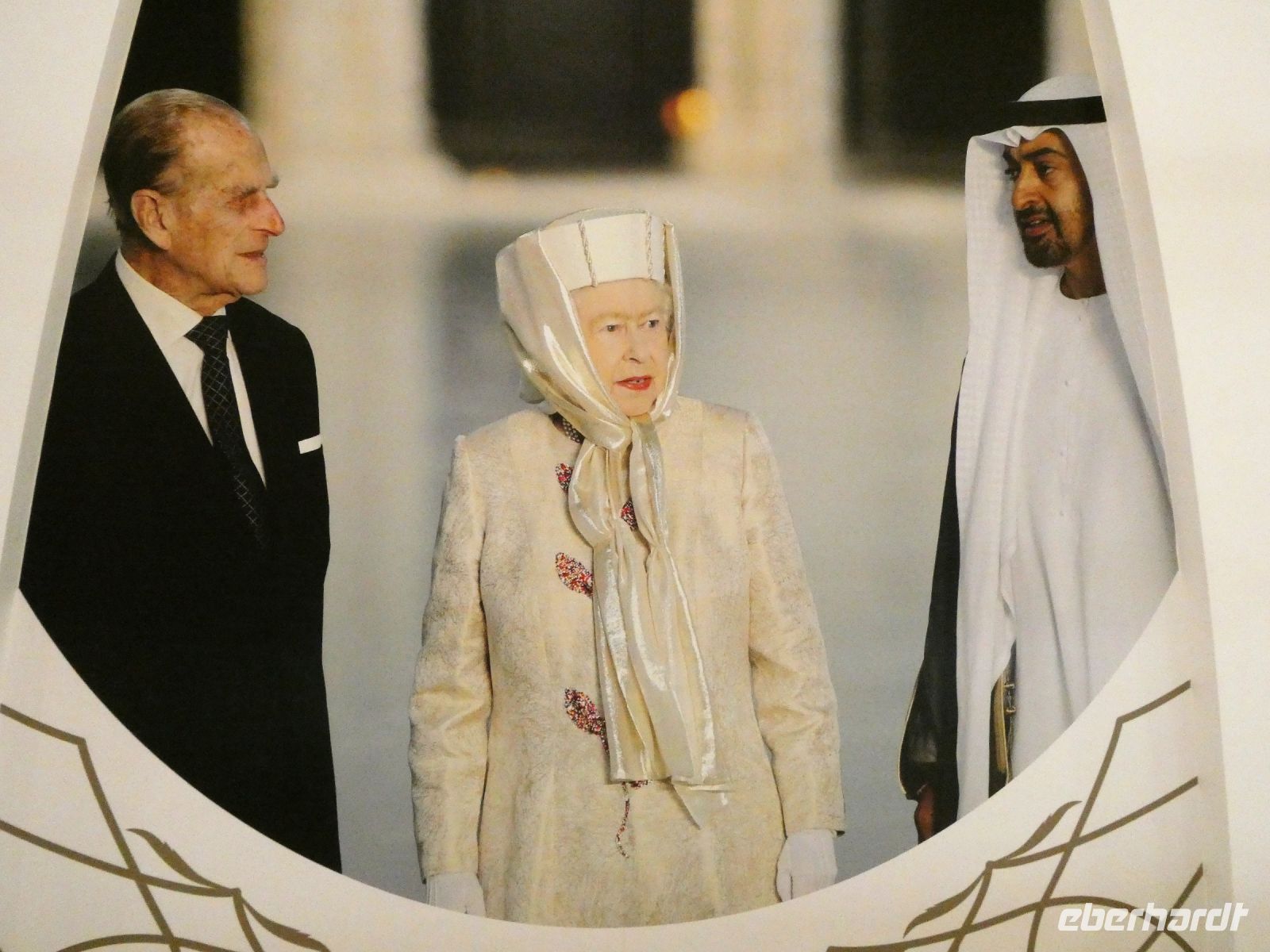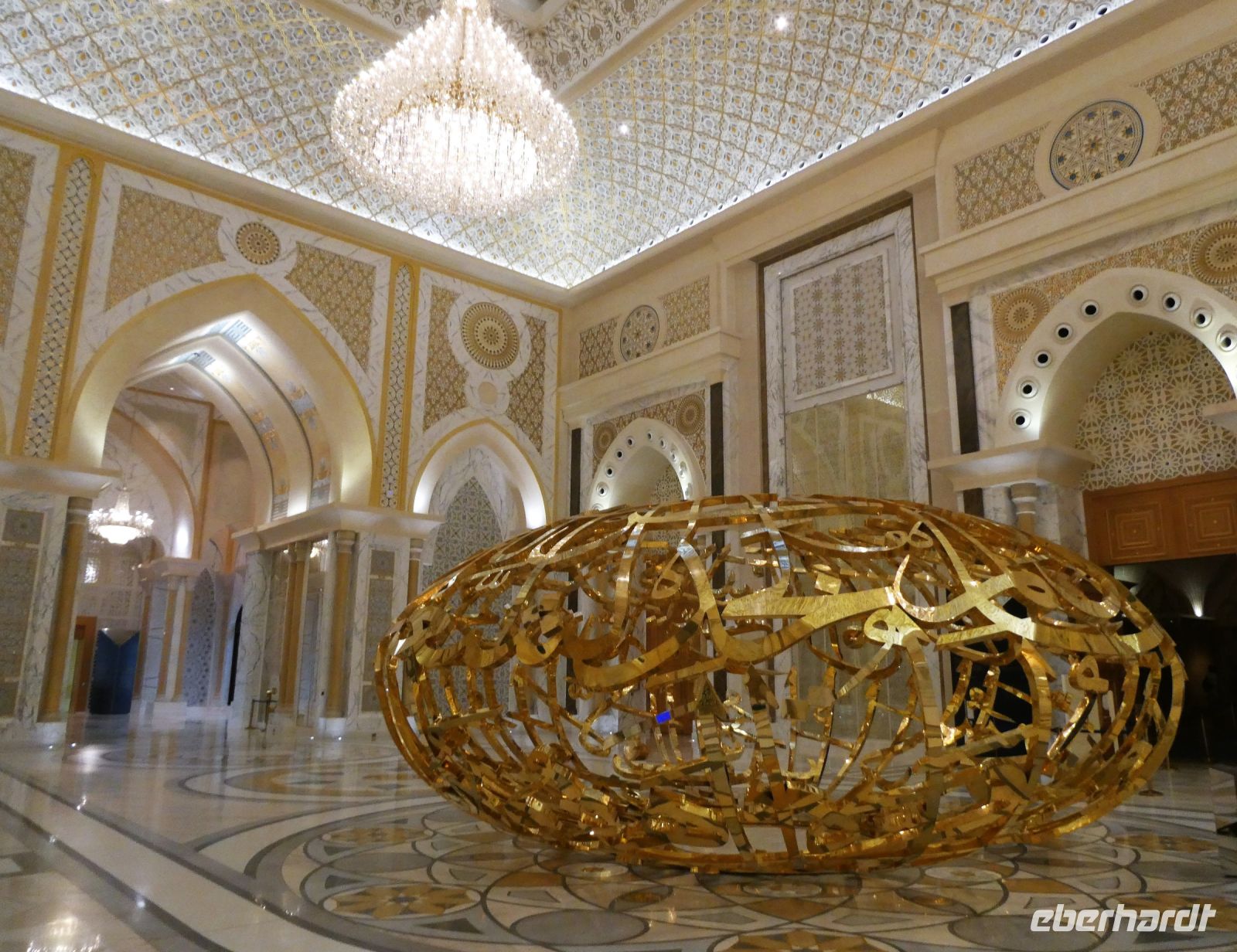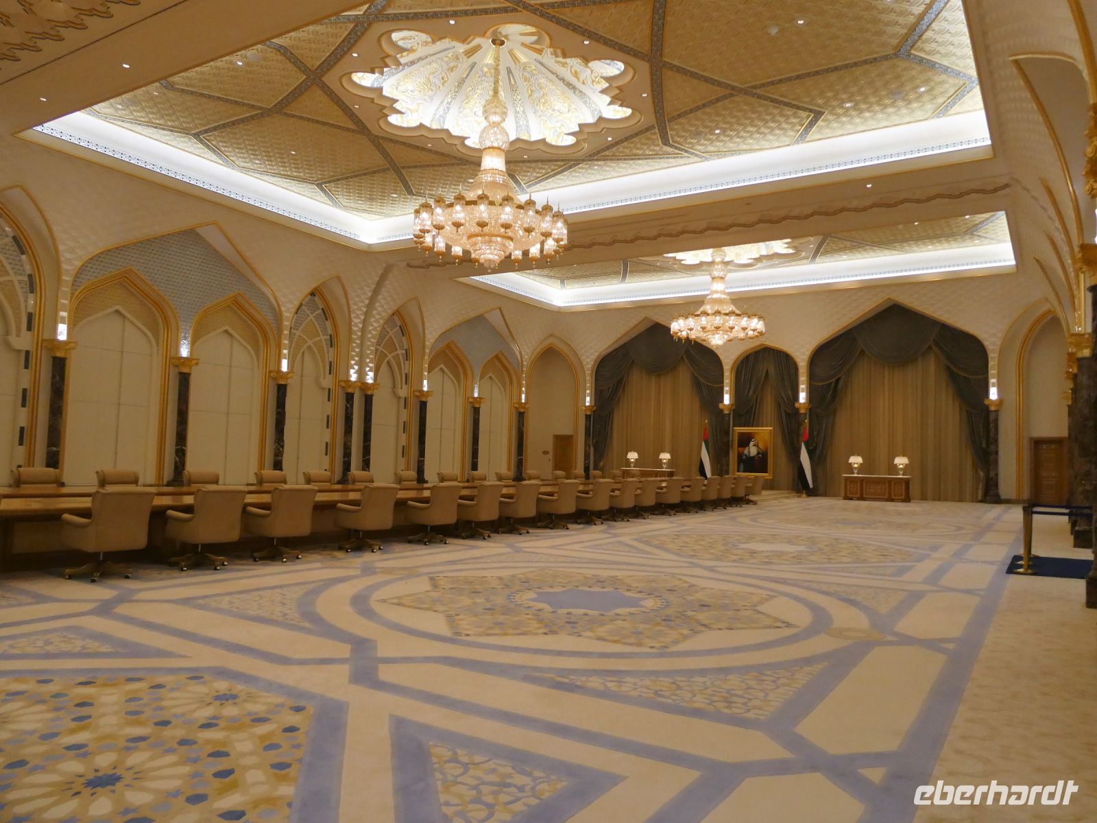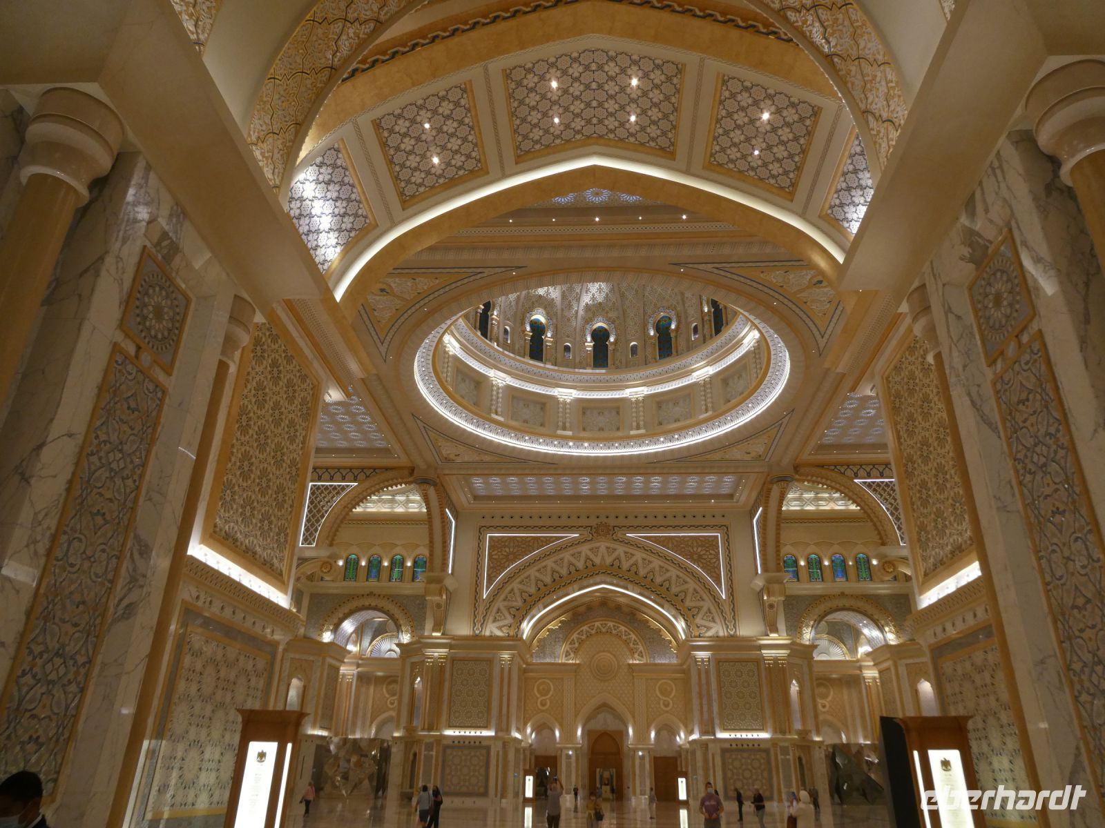 Dorthin fahren wir jetzt für eine Besichtigung. Wir haben Glück, denn es haben sich für heute keine Staatsgäste angemeldet. In diesem Fall wäre der Palast für die Öffentlichkeit gesperrt. Der Palast ist auch Sitz des Kabinetts und des Obersten Gerichtshofs der VAE. Es befinden sich hier alle offiziellen Büros der obersten Herrscher. Ein Prachtbau in Weiß und Gold. Die Fassade ist aus weißem Granit und Kalkstein gebaut. Die Farbe weiß soll dabei Reinheit und Freiheit symbolisieren. Die Marmorwände zeigen florale und geometrische Muster. Herausragend sind ebenfalls die Kronleuchter und die riesige Kuppel der „Großen Halle“ misst 37 m im Durchmesser. Schweigend und staunend durchlaufen wir die einzelnen Räume die für sich sprechen. Das ganze zeigt auch eine Sammlung von Dokumenten und Antiquitäten aus der arabischen Welt. Die Bibliothek kann sich sehen lassen.