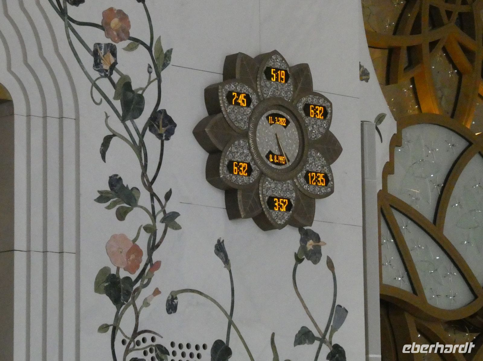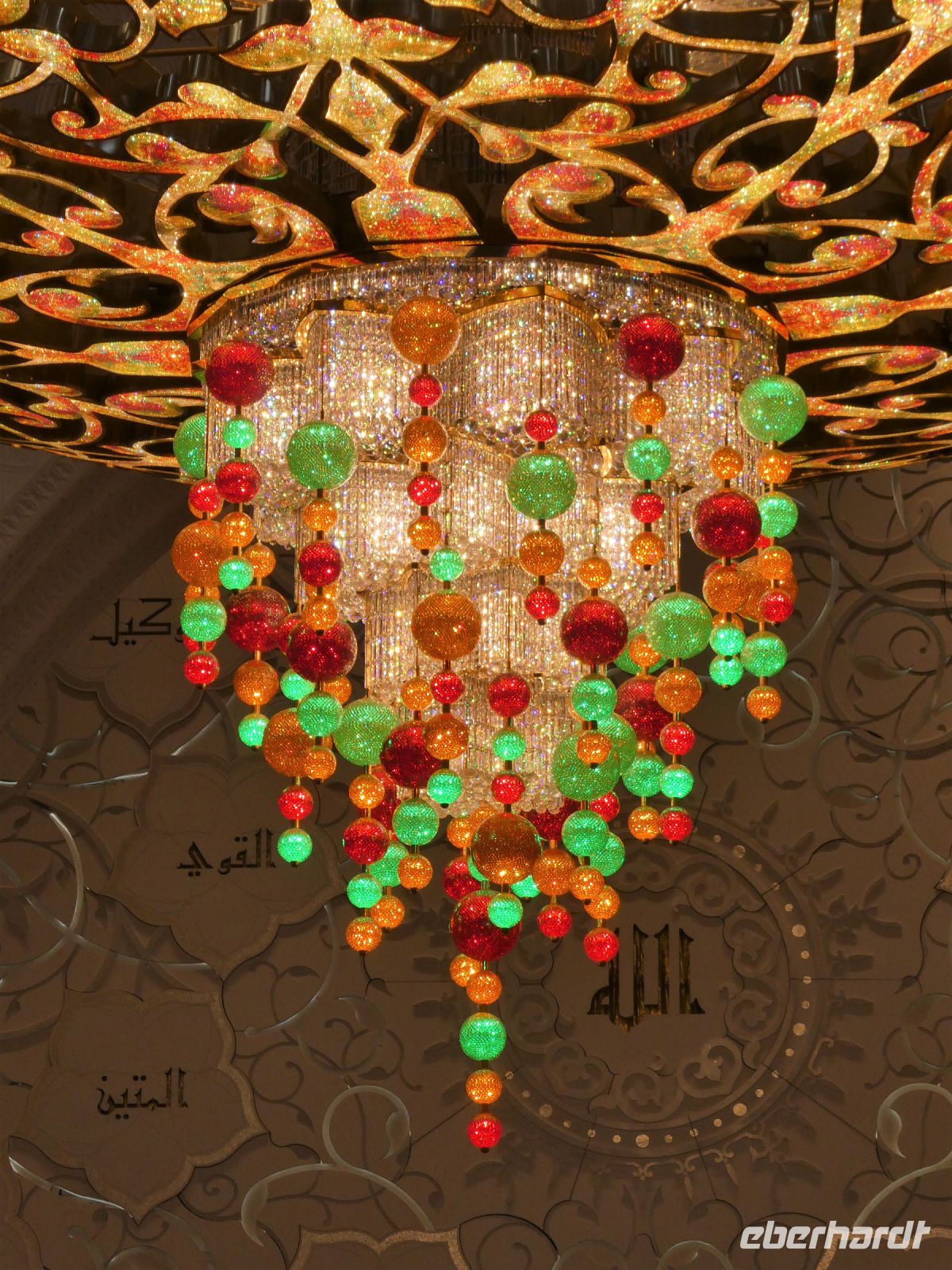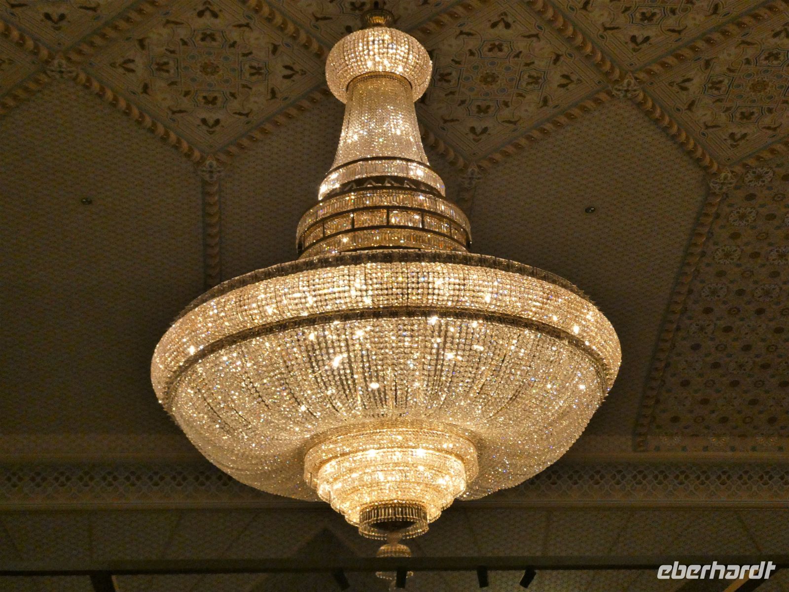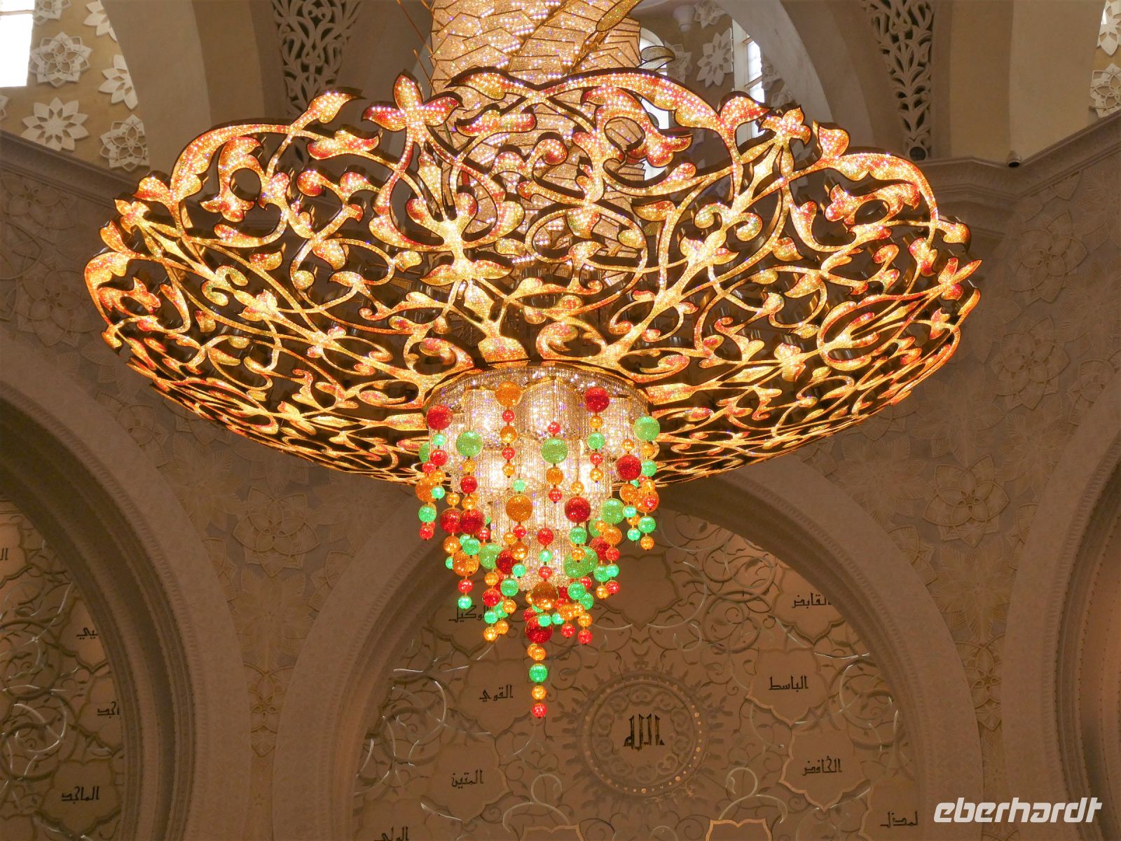 Sie ist eine Moschee der Superlative. Die 4 Minarette sind jeweils 107 m hoch, die Kuppel ist mit 32,2 Metern wohl die zweitgrößte Moscheekuppel der Welt. Nur die hochwertigsten Materialien wurden verwendet, u.a. 15 verschiedene Marmorsorten und Blattgold überall. Der im Iran handgeknüpfte Teppich ist der weltweit größte seiner Art und wiegt 47 Tonnen. Die Kronleuchter, deren Kristalle von "Swarowski" stammen, wurden aus Deutschland importiert. Der größte von Ihnen mit einem Durchmesser von 15 Metern gilt als der größte Kronleuchter der Welt.