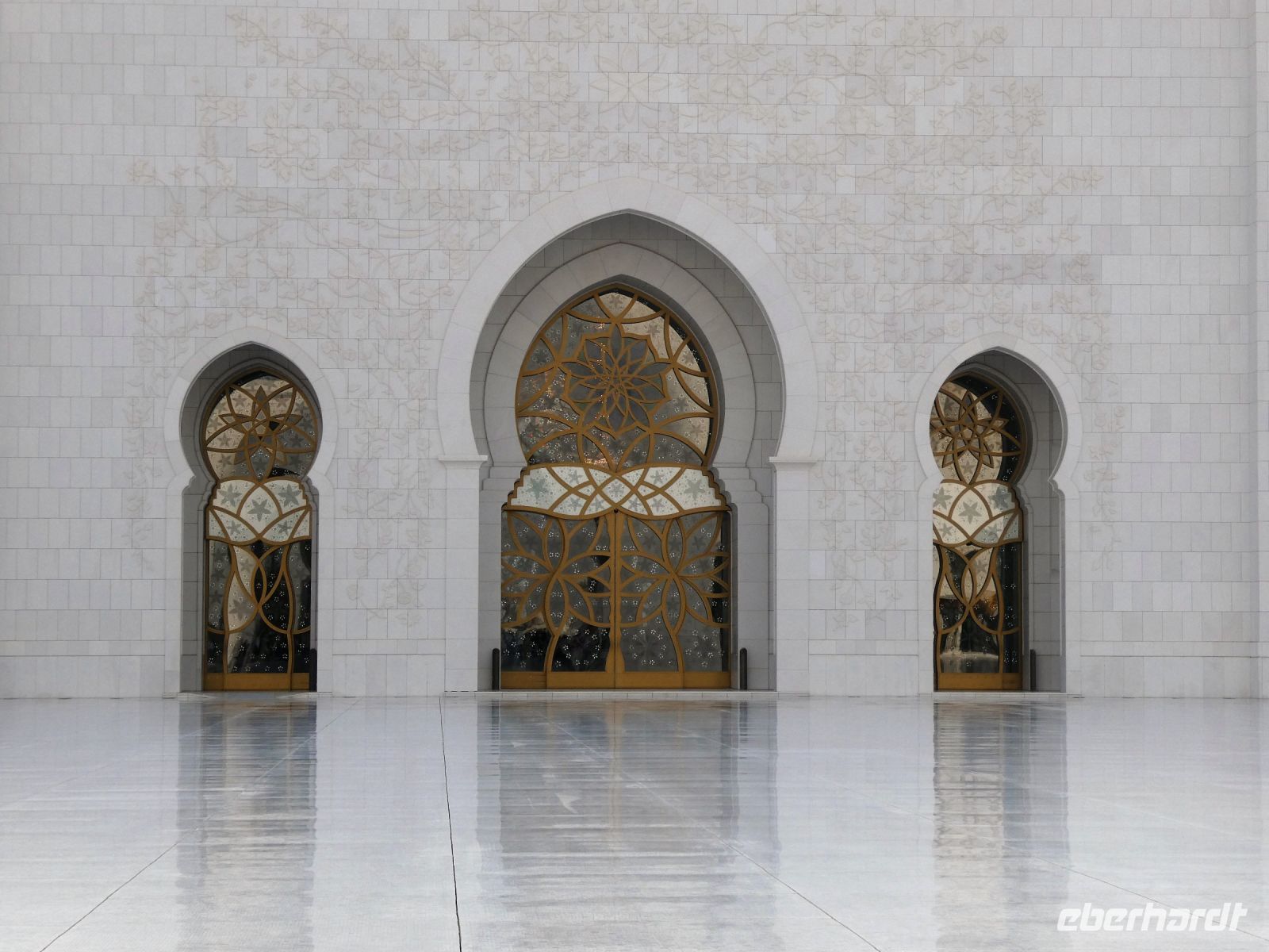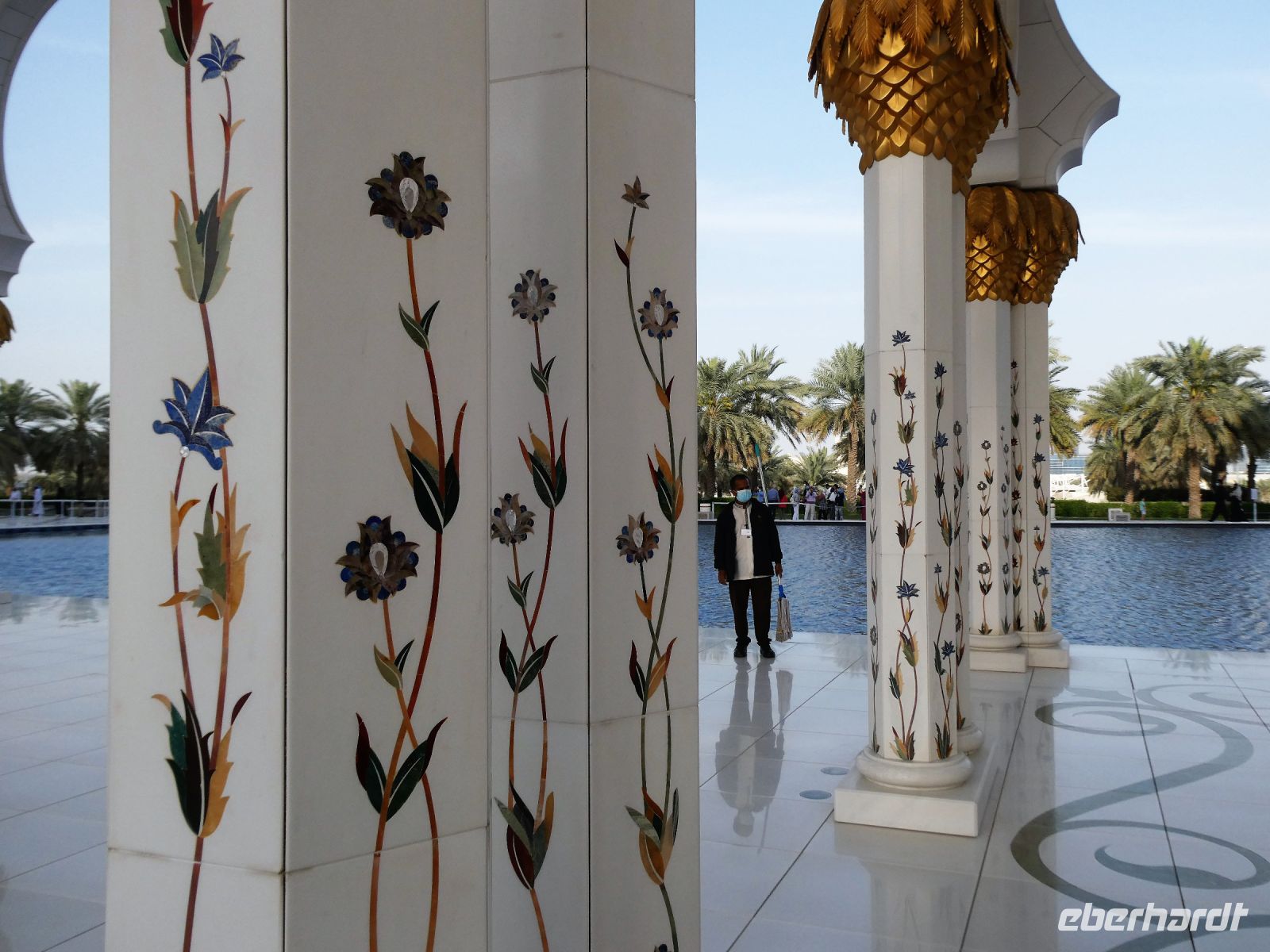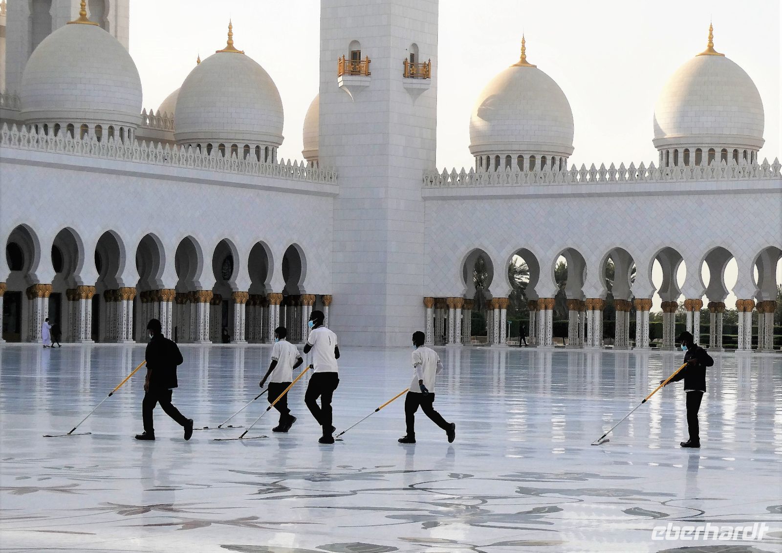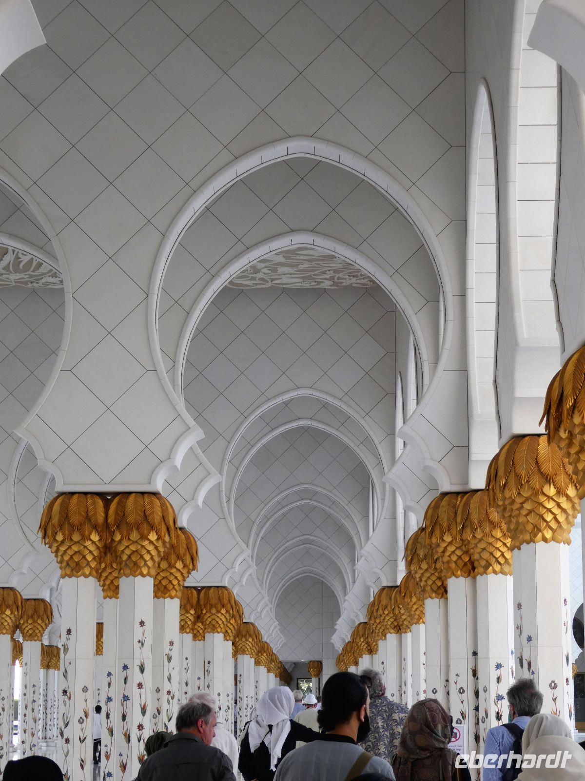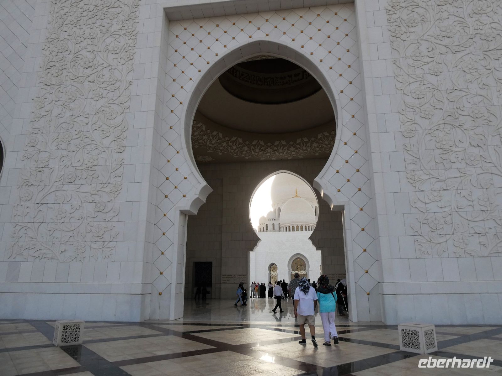 Bevor wir dieses Moscheewunder aber betreten können müssen wir erst einmal durch die zur Moschee gehörenden Mall. Hier kann „Frau“ noch schnell eine Abaja kaufen. So heißt das schwarze Übergewand der Arabischen Frauen für die hiesige korrekte Bekleidung. Denn die Haare einer Frau, die in der arabischen Welt als ein sehr attraktiver Teil der Frauen gesehen werden, und auch andere Reize müssen bei einem Moscheebesuch bedeckt sein. Dieses Gebot diente zu Zeiten des Propheten Mohammed als Schutz für die Frauen, die im 6./7.Jahrhundert als Freiwild von den Männern betrachtet wurden.