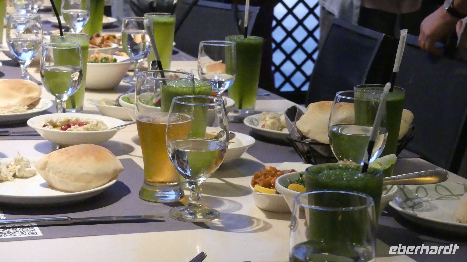 Unser letztes gemeinsames Abendessen haben wir im Restaurant „Kamoon“. Aufgrund des noch immer anhaltenden Windes sitzen wir besser drin. Es gibt noch einmal gute libanesische Küche, ähnlich wie wir es vom Montag im Souk Al Bahar kennen.