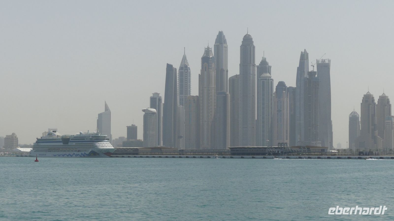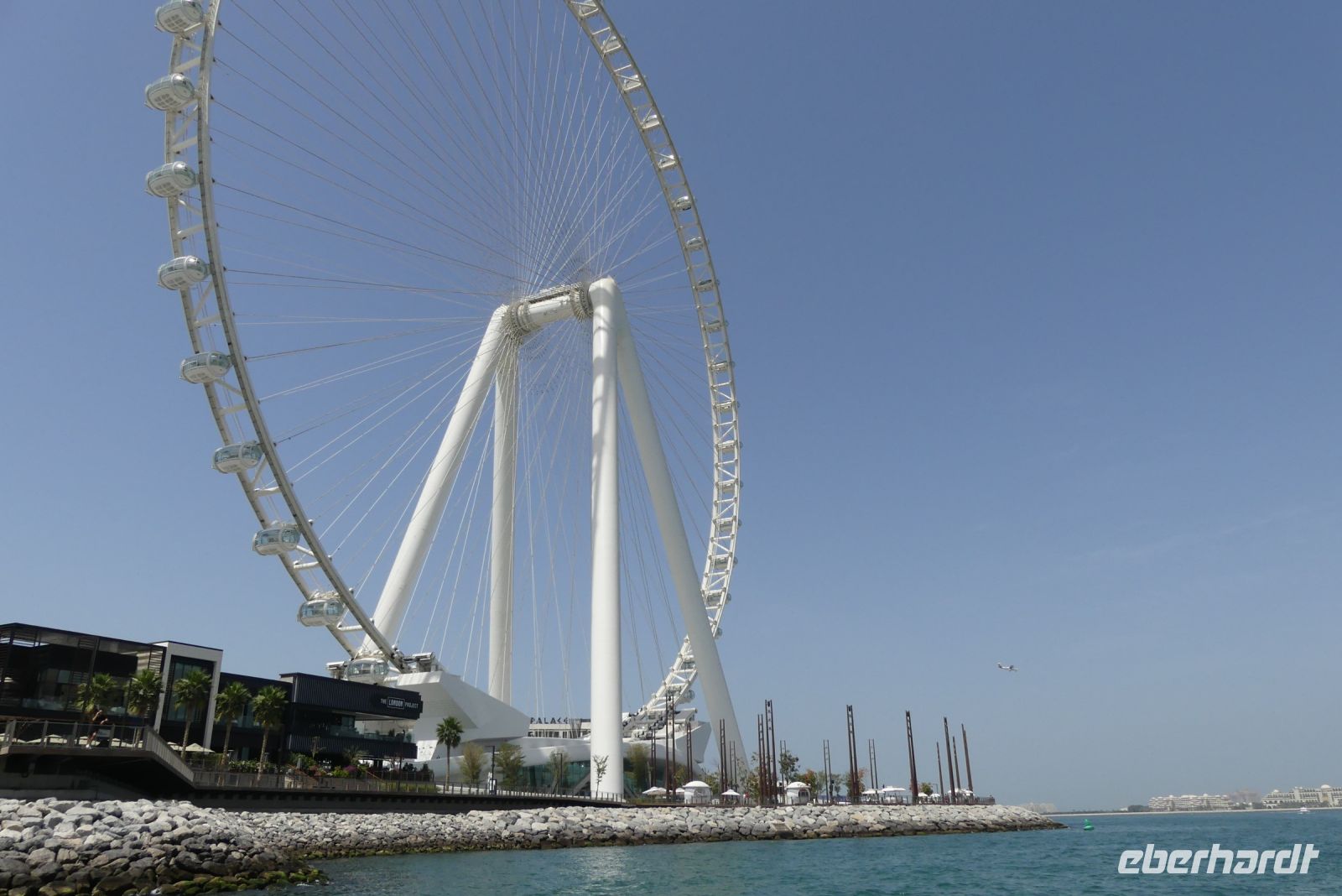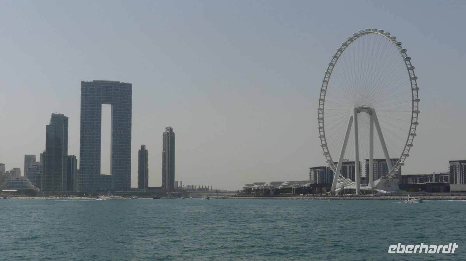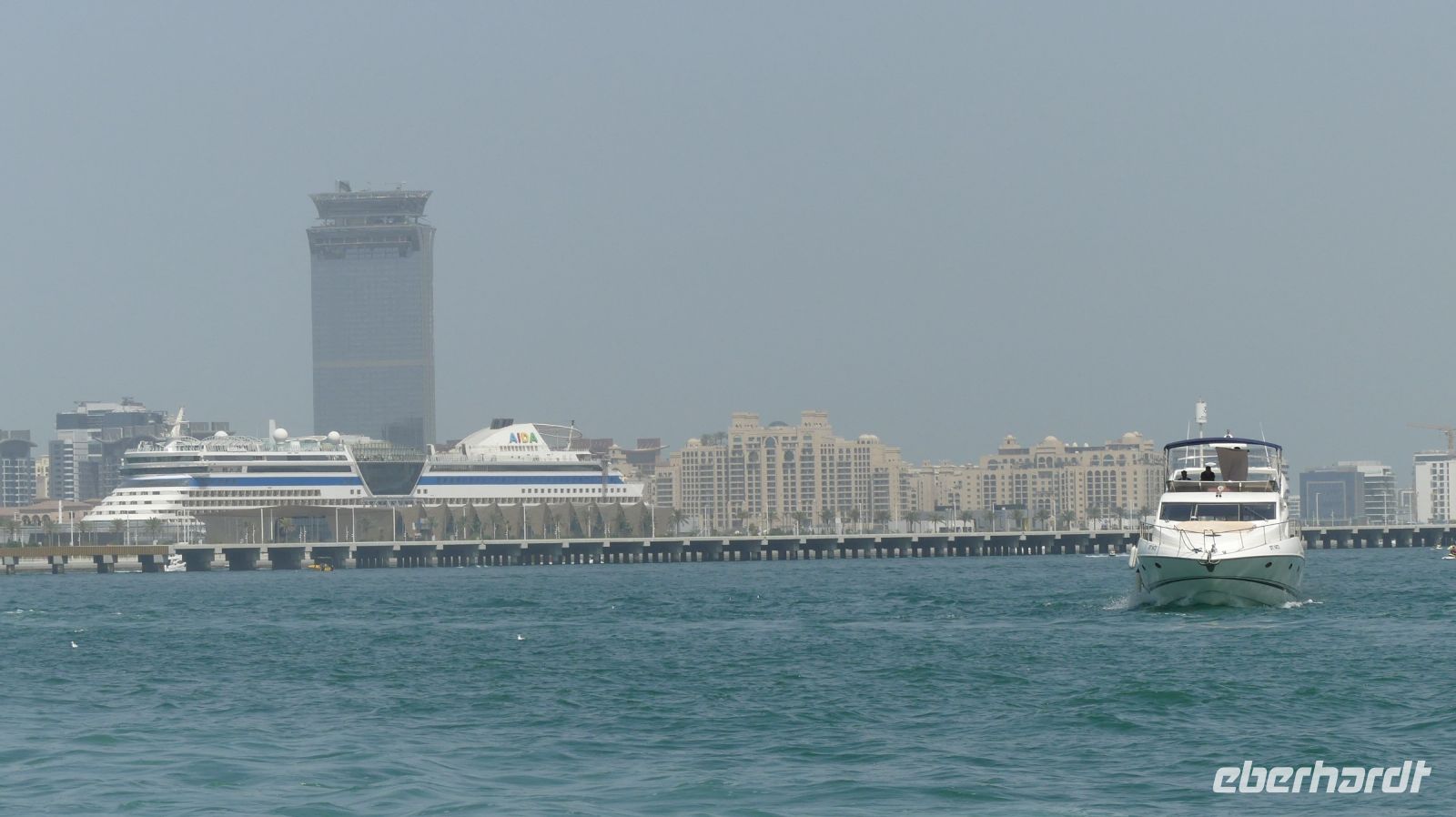 Unsere zweistündige Yachtfahrt führt uns zunächst durch den künstlichen Kanal der Dubai Marina, wo Appartementhäuser und Hotels mit Höhen von über 200 und 300 Meter dicht nebeneinander stehen weiter hinaus auf den Arabischen Golf (hier sagt man nicht Persischer Golf), vorbei an Blue Water Island mit dem stillstehendem Riesenrad Ain Dubai . Weiter geht es vorbei an dem neuen Kreuzfahrtterminal, wo gerade ein AIDA-Schiff liegt, zur Palmeninsel Palm Jumairah. Hier, am äußeren Palmenring fallen besonders die markanten Bauten des Atlantis Hotels und es Royal Atlantis auf. Nicht vergesse möchte ich Ibrahim, unseren örtlichen Reiseleiter, der mit an Bord ist, sich aber bei der Yachtfahrt immer etwas zurückhält, weil er nicht besonders seefest ist.