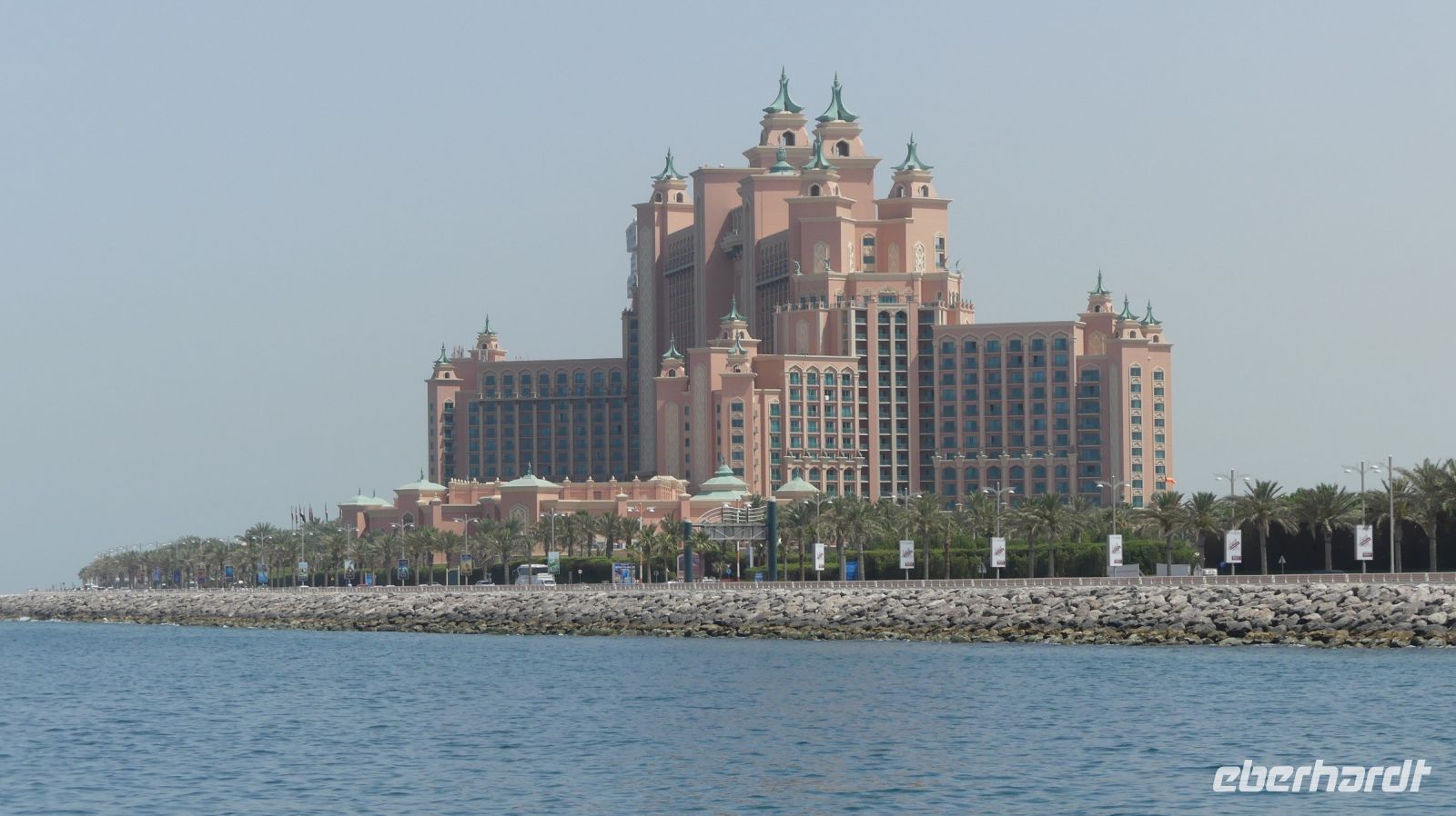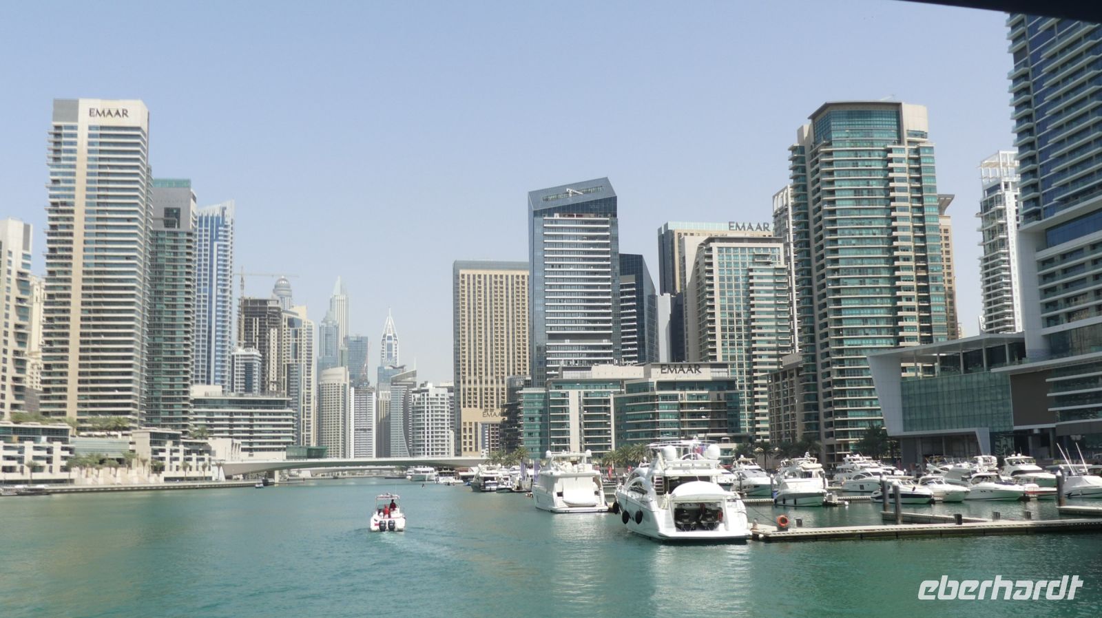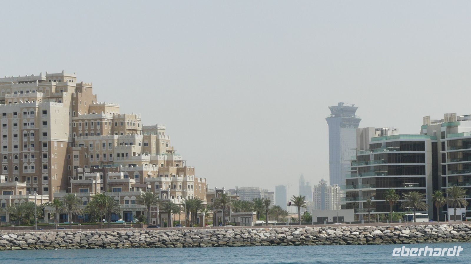 Unsere zweistündige Yachtfahrt führt uns zunächst durch den künstlichen Kanal der Dubai Marina, wo Appartementhäuser und Hotels mit Höhen von über 200 und 300 Meter dicht nebeneinander stehen weiter hinaus auf den Arabischen Golf (hier sagt man nicht Persischer Golf), vorbei an Blue Water Island mit dem stillstehendem Riesenrad Ain Dubai . Weiter geht es vorbei an dem neuen Kreuzfahrtterminal, wo gerade ein AIDA-Schiff liegt, zur Palmeninsel Palm Jumairah. Hier, am äußeren Palmenring fallen besonders die markanten Bauten des Atlantis Hotels und es Royal Atlantis auf. Nicht vergesse möchte ich Ibrahim, unseren örtlichen Reiseleiter, der mit an Bord ist, sich aber bei der Yachtfahrt immer etwas zurückhält, weil er nicht besonders seefest ist.