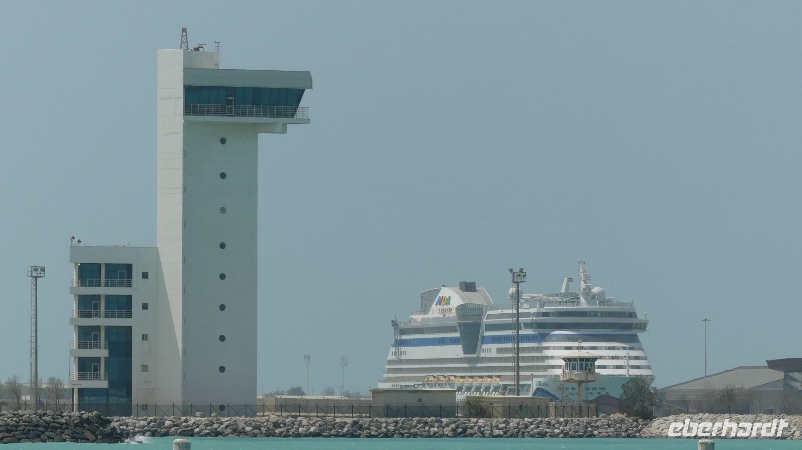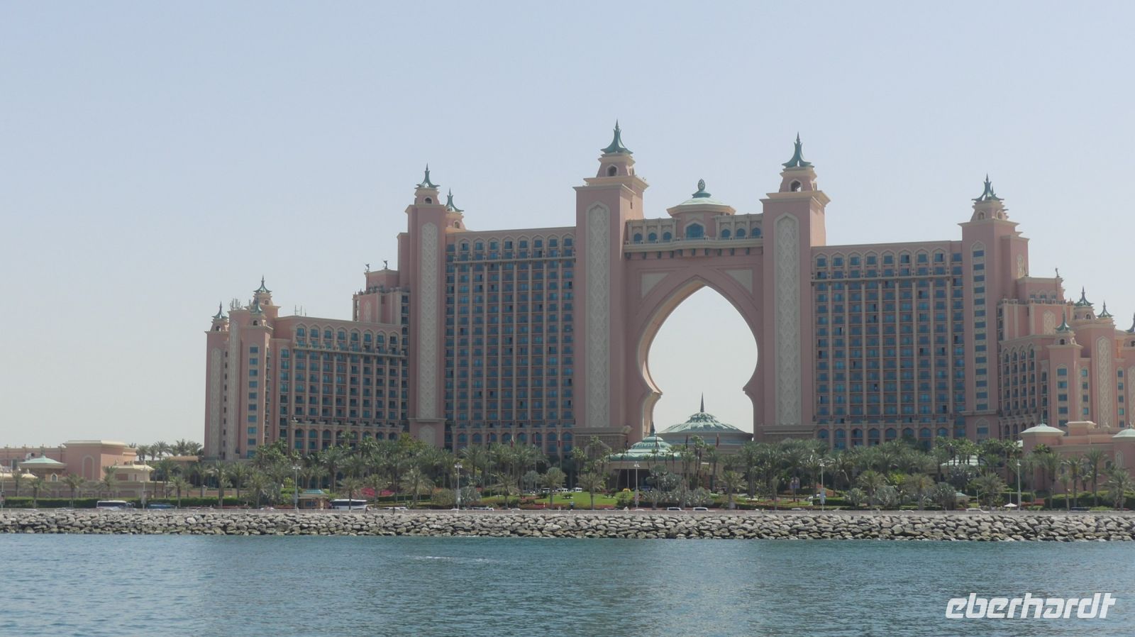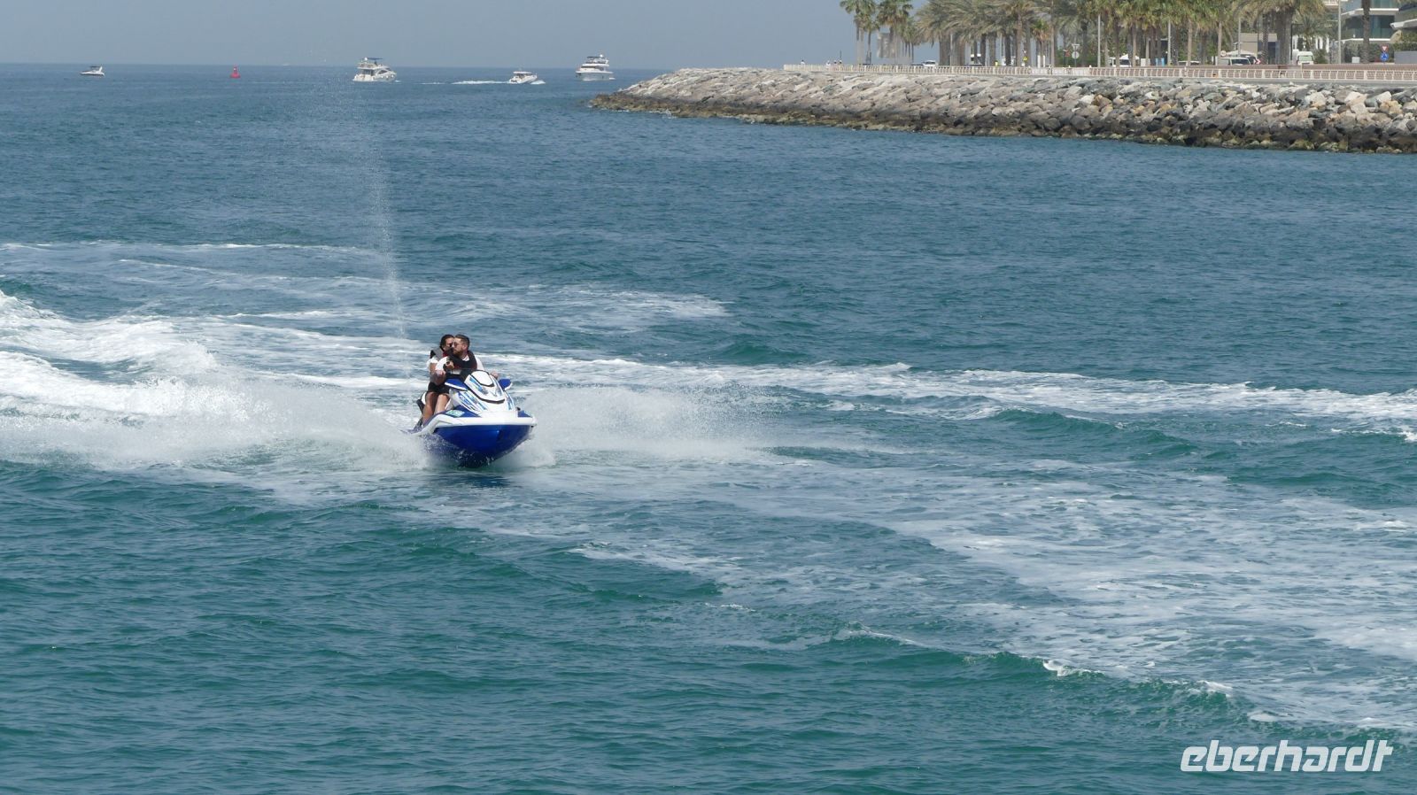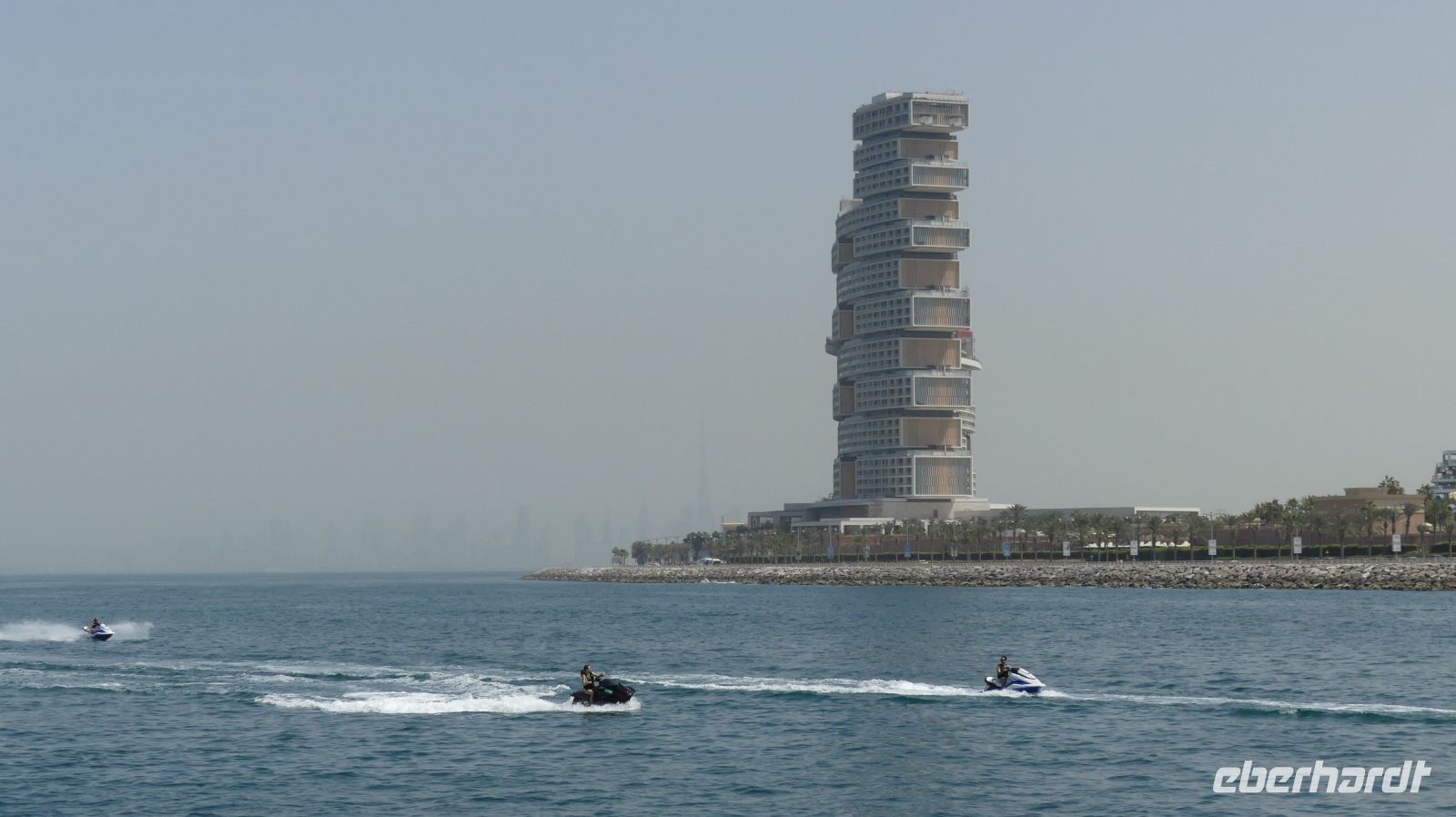 Unsere zweistündige Yachtfahrt führt uns zunächst durch den künstlichen Kanal der Dubai Marina, wo Appartementhäuser und Hotels mit Höhen von über 200 und 300 Meter dicht nebeneinander stehen weiter hinaus auf den Arabischen Golf (hier sagt man nicht Persischer Golf), vorbei an Blue Water Island mit dem stillstehendem Riesenrad Ain Dubai . Weiter geht es vorbei an dem neuen Kreuzfahrtterminal, wo gerade ein AIDA-Schiff liegt, zur Palmeninsel Palm Jumairah. Hier, am äußeren Palmenring fallen besonders die markanten Bauten des Atlantis Hotels und es Royal Atlantis auf. Nicht vergesse möchte ich Ibrahim, unseren örtlichen Reiseleiter, der mit an Bord ist, sich aber bei der Yachtfahrt immer etwas zurückhält, weil er nicht besonders seefest ist.