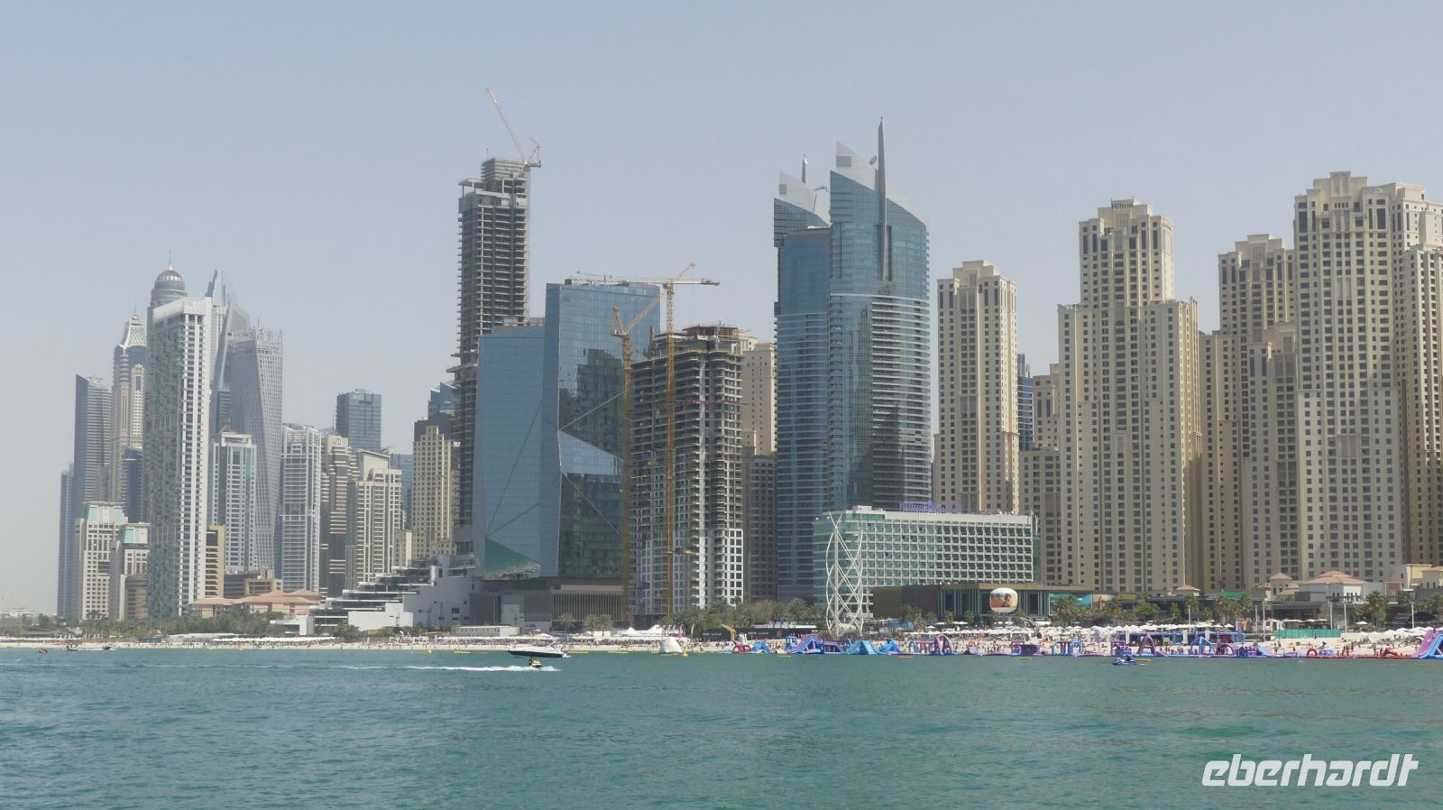 Bereits am Vormittag haben wir hochsommerliche Temperaturen, die heute bei 12 Sonnenstunden bis auf 34 Grad steigen werden. Da lässt es sich auf dem Meer mit einer leichten Brise während unserer Yachtfahrt gut aushalten. Die Yacht haben wir exklusiv für uns. Bei strahlendem Sonnenschein können wir die Skyline der Marina bewundern.