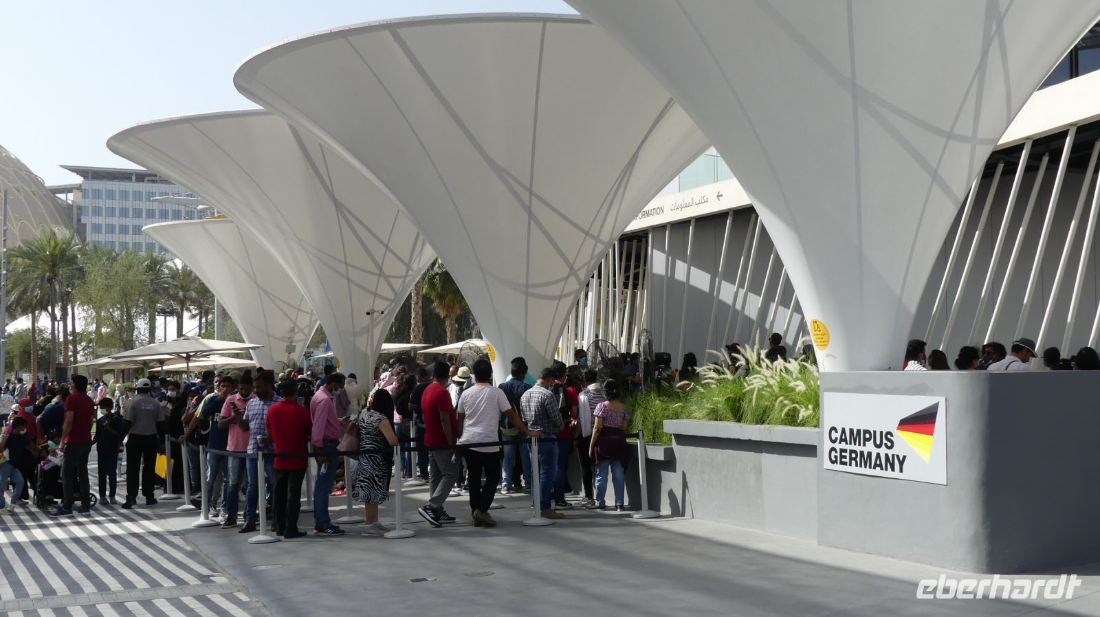 Schwester Helena erscheint pünktlich gegen halb neun und das Hotel stellt uns einen Seminarraum zur Verfügung. So können wir pünktlich um neun Uhr wie geplant direkt zur EXPO 2020 aufbrechen. Erfahrungsgemäß gibt es an den Wochentagen vormittags die wenigsten Besucher. Es ist also die Gelegenheit, heute die gefragten Pavillons zu besuchen. Wir steuern gleich den Campus Germany an. Dieser öffnet zwar wie die anderen auch erst zehn Uhr, aber es steht schon eine lange Schlange um zwei Ecken des Pavillons herum. Die Meisten aus unserer Gruppe entscheiden sich dennoch dafür, sich mit anzustellen. Mit der Eröffnung zehn Uhr rückt es deutlich nach vorn. Warten in der Gruppe hat den Vorteil, dass die Wartezeit mit Gesprächen gut überbrückt werden kann. Wie ich später hören werde, betrug die Wartezeit ca. 1,5 Stunden und jeder sagte mir, dass sich das Warten gelohnt hat. Eine kleine deutsche Peinlichkeit am Rande wird mir berichtet: der Stempel nach der Ausstellung ist kaputt…