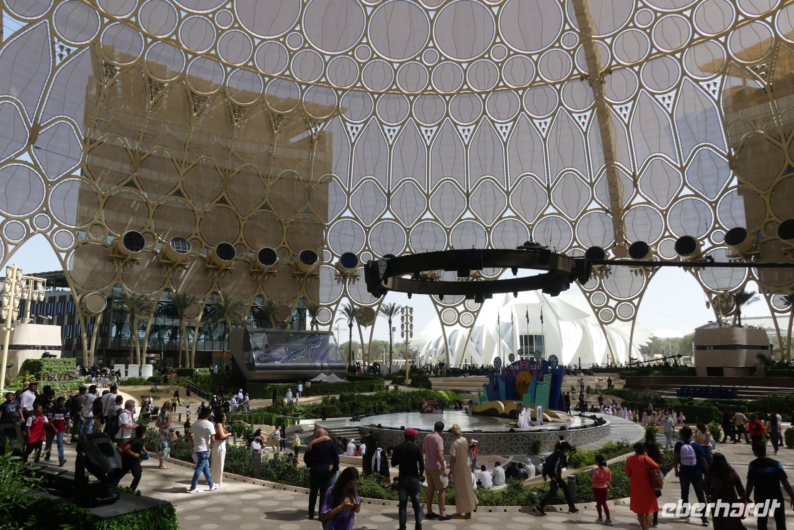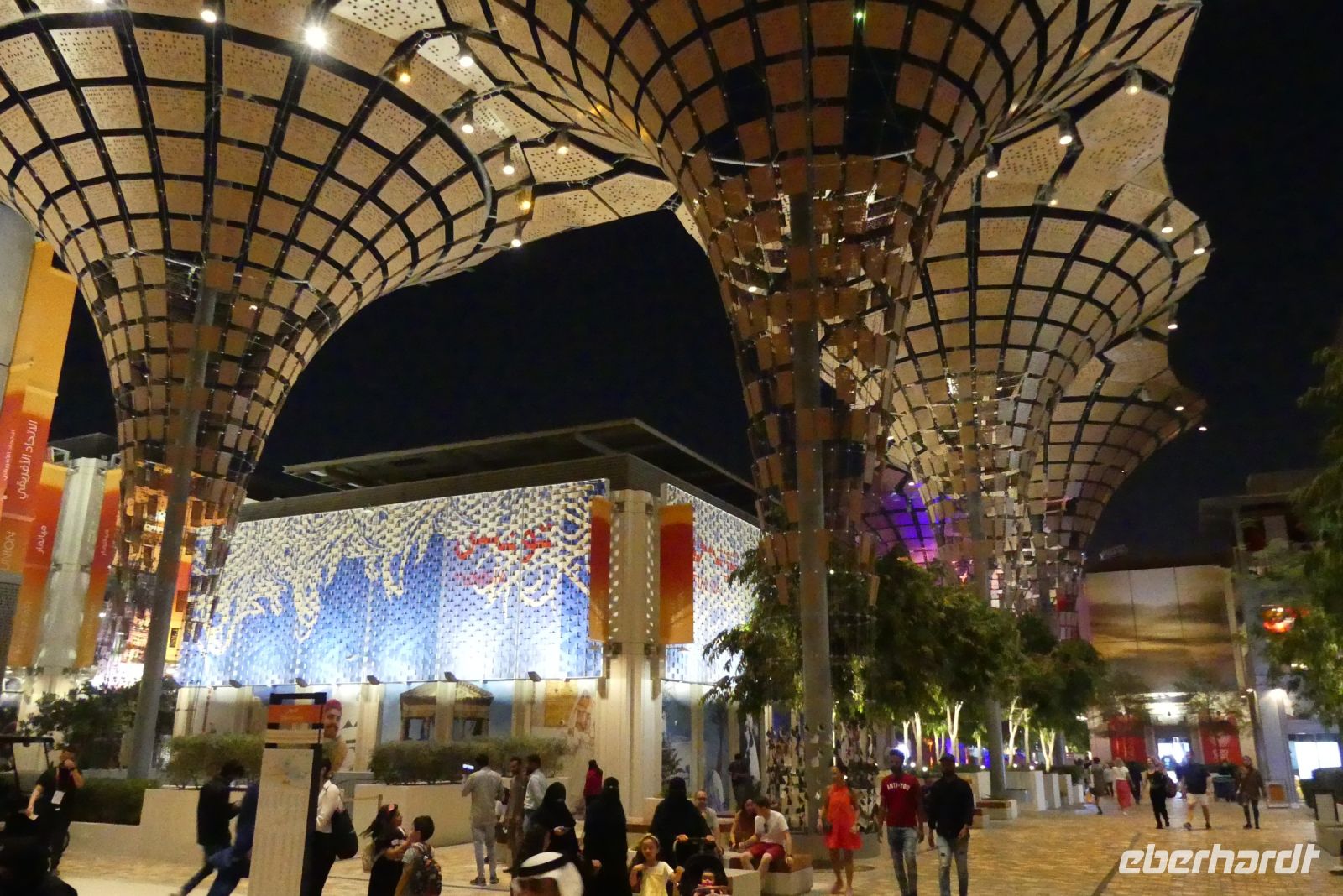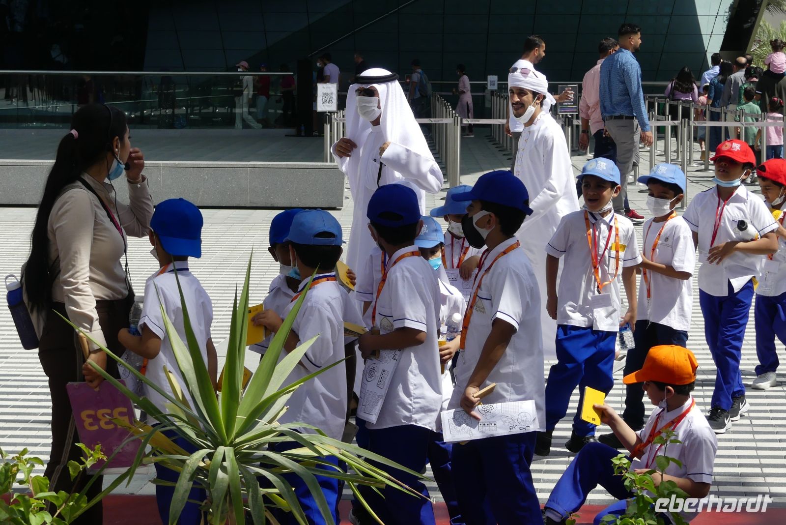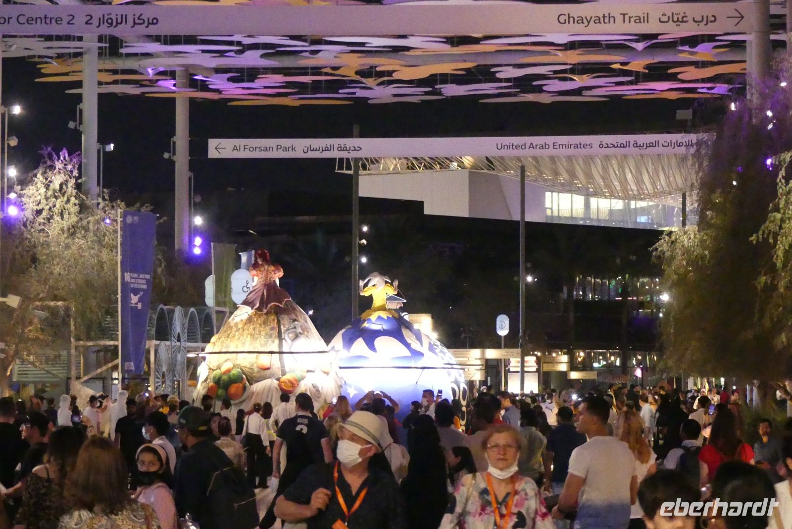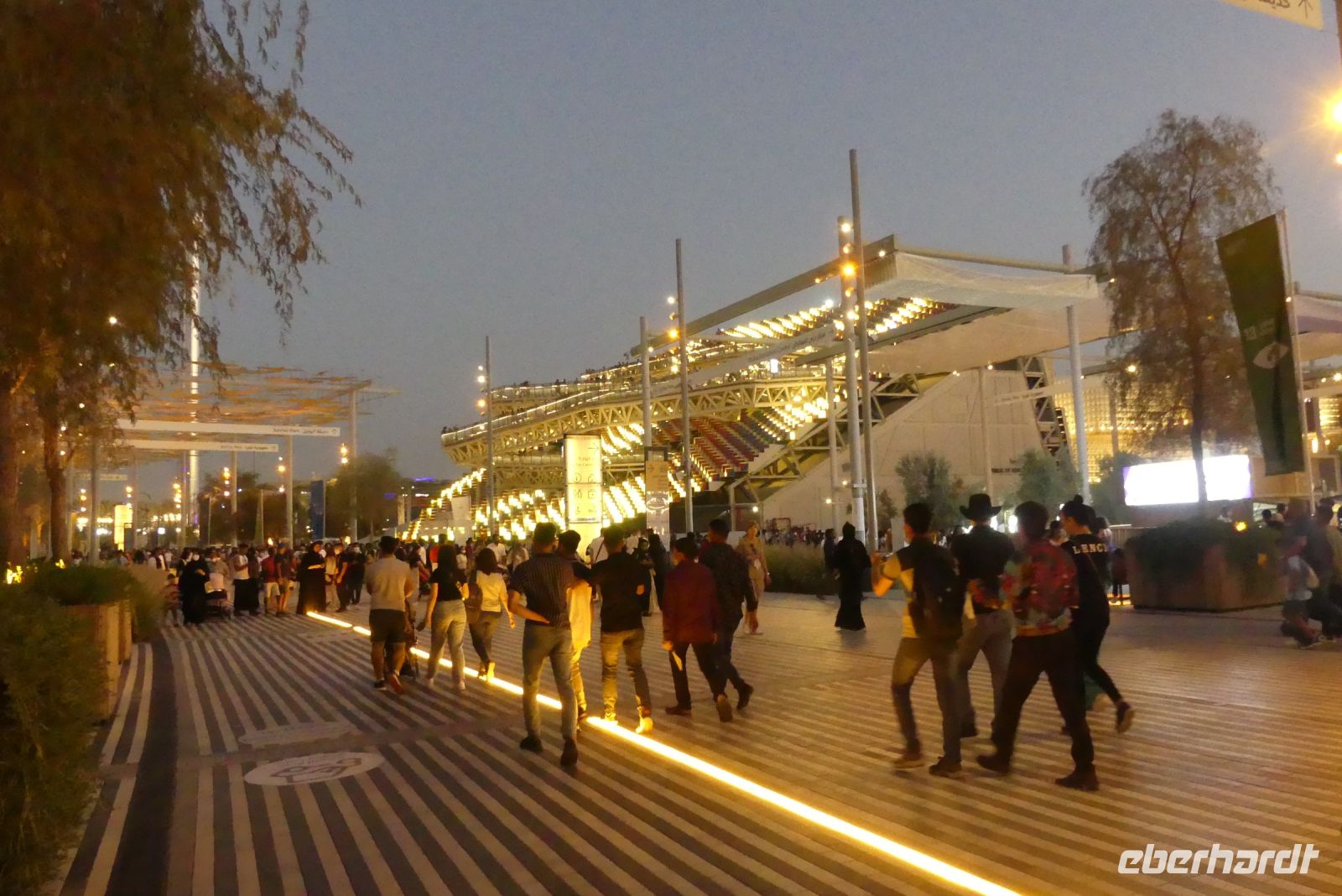Vom Creek benötigen wir eine Stunde mit dem Bus bis zum EXPO-Gelände. Hier werden wir bis zum Abend bleiben. Es ist viel los auf der EXPO. Auf den Alleen gibt es Unterhaltung – mal zieht eine Parade vorbei (man feiert den Golfkooperationsrat), mal überdimensionale Figuren wie zum Beispiel ein Falke oder Artistinnen, die als Bienen verkleidet auf mobilen Blüten ihr Können zeigen oder Sängerinnen in Fantasiekostümen…