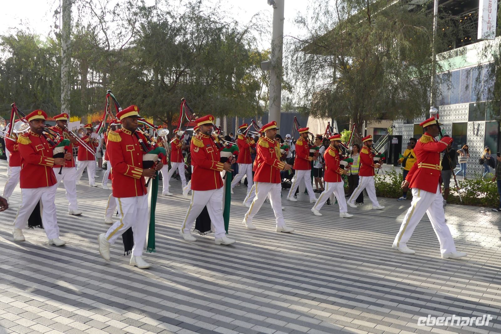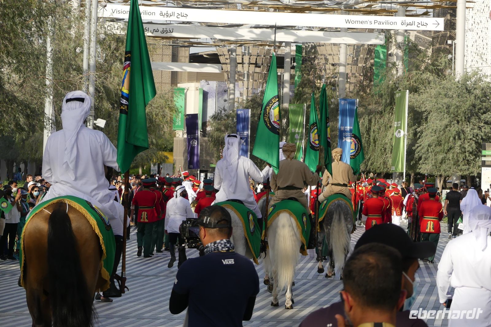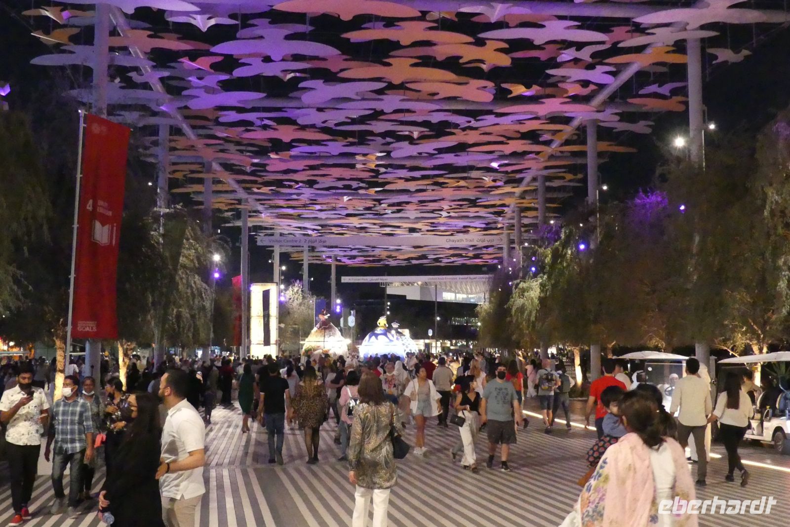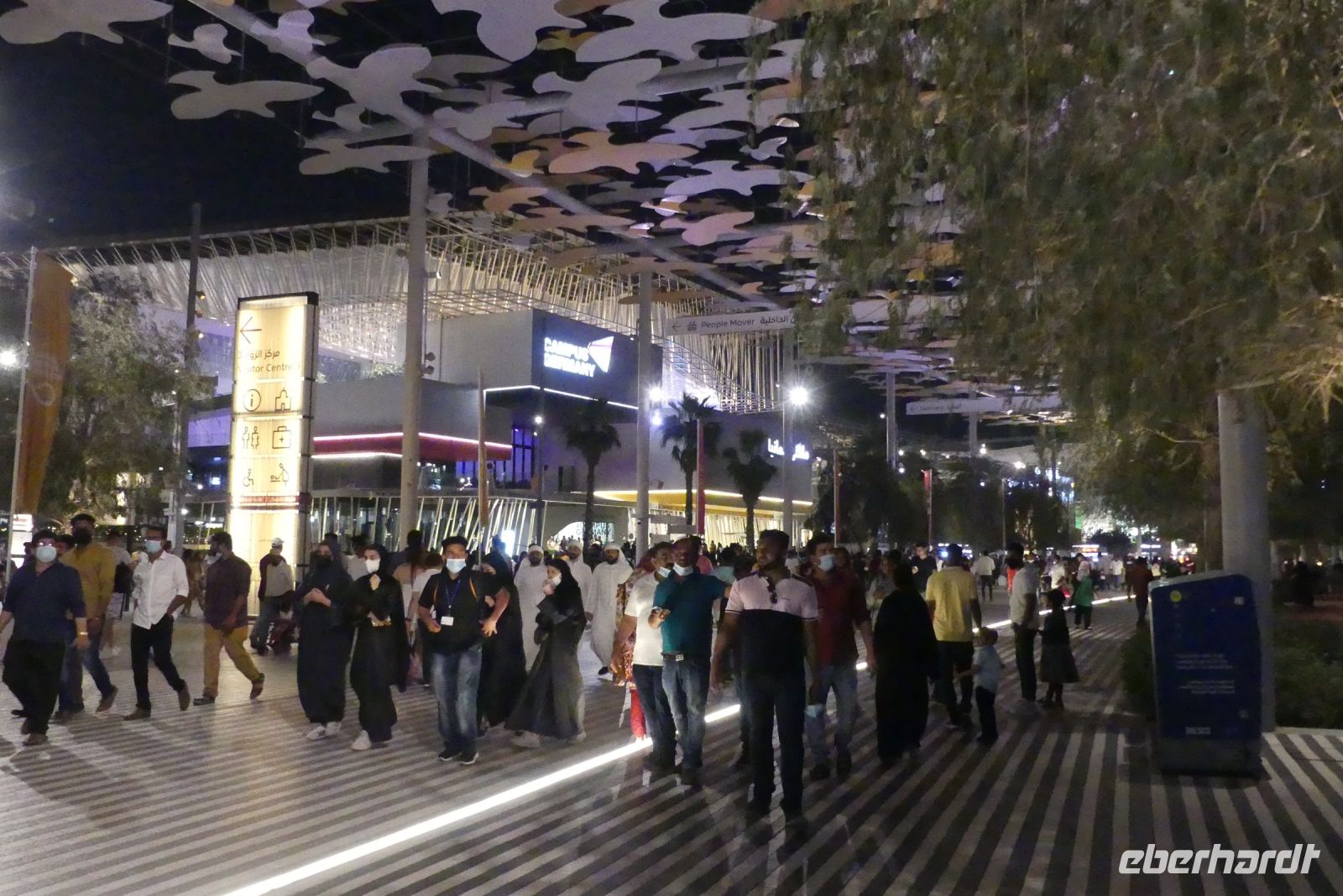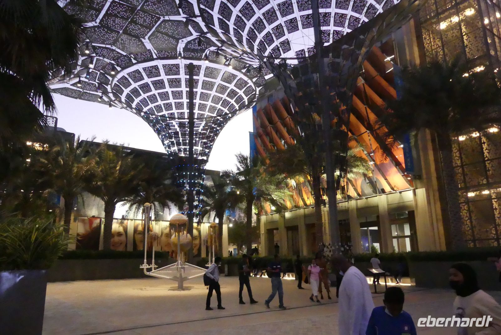 Vom Creek benötigen wir eine Stunde mit dem Bus bis zum EXPO-Gelände. Hier werden wir bis zum Abend bleiben. Es ist viel los auf der EXPO. Auf den Alleen gibt es Unterhaltung – mal zieht eine Parade vorbei (man feiert den Golfkooperationsrat), mal überdimensionale Figuren wie zum Beispiel ein Falke oder Artistinnen, die als Bienen verkleidet auf mobilen Blüten ihr Können zeigen oder Sängerinnen in Fantasiekostümen…