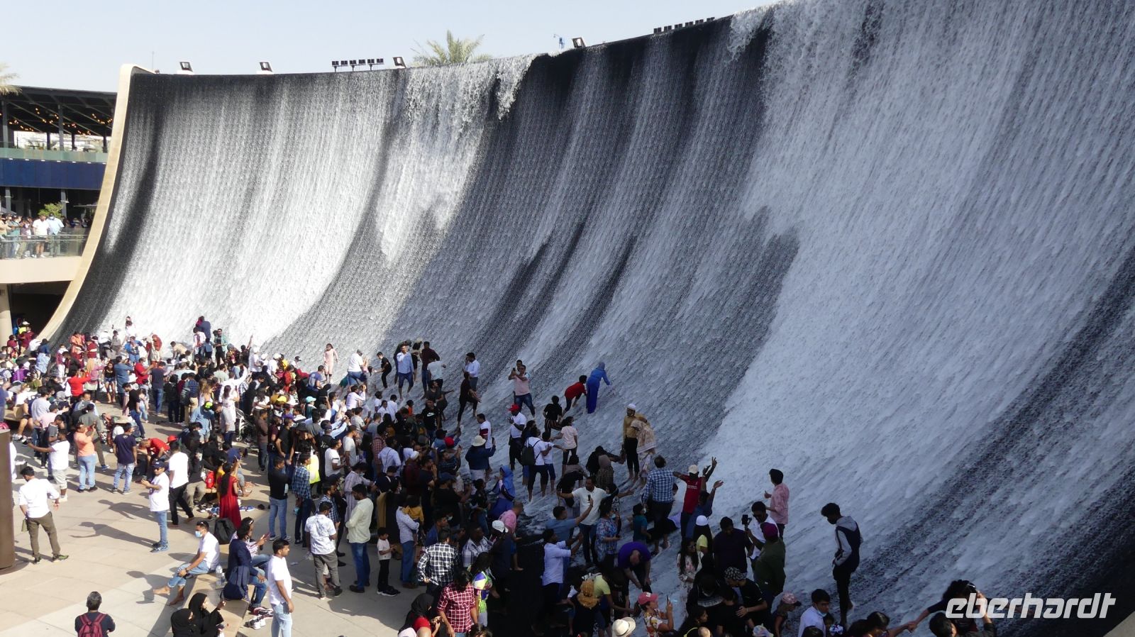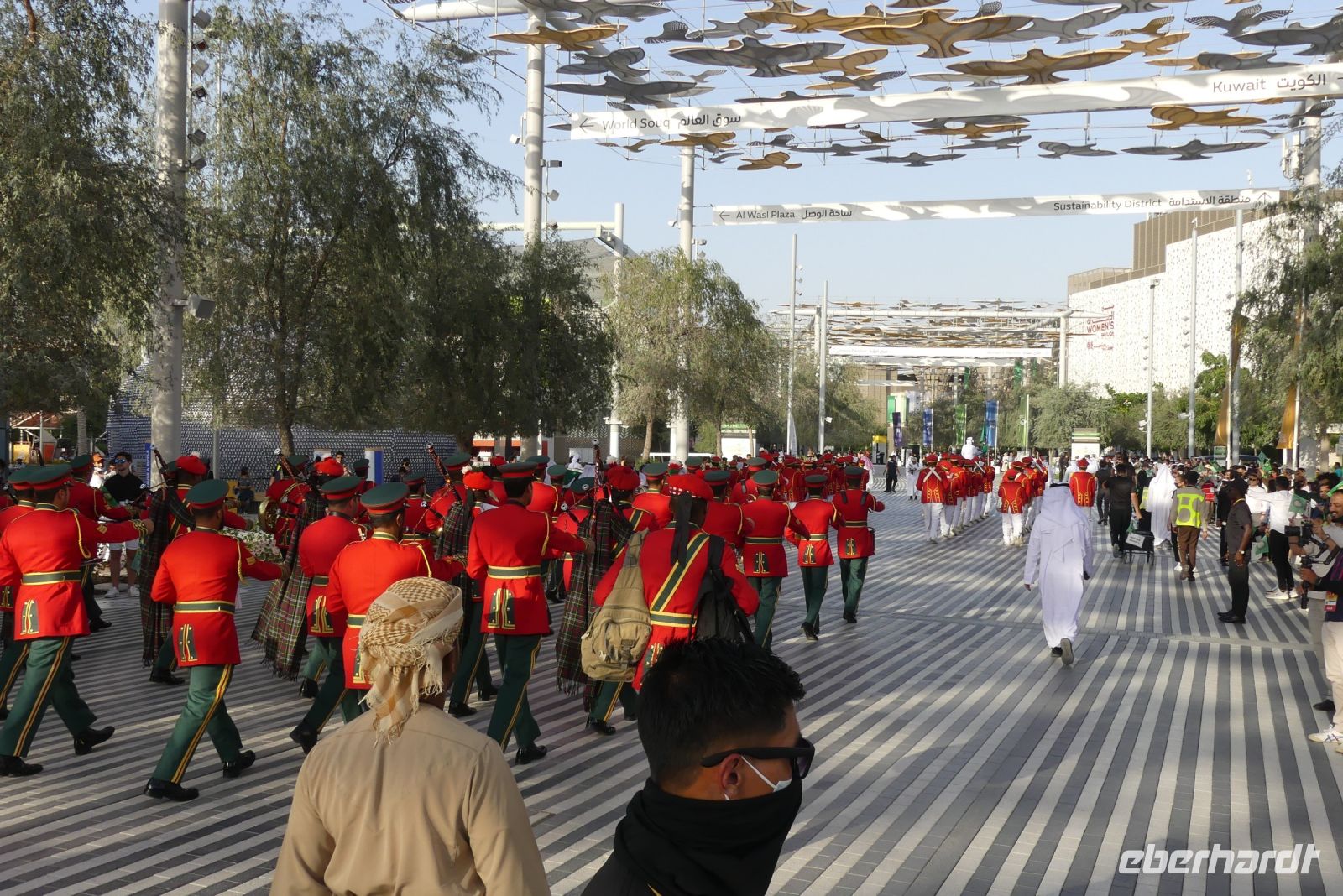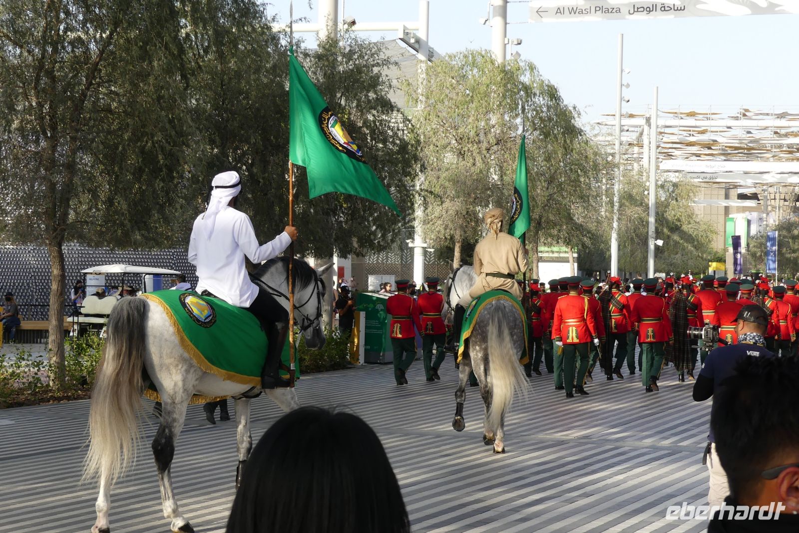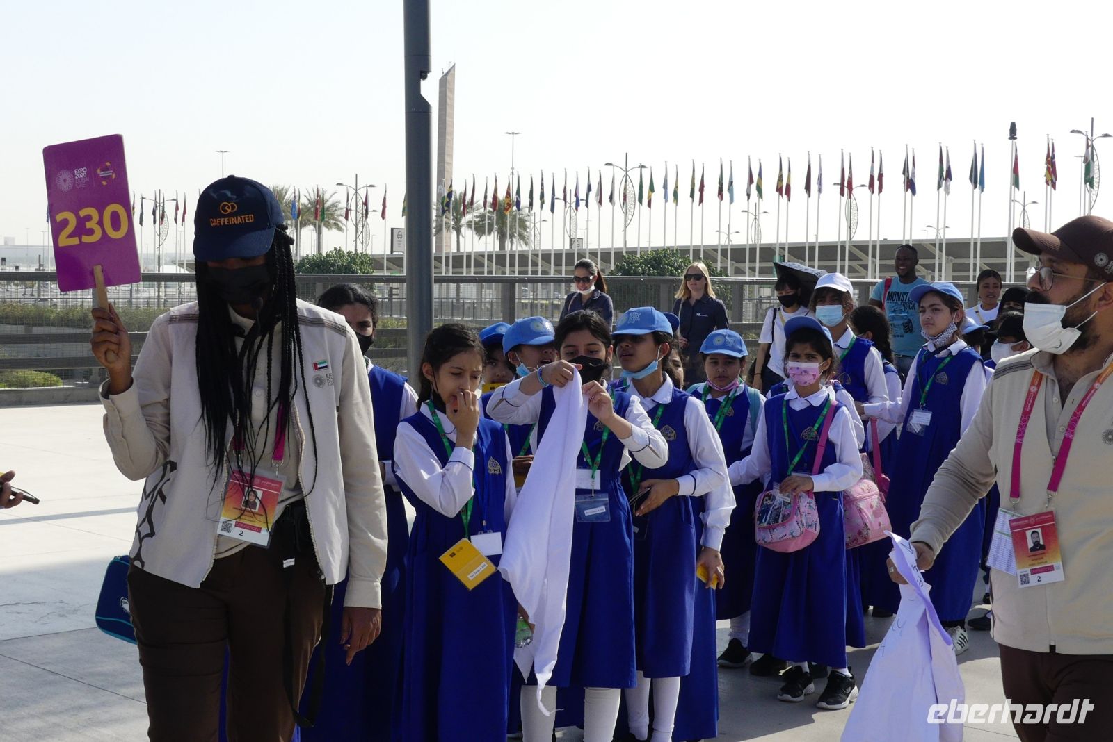 Vom Creek benötigen wir eine Stunde mit dem Bus bis zum EXPO-Gelände. Hier werden wir bis zum Abend bleiben. Es ist viel los auf der EXPO. Auf den Alleen gibt es Unterhaltung – mal zieht eine Parade vorbei (man feiert den Golfkooperationsrat), mal überdimensionale Figuren wie zum Beispiel ein Falke oder Artistinnen, die als Bienen verkleidet auf mobilen Blüten ihr Können zeigen oder Sängerinnen in Fantasiekostümen…