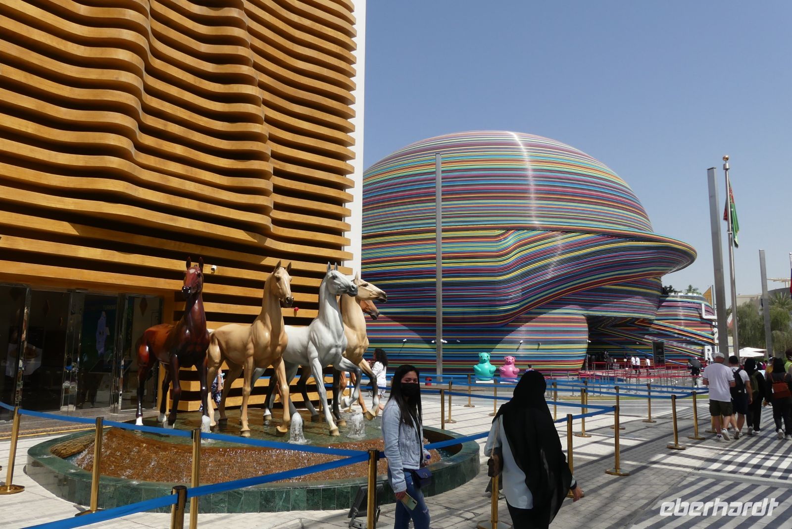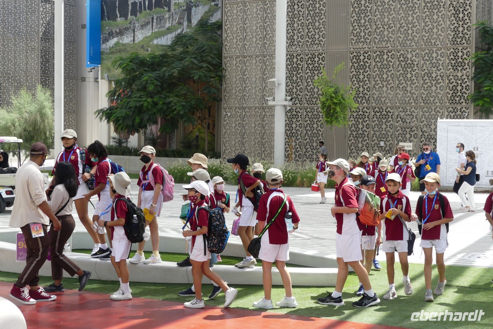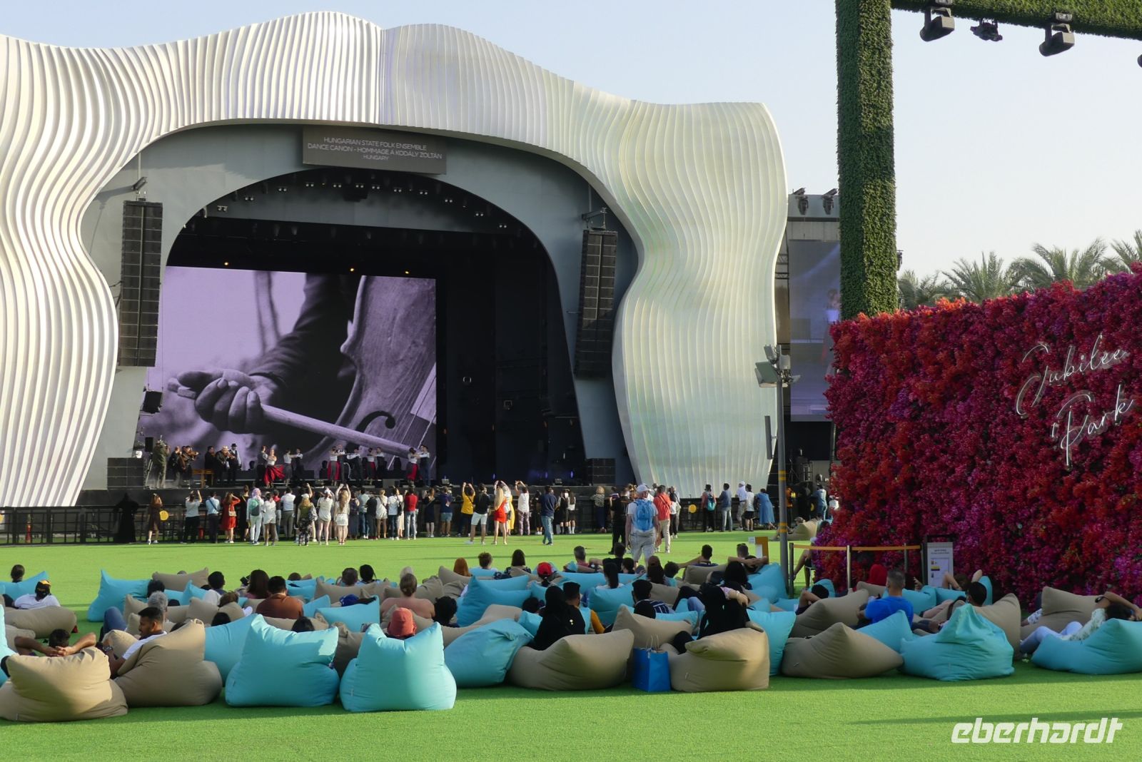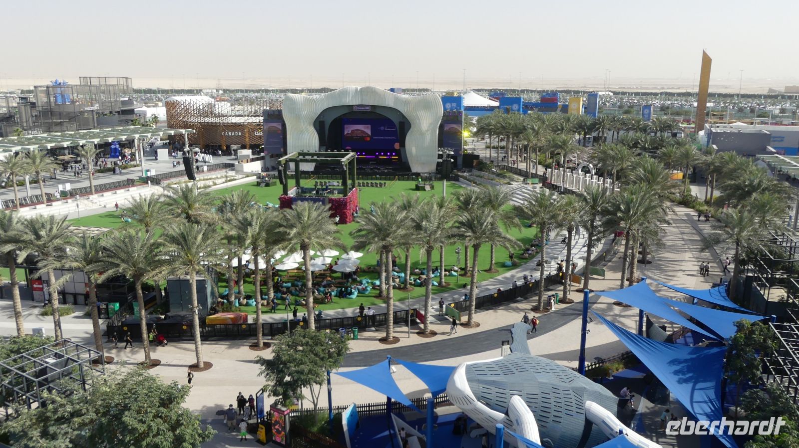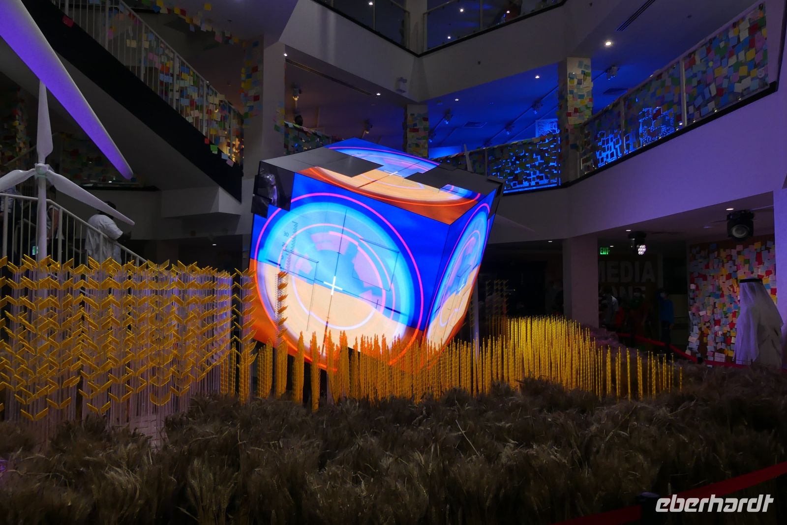 Vom Creek benötigen wir eine Stunde mit dem Bus bis zum EXPO-Gelände. Hier werden wir bis zum Abend bleiben. Es ist viel los auf der EXPO. Auf den Alleen gibt es Unterhaltung – mal zieht eine Parade vorbei (man feiert den Golfkooperationsrat), mal überdimensionale Figuren wie zum Beispiel ein Falke oder Artistinnen, die als Bienen verkleidet auf mobilen Blüten ihr Können zeigen oder Sängerinnen in Fantasiekostümen…
