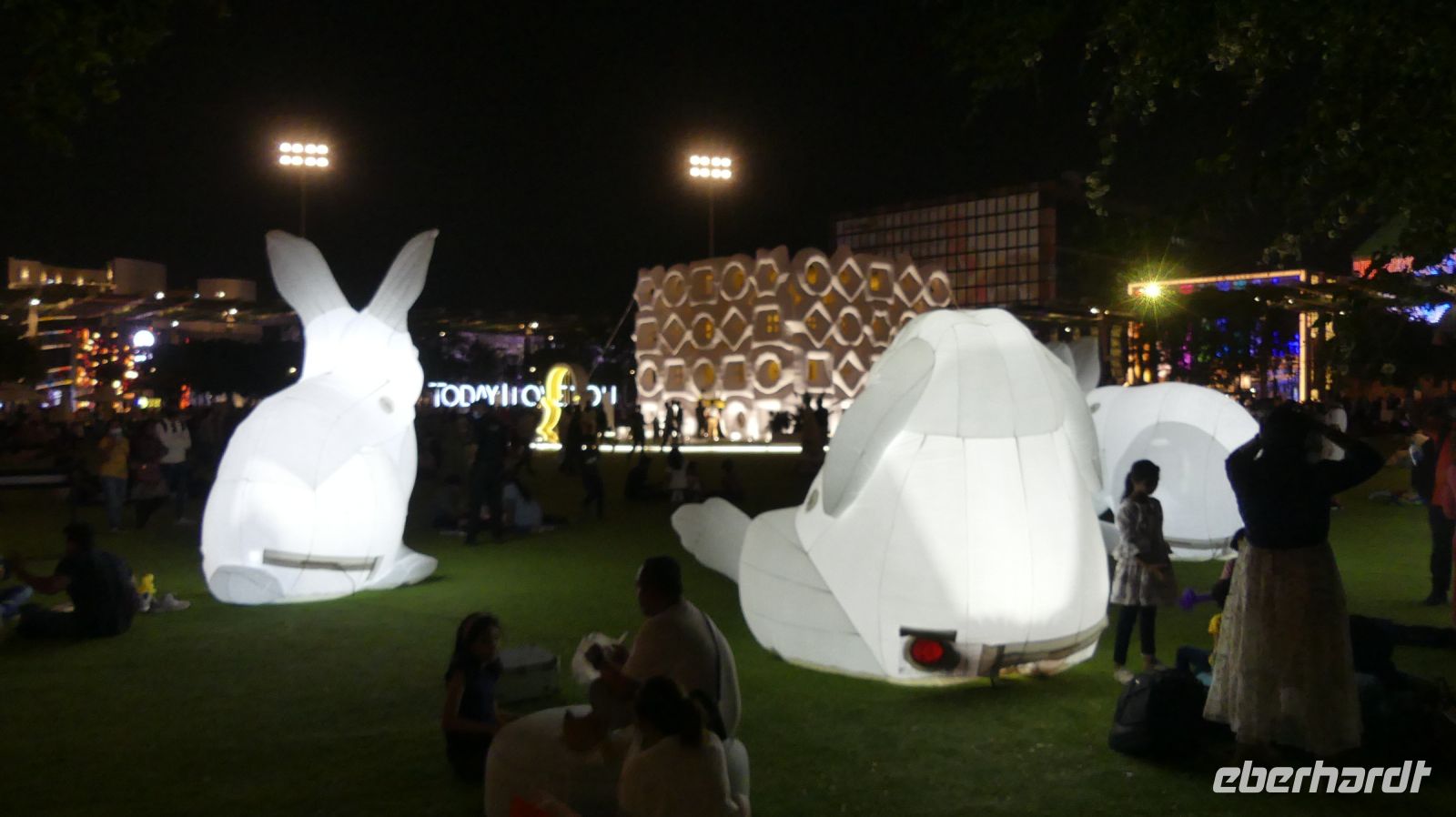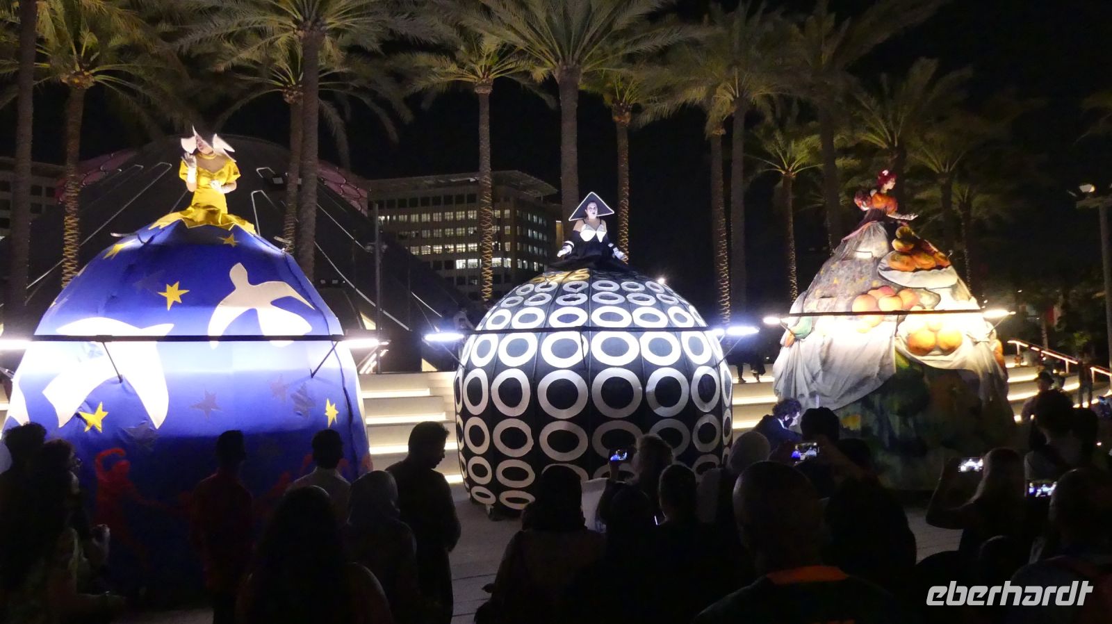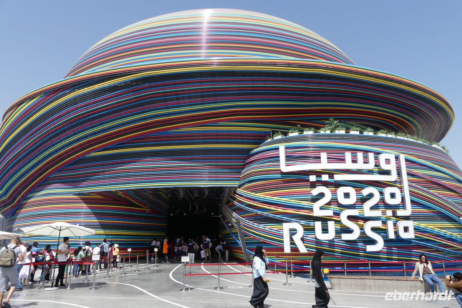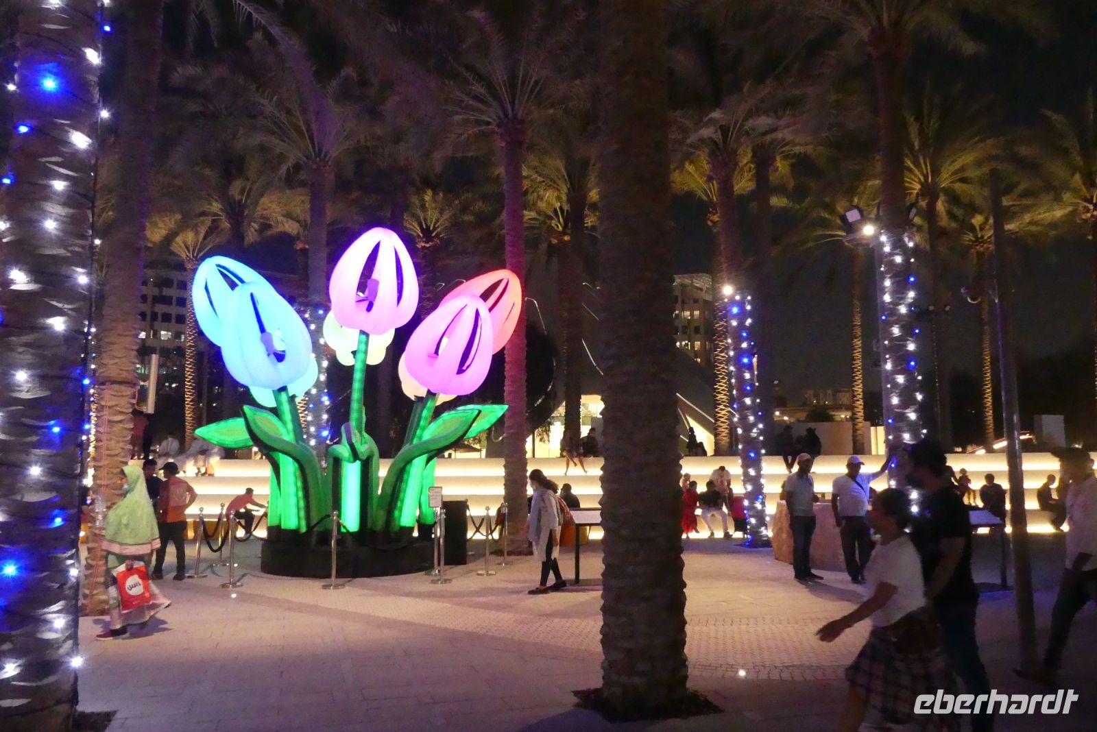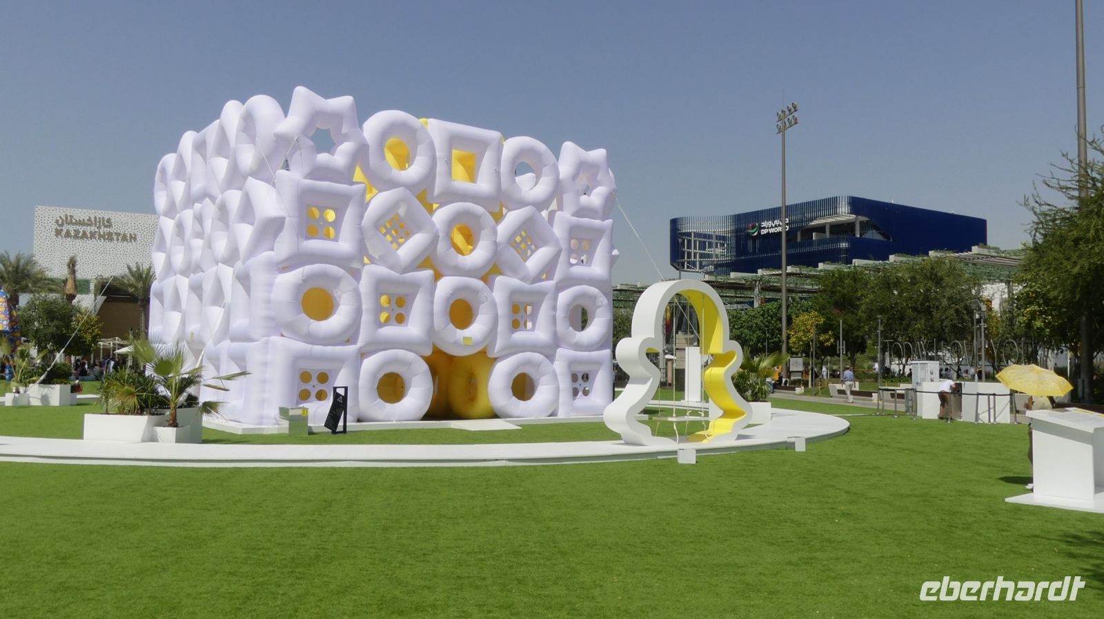 Vom Creek benötigen wir eine Stunde mit dem Bus bis zum EXPO-Gelände. Hier werden wir bis zum Abend bleiben. Es ist viel los auf der EXPO. Auf den Alleen gibt es Unterhaltung – mal zieht eine Parade vorbei (man feiert den Golfkooperationsrat), mal überdimensionale Figuren wie zum Beispiel ein Falke oder Artistinnen, die als Bienen verkleidet auf mobilen Blüten ihr Können zeigen oder Sängerinnen in Fantasiekostümen…