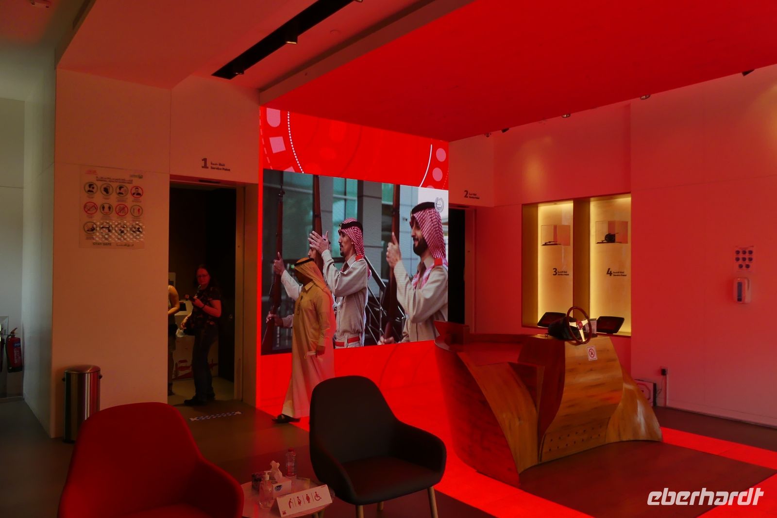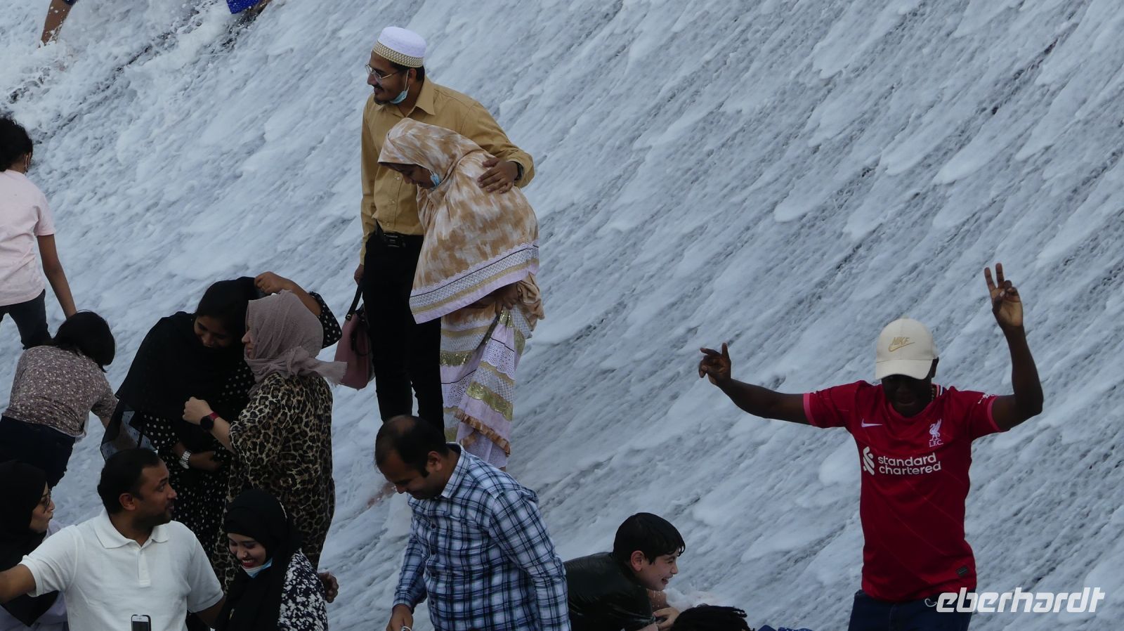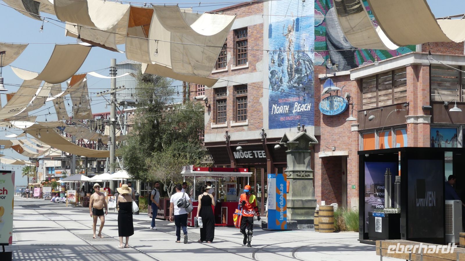 Der Rest des Tages gehört der EXPO 2020. Mit einigen Gästen verschaffen wir uns mit der Aussichtsplattform „Garden in the Sky“ einen ersten Überblick über das Ausstellungsgelände. Die erste Orientierung ist insofern etwas schwierig, weil die Länderpavillons erstmals bei einer Weltausstellung nicht nach ihrer geographischen Lage angeordnet sind, sondern einem der drei Themen Nachhaltigkeit, Mobilität oder Möglichkeiten zugeordnet sind. Dreh- und Angelpunkt für unsere EXPO-Aufenthalte wird der deutsche Pavillon. Der German Campus, wie er richtig heisst, gehört zu den interessantesten und damit beliebtesten Pavillons. Heute zum Sonntag* sind besonders viele Besucher anzutreffen, so dass es besser ist, beliebte Pavillons zu meiden, sich auf die erste Orientierung zu konzentrieren, vorzugsweise kleinere Länderpavillons zu besichtigen und leicht zugängliche Attraktionen wie die „Water Features“ (Wasserfall), den Al Wasl Dome, Parks oder Pavillons von außen (z. B. Saudi Arabien) zu besichtigen. Auch eine Entdeckungstour in den schmalen Nebengassen mit Kleinbühnen und kleinen Länderpavillons lohnt sich. So kann man nach dem ersten Orientierungstag schon mal planen, was man sich die nächsten Tage anschaut.