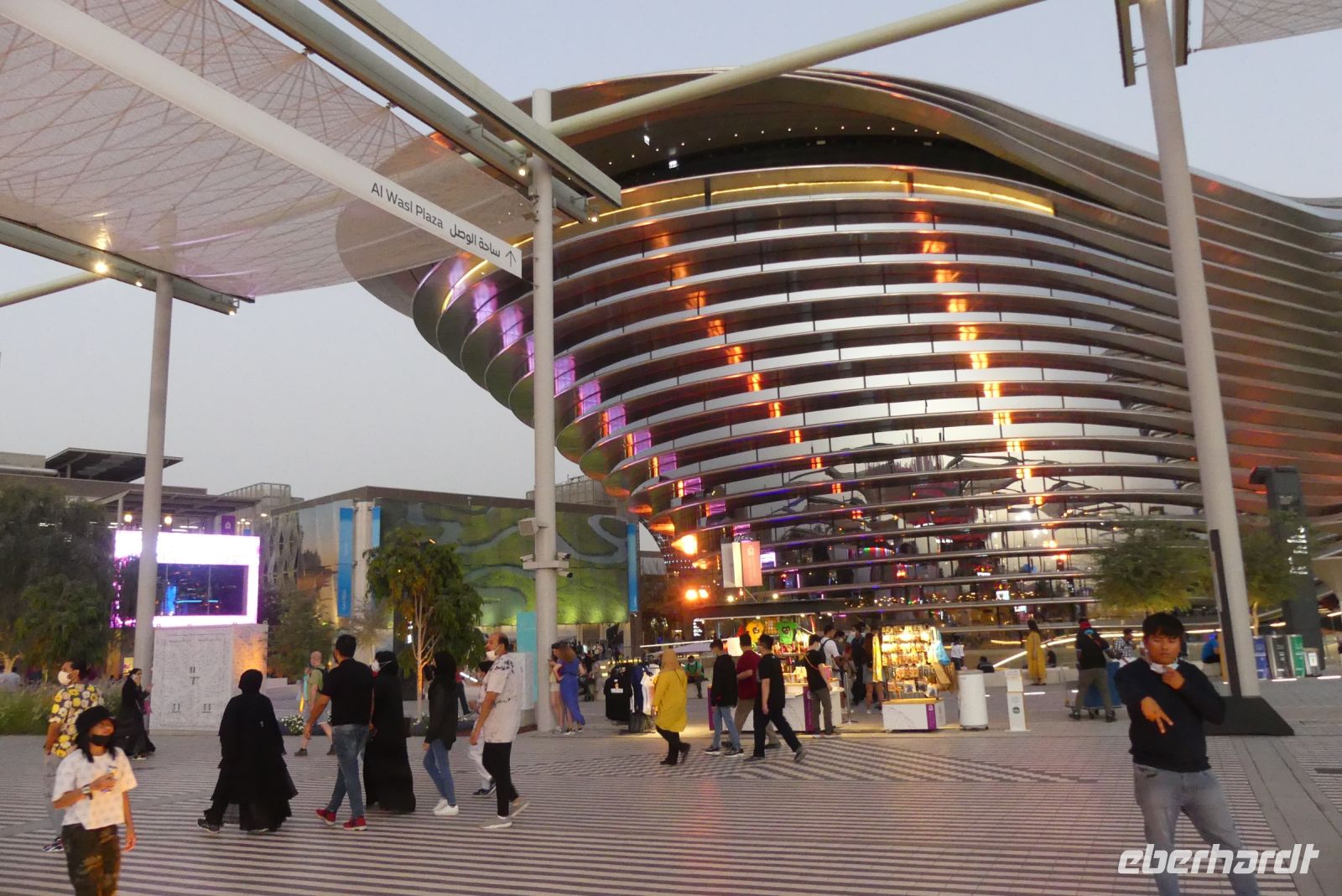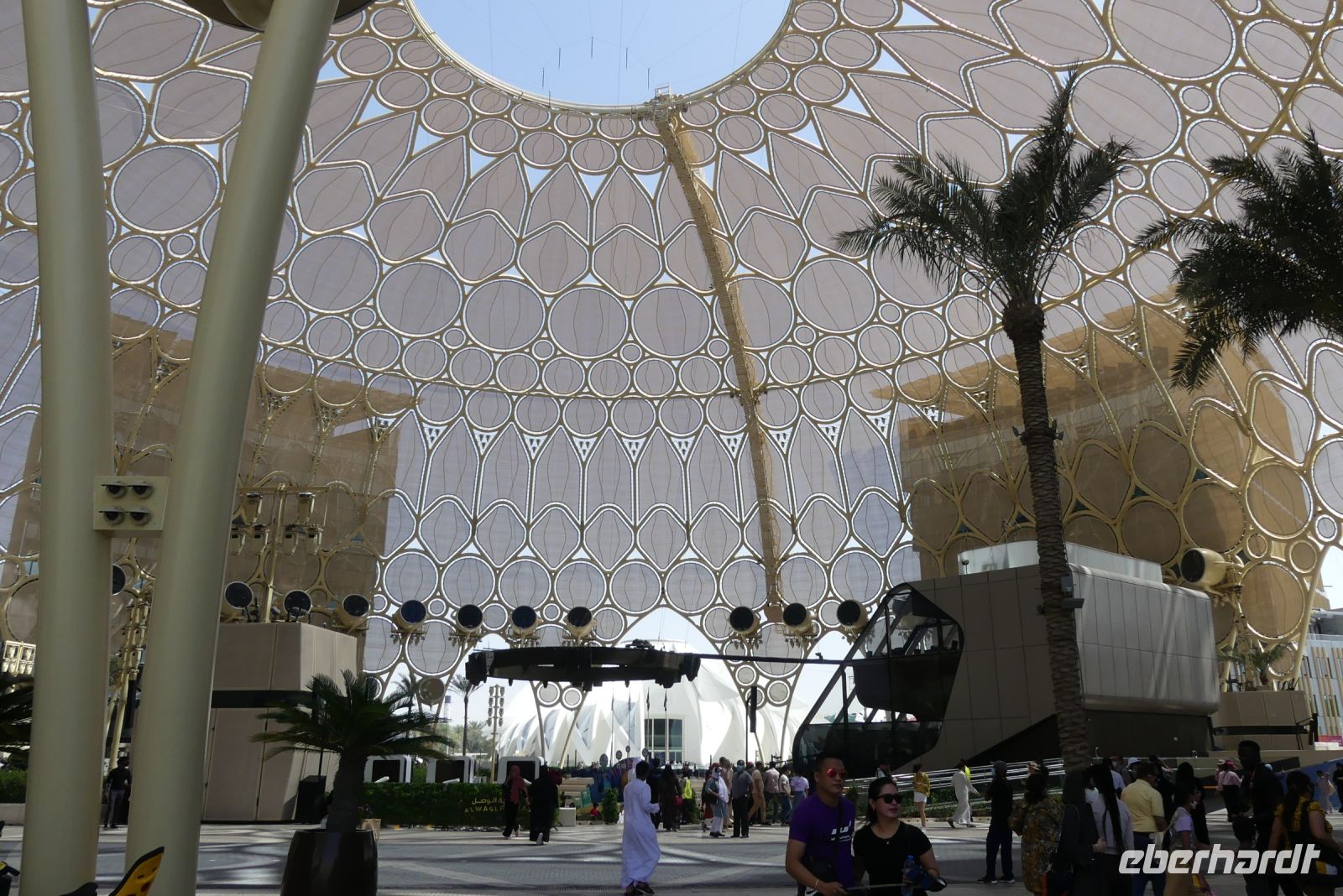 Am Abend gehe ich zum zentralen Kuppelgebäude, dem „Al Wasl Dome“, wo jeden Abend wechselnde Shows aufgeführt werden. „Al Wasl“ war der alte Name Dubais und bedeutet im Arabischen „Verbindung“, „Kontakt“. So ist „Al Wasl“ im Kontext der EXPO das Bindeglied, welches die drei Themenfelder im Zentrum der Ausstellung zusammenführt und miteinander verbindet. Das Design des Al Wasl Domes knüpft an die Form des EXPO-Logos an. Das Logo wiederrum wurde inspiriert durch einen Ausgrabungsfund in Form eines goldenen Rings, welcher aus Kügelchen geschmiedet ist (siehe Vision Pavillon). Die Kuppel des Al Wasl Dome hat einen Durchmesser von 130 Metern und eine Höhe von rund 67 Metern. Sie wird von einem Stoffdach umspannt. Die Stoffbespannung der Kuppel bietet einen riesigen 360-Grad-Bildschirm für die abendlichen Shows.